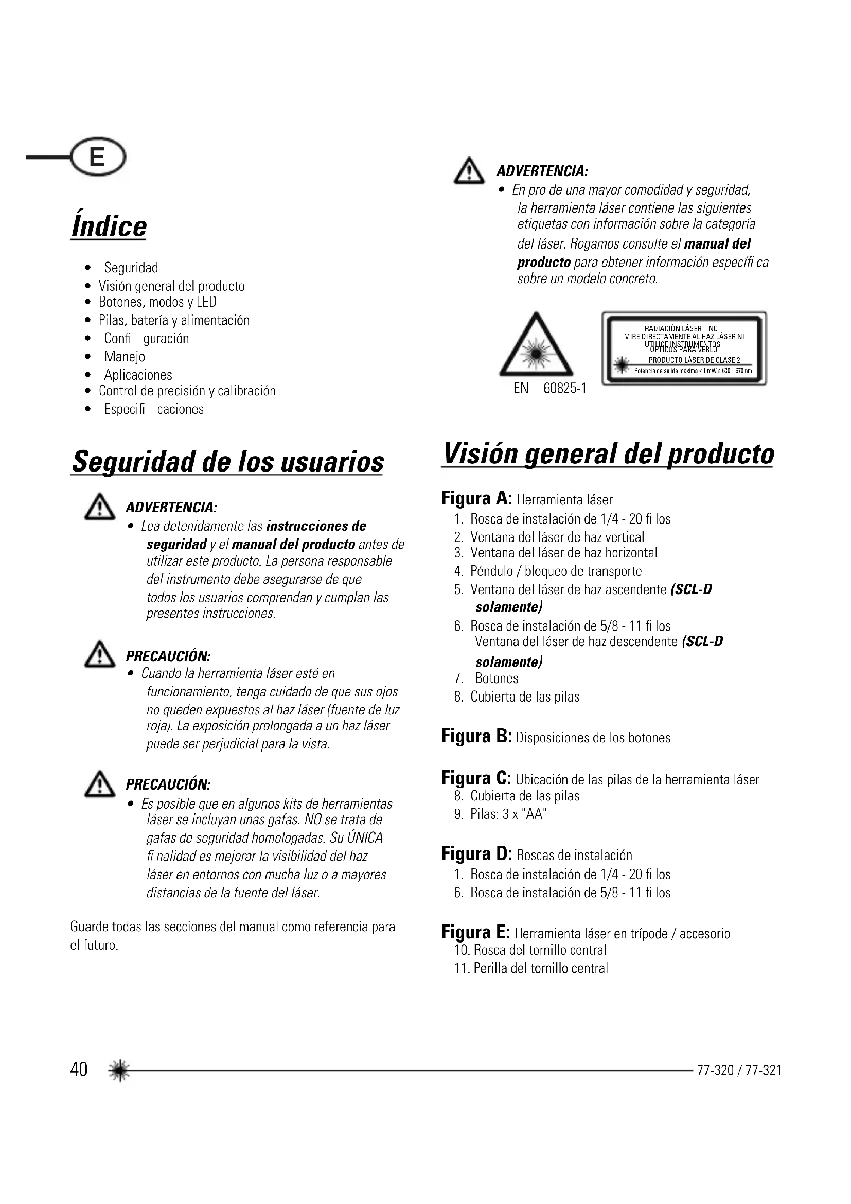 - 1,5 mm ≤ 2,0 mm (VERDADERO, la herramienta está calibrada)46 77-320 / 77-321 Especifi caciones Herramienta láser SCL SCL-D Precisión de la nivelación: ≤ 3 mm / 15 m Precisión horizontal / vertical ≤ 3 mm / 15 m Precisión del haz ascendente: ≤ 3 mm / 15 m Precisión del haz descendente: ≤ 6 mm / 15 m Rango de compensación: Autonivelación ± 4° Distancia de trabajo: Línea: ≥ 10 m ≥ 15 m con el detector de láser: ≥ 25 m ≥ 50 m Punto: ≥ 30 m Categoría láser: Categoría 2 (EN60825-1) Longitud de onda láser 635 nm ± 5 nm Tiempo de funcionamiento: ≥ 18 horas (pilas alcalinas) ≥ 10 horas (pilas alcalinas) Alimentación: 3 pilas "AA" Categoría IP: IP54 Gama de temperaturas de funcionamiento: -10 °C a +50 °C Gama de temperaturas de almacenamiento: -25 °C a +70 °C47 77-320 / 77-321 Notas48 77-320 / 77-321 EN 60825-1