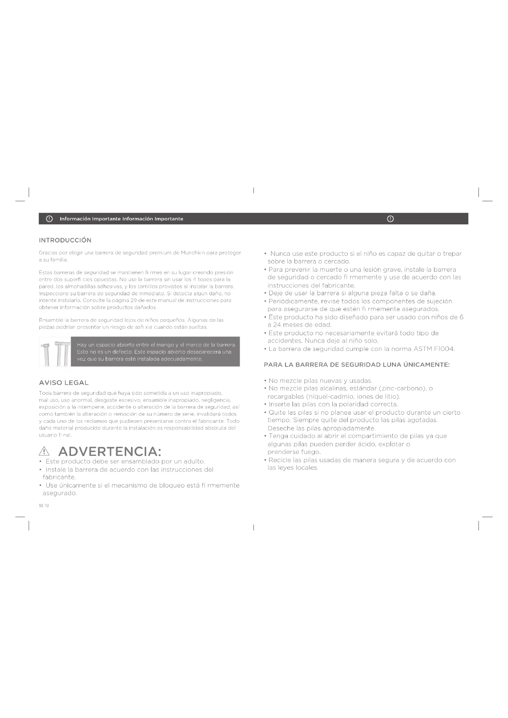 - Copia del recibo Esta información puede enviarse por fax, correo electrónico o por correo postal a Munchkin, Inc., a la atención del departamento de Consumer Relations (Relaciones con los Consumidores). PROBLEMAS ATÍPICOS: En caso de problemas atípicos que requieran una evaluación física, Munchkin, Inc le pedirá que devuelva su barrera al departamento de Aseguramiento de Calidad. Munchkin, Inc. lo compensará por los costos de envío con un regalo de cortesía por un valor equivalente al gasto incurrido por enviar el producto. Por otro lado, Munchkin, Inc., a su entera discreción, podrá emitir una etiqueta de retorno de UPS para acelerar el recibo del producto defectuoso para su evaluación. Servicio Al Cliente Modo De Uso30 31 Servicio Al Cliente CONTÁCTENOS Si tiene alguna pregunta acerca de la instalación de su barrera, o si necesita extensiones adicionales o piezas de repuesto, o desea enviarnos su opinión o comentarios, comuníquese con nuestro equipo de Satisfacción del Cliente al 800-344-2229 entre las 8:00 am y las 5:00 pm PST (Hora Estándar del Pacífico) lunes a viernes o visite nuestra página web en www.munchkin.com B. Condiciones que anulan la garantía limitada de un año de Munchkin, Inc. IPOLÍTICA: La garantía limitada de un año de Munchkin, Inc. no cubre defectos causados por uso indebido, mal uso, uso anormal, desgaste excesivo, ensamble inapropiado, negligencia, exposición a la intemperie, alteración o accidente. Nota importante: Si el código de lote de la barrera de seguridad fue alterado o removido, todos y cada uno de los reclamos que pudiesen presentarse contra el fabricante serán nulos. C. Reembolso al consumidor: Munchkin, Inc. no otorga reintegros en concepto de resarcimiento por barreras de seguridad defectuosas o no conformes. Asimismo, Munchkin, Inc. no ofrece dinero en efectivo a cambio de productos devueltos que hayan sido comprados a través de cualquiera de los sitios web de barreras de seguridad de Munchkin, Inc. Excepción: Munchkin, Inc. otorgará reintegros en efectivo por compras realizadas a través de cualquiera de los sitios web de barreras de seguridad de Munchkin, Inc. SOLO en caso de un error de envío o procesamiento por parte de Munchkin, Inc. Si tiene preguntas al respecto, comuníquese con el Departamento de Relaciones con los Consumidores al 800-344-2229. FRENCH FRANCÉS FRANÇAIS32 33 Renseignements Importants Renseignements Importants INTRODUCTION AVERTISSEMENTS Nous vous remercions d’avoir fait l’acquisition d’une barrière de sécurité de qualité supérieure de Munchkin, conçue pour protéger votre famille. Ces barrières demeurent en place en créant une tension entre deux surfaces opposées. N’utilisez pas cette barrière en tout lieu sans utiliser les quatre ventouses murales, les patins collants, et vis fournis quel que soit le type d’installation. Veuillez vérifi er immédiatement l’état de votre barrière. Si vous remarquez une pièce endommagée, ne procédez pas à l’installation. Reportez- vous à la page 43 de ce livret d’instructions si votre produit est endommagé. Montez la barrière loin de jeunes enfants. Certaines pièces détachées présentent un risque de suffocation.
