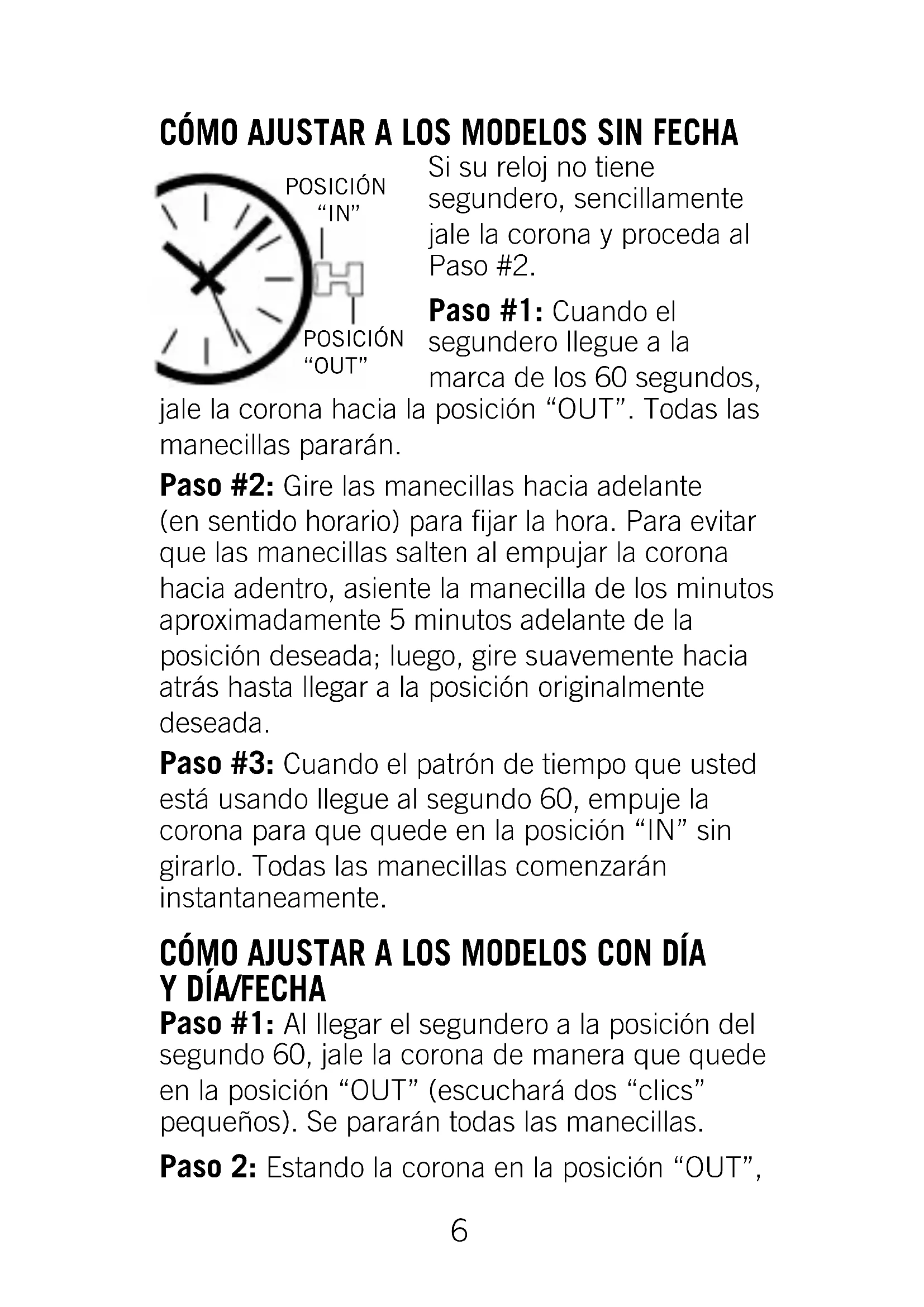Paso #1: Al llegar el segundero a la posición del segundo 60, jale la corona de manera que quede en la posición “OUT” (escuchará dos “clics” pequeños). Se pararán todas las manecillas. Paso 2: Estando la corona en la posición “OUT”, POSICIÓN “IN” POSICIÓN “OUT” 1017WB#11CA:9017/ Rev.#11 3/30/10 10:37 AM Page 6gire las manecillas hacia adelante (en sentido horario) hasta que vea que cambie la fecha (para la fecha únicamente) o que cambie tanto el día como la fecha. Esto establece la medianoche. En el caso que el reloj no disponga de un segundero, simplemente jale la corona y proceda al paso 2. Paso #3: Para la hora de AM, siga girando las manecillas hacia adelante hasta que el minutero quede aproximadamente 5 minutos adlante de la marca del minuto deseada. Para la hora PM, siga el mismo procedimiento, sino que primero deba avanzar las manecillas para que pasen las 12. Nota La fecha avanzará automáticamente al llegar a la medianoche, siempre que la hora AM y PM hayan sido establecidas (pasos 2 y 3). Se ha programado el calendario del reloj para un ciclo de 31 días. Por lo tanto, en el primer día de un mes siguiente a un mes con menos de 31 días, se debe avanzar la fecha manualmente (véase el Paso 5). Paso #4: Cuando el patrón de tiempo que usted está usando llegue al segundo 60, empuje la corona para que quede en la posición “IN” sin girarla. Todas las manecillas comenzarán instantaneamente. Paso #5: Jale la corona a la posición