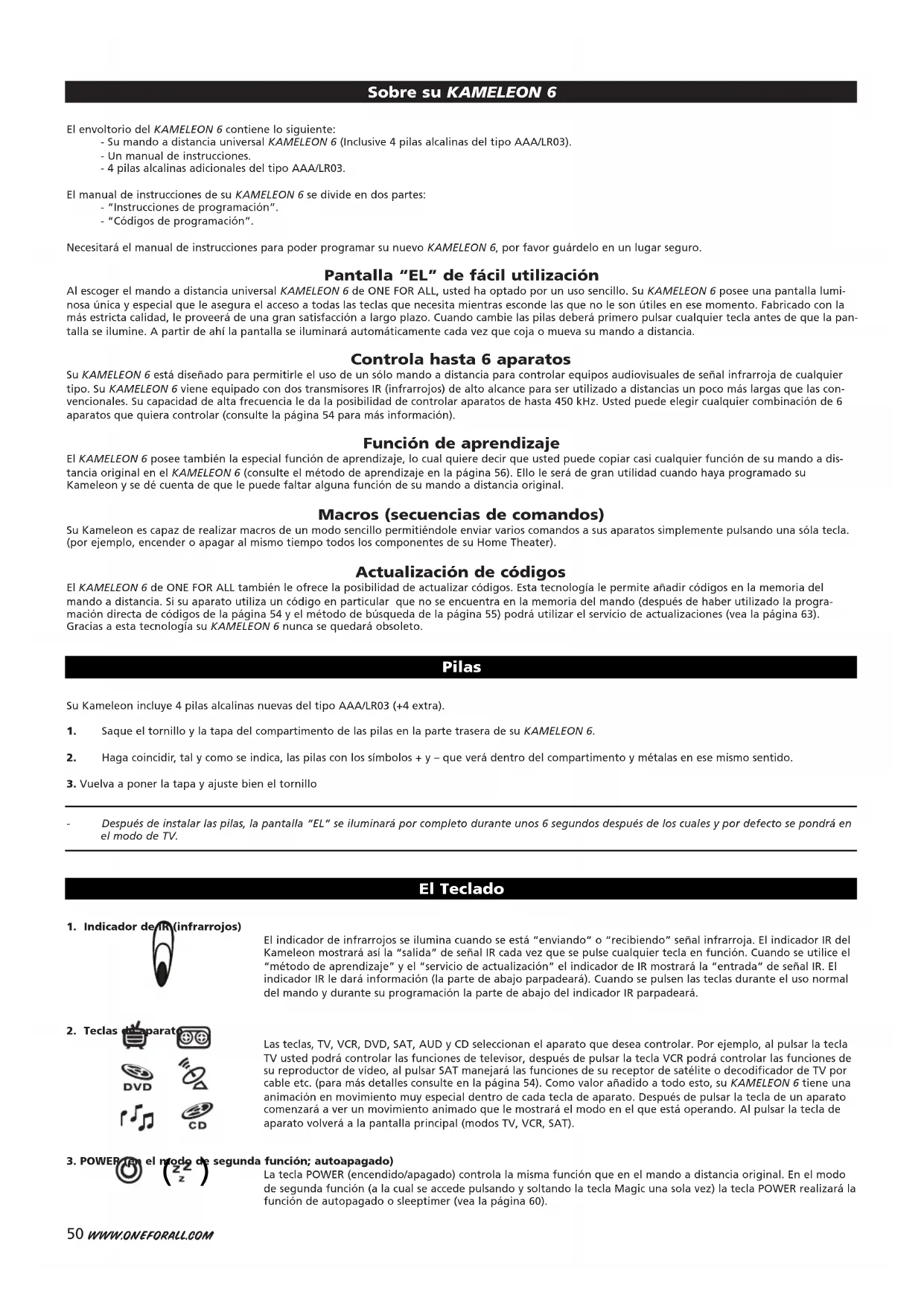 Camelion 20-09-2002 19:11 Pagina 4950 WWW.ONEFORALL.COM El envoltorio del KAMELEON 6 contiene lo siguiente: - Su mando a distancia universal KAMELEON 6 (Inclusive 4 pilas alcalinas del tipo AAA/LR03). - Un manual de instrucciones. - 4 pilas alcalinas adicionales del tipo AAA/LR03. El manual de instrucciones de su KAMELEON 6 se divide en dos partes: - “Instrucciones de programación”. - “Códigos de programación”. Necesitará el manual de instrucciones para poder programar su nuevo KAMELEON 6, por favor guárdelo en un lugar seguro. Pantalla “EL” de fácil utilización Al escoger el mando a distancia universal KAMELEON 6 de ONE FOR ALL, usted ha optado por un uso sencillo. Su KAMELEON 6 posee una pantalla lumi- nosa única y especial que le asegura el acceso a todas las teclas que necesita mientras esconde las que no le son útiles en ese momento. Fabricado con la más estricta calidad, le proveerá de una gran satisfacción a largo plazo. Cuando cambie las pilas deberá primero pulsar cualquier tecla antes de que la pan- talla se ilumine. A partir de ahí la pantalla se iluminará automáticamente cada vez que coja o mueva su mando a distancia. Controla hasta 6 aparatos Su KAMELEON 6 está diseñado para permitirle el uso de un sólo mando a distancia para controlar equipos audiovisuales de señal infrarroja de cualquier tipo. Su KAMELEON 6 viene equipado con dos transmisores IR (infrarrojos) de alto alcance para ser utilizado a distancias un poco más largas que las con- vencionales. Su capacidad de alta frecuencia le da la posibilidad de controlar aparatos de hasta 450 kHz. Usted puede elegir cualquier combinación de 6 aparatos que quiera controlar (consulte la página 54 para más información). Función de aprendizaje El KAMELEON 6 posee también la especial función de aprendizaje, lo cual quiere decir que usted puede copiar casi cualquier función de su mando a dis- tancia original en el KAMELEON 6 (consulte el método de aprendizaje en la página 56). Ello le será de gran utilidad cuando haya programado su Kameleon y se dé cuenta de que le puede faltar alguna función de su mando a distancia original. Macros (secuencias de comandos) Su Kameleon es capaz de realizar macros de un modo sencillo permitiéndole enviar varios comandos a sus aparatos simplemente pulsando una sóla tecla. (por ejemplo, encender o apagar al mismo tiempo todos los componentes de su Home Theater). Actualización de códigos El KAMELEON 6 de ONE FOR ALL también le ofrece la posibilidad de actualizar códigos. Esta tecnología le permite añadir códigos en la memoria del mando a distancia. Si su aparato utiliza un código en particular que no se encuentra en la memoria del mando (después de haber utilizado la progra- mación directa de códigos de la página 54 y el método de búsqueda de la página 55) podrá utilizar el servicio de actualizaciones (vea la página 63). Gracias a esta tecnología su KAMELEON 6 nunca se quedará obsoleto. Su Kameleon incluye 4 pilas alcalinas nuevas del tipo AAA/LR03 (+4 extra).