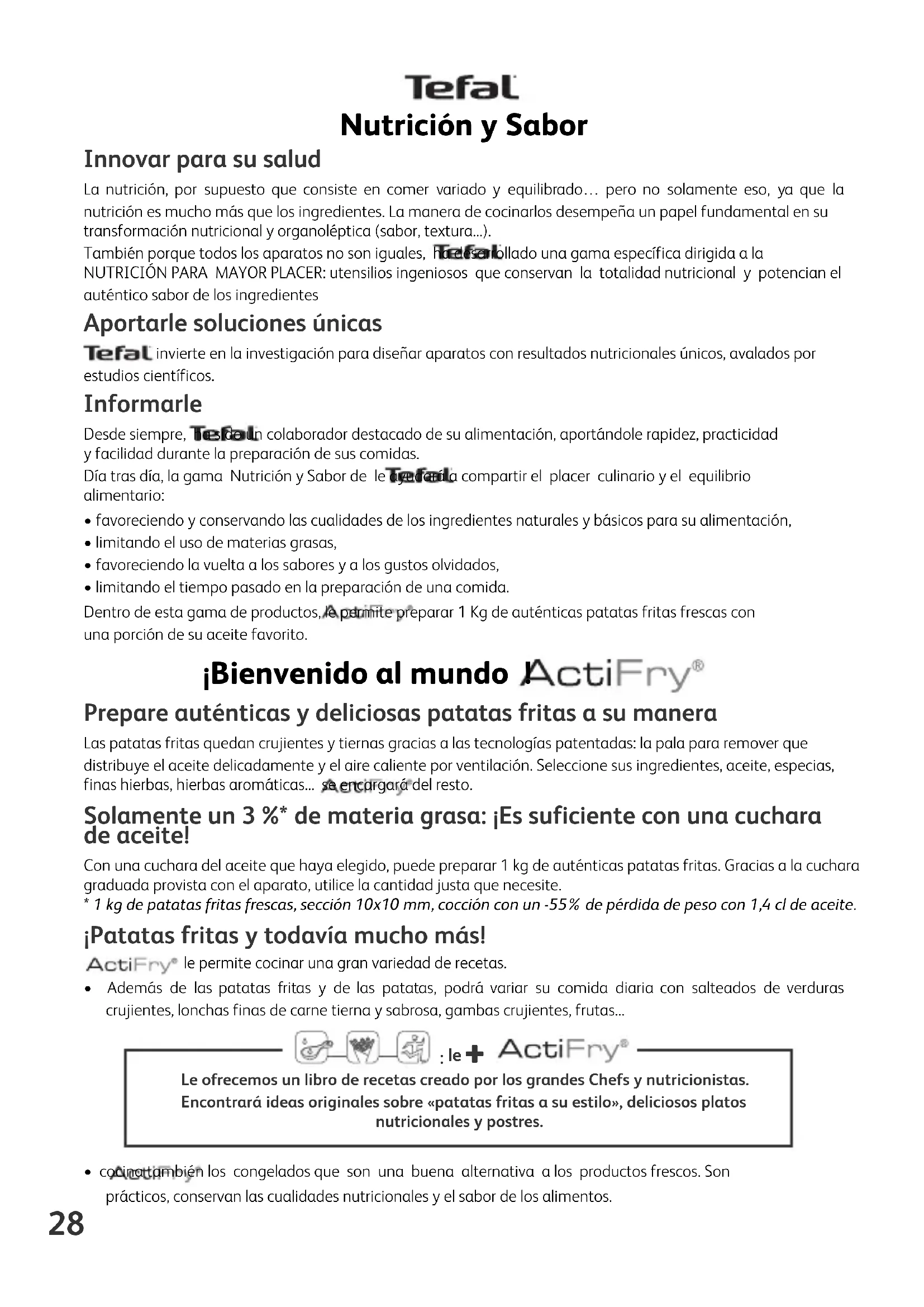 Nutrición y Sabor Innovar para su salud La nutrición, por supuesto que consiste en comer variado y equilibrado… pero no solamente eso, ya que la nutrición es mucho más que los ingredientes. La manera de cocinarlos desempeña un papel fundamental en sutransformación nutricional y organoléptica (sabor, textura...).También porque todos los aparatos no son iguales, ha desarrollado una gama específica dirigida a laNUTRICIÓN PARA MAYOR PLACER: utensilios ingeniosos que conservan la totalidad nutricional y potencian elauténtico sabor de los ingredientes Aportarle soluciones únicas invierte en la investigación para diseñar aparatos con resultados nutricionales únicos, avalados porestudios científicos. Informarle Desde siempre, ha sido un colaborador destacado de su alimentación, aportándole rapidez, practicidady facilidad durante la preparación de sus comidas.Día tras día, la gama Nutrición y Sabor de le ayudará a compartir el placer culinario y el equilibrioalimentario:• favoreciendo y conservando las cualidades de los ingredientes naturales y básicos para su alimentación,• limitando el uso de materias grasas,• favoreciendo la vuelta a los sabores y a los gustos olvidados,• limitando el tiempo pasado en la preparación de una comida.Dentro de esta gama de productos, le permite preparar 1 Kg de auténticas patatas fritas frescas conuna porción de su aceite favorito. ¡Bienvenido al mundo ! Prepare auténticas y deliciosas patatas fritas a su manera Las patatas fritas quedan crujientes y tiernas gracias a las tecnologías patentadas: la pala para remover quedistribuye el aceite delicadamente y el aire caliente por ventilación. Seleccione sus ingredientes, aceite, especias,finas hierbas, hierbas aromáticas... se encargará del resto. Solamente un 3 %* de materia grasa: ¡Es suficiente con una cuchara de aceite! Con una cuchara del aceite que haya elegido, puede preparar 1 kg de auténticas patatas fritas. Gracias a la cucharagraduada provista con el aparato, utilice la cantidad justa que necesite.* 1 kg de patatas fritas frescas, sección 10x10 mm, cocción con un -55% de pérdida de peso con 1,4 cl de aceite. ¡Patatas fritas y todavía mucho más! le permite cocinar una gran variedad de recetas.