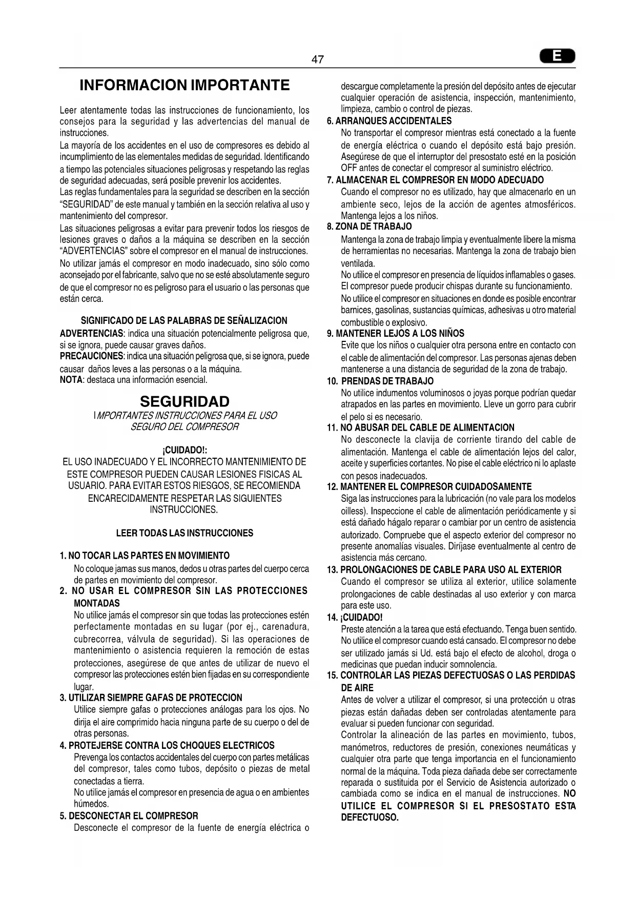 Las reglasfundamentalespara la seguidad se describen en la seccion "SEGURIDAD"de este manual y también en la section relativa al uso y mantenimiento del compresor.