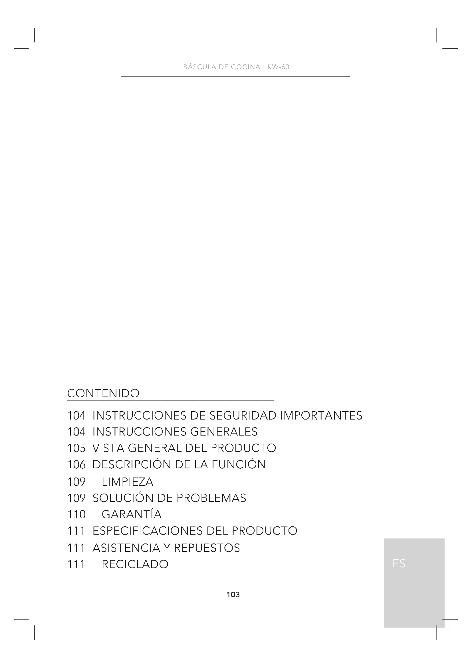 - Mantenga la báscula en una zona fresca y seca. INSTRUCCIONES GENERALES La Wilfa KW-60 es una báscula de cocina diseñada para medir el peso de diferentes objetos y es especialmente adecuada para pesar distintos tipos de alimentos e ingredientes gracias a un revestimiento de un material similar al caucho fácil de limpiar. Su diseño permite limpiar fácilmente el aparato debajo de un grifo de agua. El nivel de resistencia al agua cumple el estándar IPX7.105