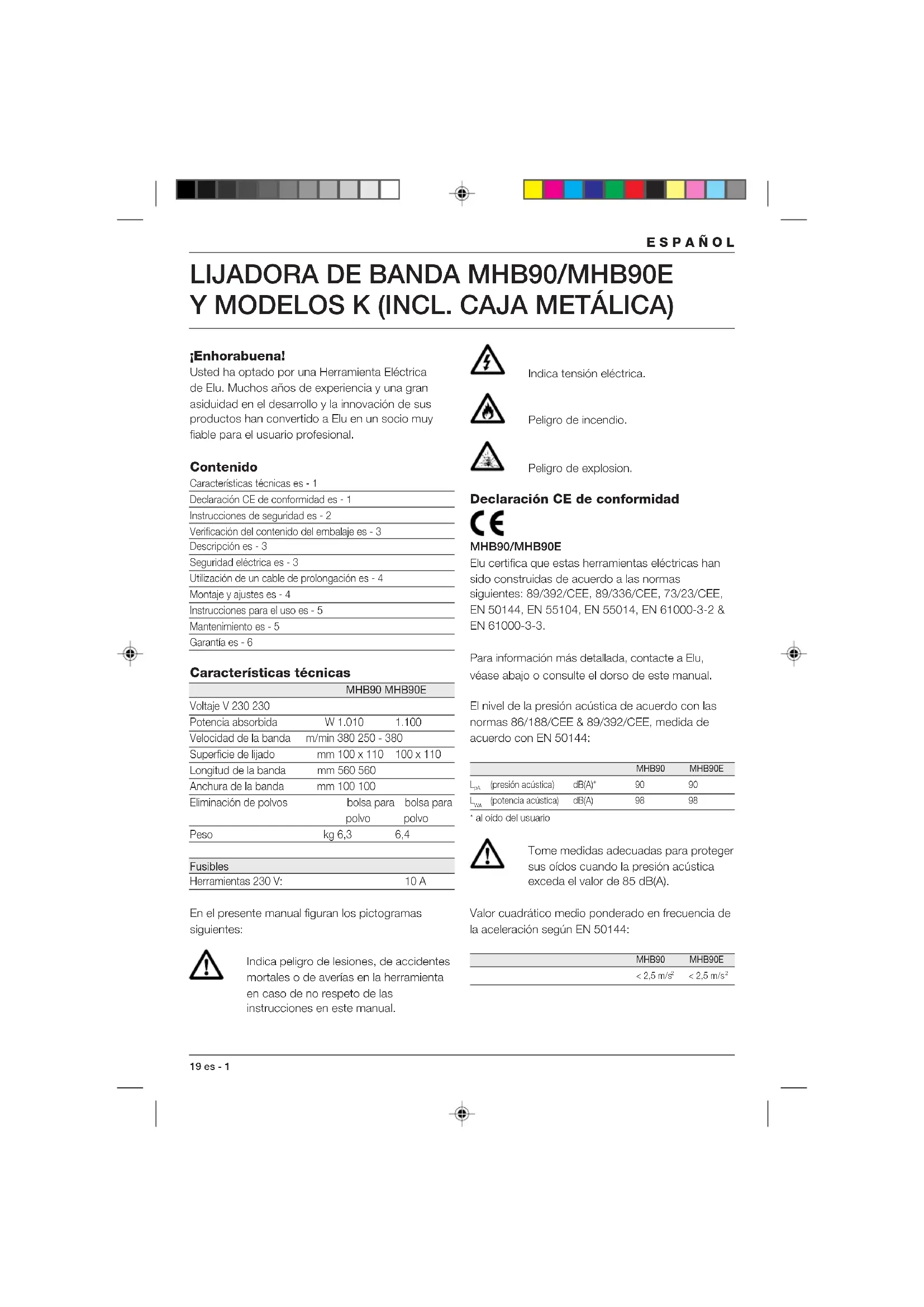 (potencia acústica) dB(A) 98 98* al oído del usuario Tome medidas adecuadas para proteger sus oídos cuando la presión acústica exceda el valor de 85 dB(A). Valor cuadrático medio ponderado en frecuencia de la aceleración según EN 50144: MHB90 MHB90E< 2,5 m/s < 2,5 m/s 2ESPAÑOL es - 2 20 Director Engineering and Product Development Horst Großmann Elu International, Richard-Klinger-Straße 40, D-65510, Idstein, Alemania Instrucciones de seguridad Al utilizar Herramientas Eléctricas, observe las reglas de seguridad en vigor en su país, a fin de reducir el riesgo de descarga eléctrica, de lesiones y de incendio. Lea las instrucciones de seguridad siguientes antes de utilizar este producto. ¡Conserve bien estas instrucciones de seguridad! Generalidades 1 Mantenga limpia el área de trabajo Un área o un banco de trabajo en desorden aumentan el riesgo de accidentes. 2 Tenga en cuenta el entorno del área de trabajo No exponga las Herramientas Eléctricas a la humedad. Procure que el área de trabajo esté bien iluminada. No utilice Herramientas Eléctricas en la proximidad de líquidos o gases inflamables. 3 Protéjase contra las descargas eléctricas Evite el contacto del cuerpo con las superficies conectadas a tierra (p. ej. tuberías, radiadores, cocinas eléctricas y refrigeradores). Para aplicaciones de uso extremas (por ej. humedad elevada formación de polvo metálico, etc.), se puede aumentar la seguridad eléctrica a través de intercalar un transformador de separación o un interruptor de protección de corriente de defecto (FI). 4 ¡Mantenga alejados a los niños! No permita que otras personas toquen la herramienta o el cable de prolongación. En caso de uso por menores de 16 años, se requiere supervisión. 5 Cables de prolongación para el exterior Al trabajar fuera, utilice siempre cables de prolongación destinados al uso exterior y marcados en consecuencia para ello. 6 Guarde las herramientas que no utiliza Las Herramientas Eléctricas que no se utilizan, deben estar guardadas en un lugar seco, cerrado y fuera del alcance de los niños. 7 Vista ropa de trabajo apropiada No lleve vestidos anchos ni joyas. Estos podrían ser atrapados por piezas en movimiento. Para trabajos al exterior, se recomienda llevar guantes de goma y calzado de suela antideslizante. Si tiene el pelo largo, téngalo recogido y cubierto. 8 Lleve gafas de protección Utilice también una mascarilla si el trabajo eje- cutado produce polvo u otras partículas volantes. 9 Respete el nivel máximo de la presión acústica Tome medidas adecuadas para la protección de los oídos cuando la presión acústica exceda el valor de 85 dB(A). 10 Sujete bien la pieza de trabajo Utilice abrazaderas o un torno para sujetar la pieza de trabajo. Es más seguro que sujetarla con la mano y le permite utilizar ambas manos para manejar la herramienta. 11 No alargue demasiado su radio de acción Mantenga un apoyo firme sobre el suelo y conserve el equilibrio en todo momento. 12 Evite un arranque involuntario No mantenga el dedo en el interruptor al transportar la herramienta enchufada. Asegúrese de que el interruptor esté en posición de parada al enchufar la herramienta. 13 Esté siempre alerta Mire lo que está haciendo. Use el sentido común. No maneje la herramienta cuando está cansado. 14 Desenchufe la herramienta Desconecte la herramienta y espere que esté completamente parada antes de dejarla sin vigilar. Desenchufe la herramienta cuando no se utilice y antes de proceder al mantenimiento o sustituir accesorios. 15 Retire las llaves de maniobra Antes de poner la herramienta en marcha, asegúrese de que las llaves y utensilios de reglaje hayan sido retirados. 16 Utilice la herramienta adecuada En este manual, se indica para qué uso está destinada la herramienta. No utilice herramientas o dispositivos acoplables de potencia demasiado débil para ejecutar trabajos pesados. La herramienta funcionará mejor y con mayor seguridad al ser utilizada de acuerdo con sus características técnicas.• No permita que los niños ni las mujeres embarazadas accedan a la zona de trabajo.