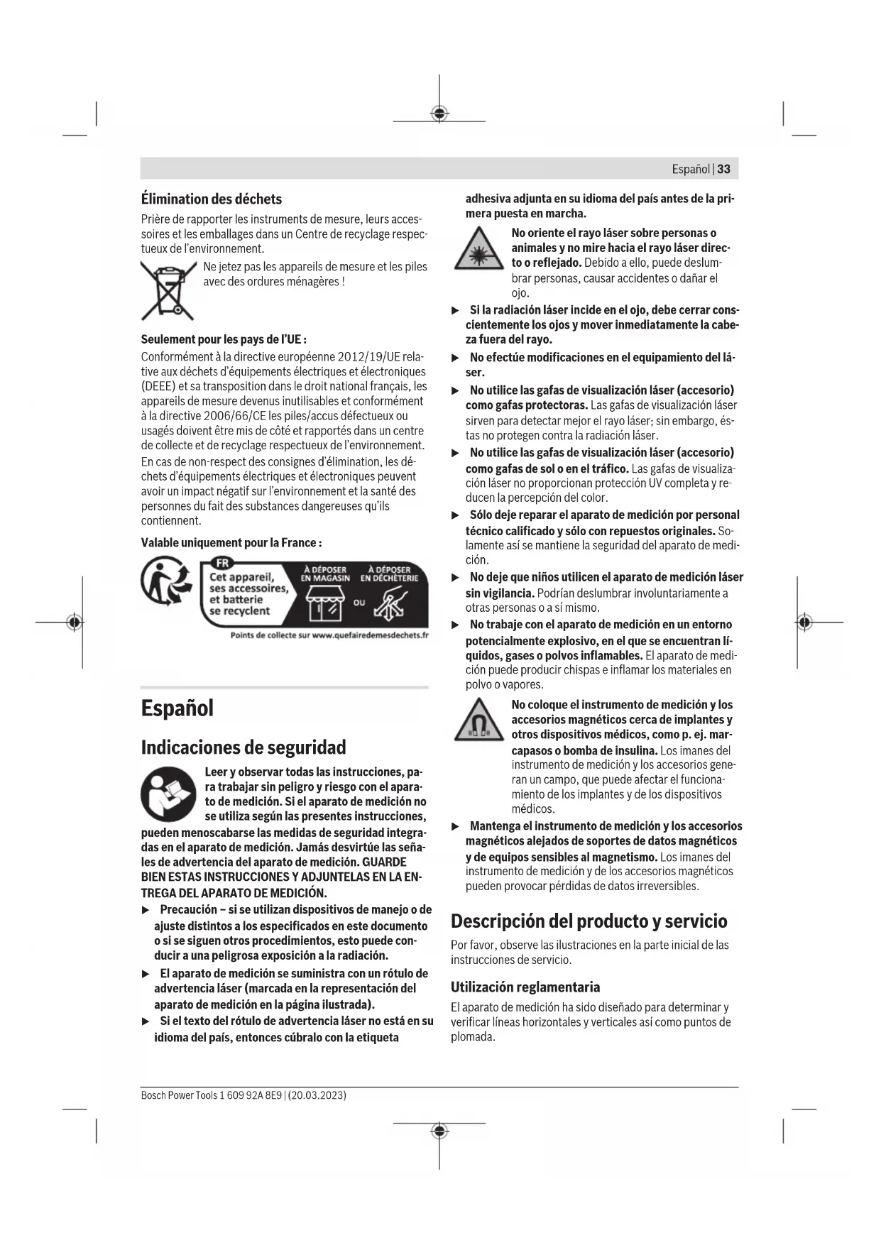 180° – Gire el aparato de medición en 180°. Posiciónelo de ma- nera que el centro del punto láser inferior quede en el ya marcado puntoⅡ. Deje que se nivele el aparato de medi- ción. Marque el centro del punto láser superior (pun- toⅢ). – La diferencia d de ambos puntosⅠ y Ⅲ marcados en el te- cho es la desviación real del aparato de medición de la vertical. Calcule la divergencia máxima admisible como sigue: distancia doble entre piso y techo×0,7mm/m Ejemplo: con una distancia entre piso y techo de 5m, la di- vergencia máxima puede ascender a 2×5m×±0,7mm/m=±7mm. Por lo tanto, los puntos Ⅰ y Ⅲ pueden estar a una distancia de 7mm como máximo. Instrucciones para la operación u Utilice siempre sólo el centro del punto láser o de la lí- nea láser para marcar. El tamaño del punto del láser, o el ancho de la línea láser, varían con la distancia. Trabajos con el trípode (accesorio) Un trípode ofrece una base de medición estable y regulable en la altura. Coloque el aparato de medición con el aloja- miento del trípode de 1/4" (10) sobre la rosca del trípode (23) o de un trípode fotográfico corriente en el comercio. Para la fijación en un trípode de construcción corriente en el comercio utilice el alojamiento del trípode de 5/8" (11). Atornille firmemente el aparato de medición con los tornillos de sujeción del trípode. Nivele el trípode de forma aproximada antes de conectar el aparato de medición. Fijación con el soporte universal (accesorio) (verfiguraG) Con la ayuda del soporte universal(19) puede fijar el apara- to de medición p. ej. en superficies verticales o materiales imantables. El soporte universal es apropiado también para ser utilizado como trípode directamente sobre el suelo, ya que facilita el ajuste de altura del aparato de medición. u Mantenga los dedos alejados de la parte posterior del accesorio magnético al fijar el accesorio a superficies. Debido a la fuerte fuerza de tracción de los imanes, sus dedos pueden quedar aprisionados. Alinee el soporte universal (19) de forma aproximada antes de conectar el aparato de medición. 1 609 92A 8E9 | (20.03.2023) Bosch Power ToolsPortuguês | 41 Aplicación de la tablilla reflectante (ver figuraG) La tablilla reflectante de láser (20) mejora la visibilidad del rayo láser bajo condiciones desfavorables y distancias más grandes. La superficie reflectante de la tablilla(20) permite apreciar mejor el rayo láser y la superficie transparente deja ver el ra- yo láser también por el dorso de la tablilla reflectante de lá- ser. Gafas para láser (accesorio) Las gafas para láser filtran la luz del entorno. Ello permite apreciar con mayor intensidad la luz del láser. u No utilice las gafas de visualización láser (accesorio) como gafas protectoras. Las gafas de visualización láser sirven para detectar mejor el rayo láser; sin embargo, és- tas no protegen contra la radiación láser. u No utilice las gafas de visualización láser (accesorio) como gafas de sol o en el tráfico. Las gafas de visualiza- ción láser no proporcionan protección UV completa y re- ducen la percepción del color. Ejemplos para el trabajo (ver figuras B2–F2, GyH) Ejemplos para la aplicación del aparato de medición los en- contrará en las páginas ilustradas. Mantenimiento y servicio Mantenimiento y limpieza Mantenga limpio siempre el aparato de medición. No sumerja el aparato de medición en agua ni en otros líqui- dos. Limpiar el aparato con un paño húmedo y suave. No utilice ningún detergente o disolvente. Limpie con regularidad sobre todo el área en torno a la aber- tura de salida del láser, cuidando que no queden motas. Servicio técnico y atención al cliente El servicio técnico le asesorará en las consultas que pueda Ud. tener sobre la reparación y mantenimiento de su produc- to, así como sobre piezas de recambio. Las representacio- nes gráficas tridimensionales e informaciones de repuestos se encuentran también bajo: www.bosch-pt.com El equipo asesor de aplicaciones de Bosch le ayuda gustosa- mente en caso de preguntas sobre nuestros productos y sus accesorios. Para cualquier consulta o pedido de piezas de repuesto es imprescindible indicar el nº de artículo de 10dígitos que fi- gura en la placa de características del producto. España Robert Bosch España S.L.U. Departamento de ventas Herramientas Eléctricas C/Hermanos García Noblejas, 19 28037 Madrid Para efectuar su pedido online de recambios o pedir la reco- gida para la reparación de su máquina, entre en la página www.herramientasbosch.net. Tel. Asesoramiento al cliente: 902 531 553 Fax: 902 531554 México Robert Bosch S. de R.L. de C.V. Calle Robert Bosch No. 405 C.P. 50071 Zona Industrial, Toluca - Estado de México Tel.: (52) 55 528430-62 Tel.: 800 6271286 www.boschherramientas.com.mx Direcciones de servicio adicionales se encuentran bajo: www.bosch-pt.com/serviceaddresses Eliminación Recomendamos que los aparatos de medición, los acceso- rios y los embalajes sean sometidos a un proceso de recupe- ración que respete el medio ambiente. ¡No arroje los aparatos de medición y las pilas a la basura! Sólo para los países de laUE: De acuerdo con la directiva europea 2012/19/UE sobre apa- ratos eléctricos y electrónicos de desecho y su realización en la legislación nacional y la directiva europea 2006/66/CE, los aparatos de medición que ya no son aptos para su uso y respectivamente los acumuladores/las pilas defectuosos o vacíos deberán ser recogidos por separado y reciclados de manera respetuosa con el medio ambiente. En el caso de una eliminación inadecuada, los aparatos eléc- tricos y electrónicos pueden tener efectos nocivos para el medio ambiente y la salud humana debido a la posible pre- sencia de sustancias peligrosas. El símbolo es solamente válido, si también se encuentra sobre la placa de características del producto/fabricado. Português Instruções de segurança Devem ser lidas 