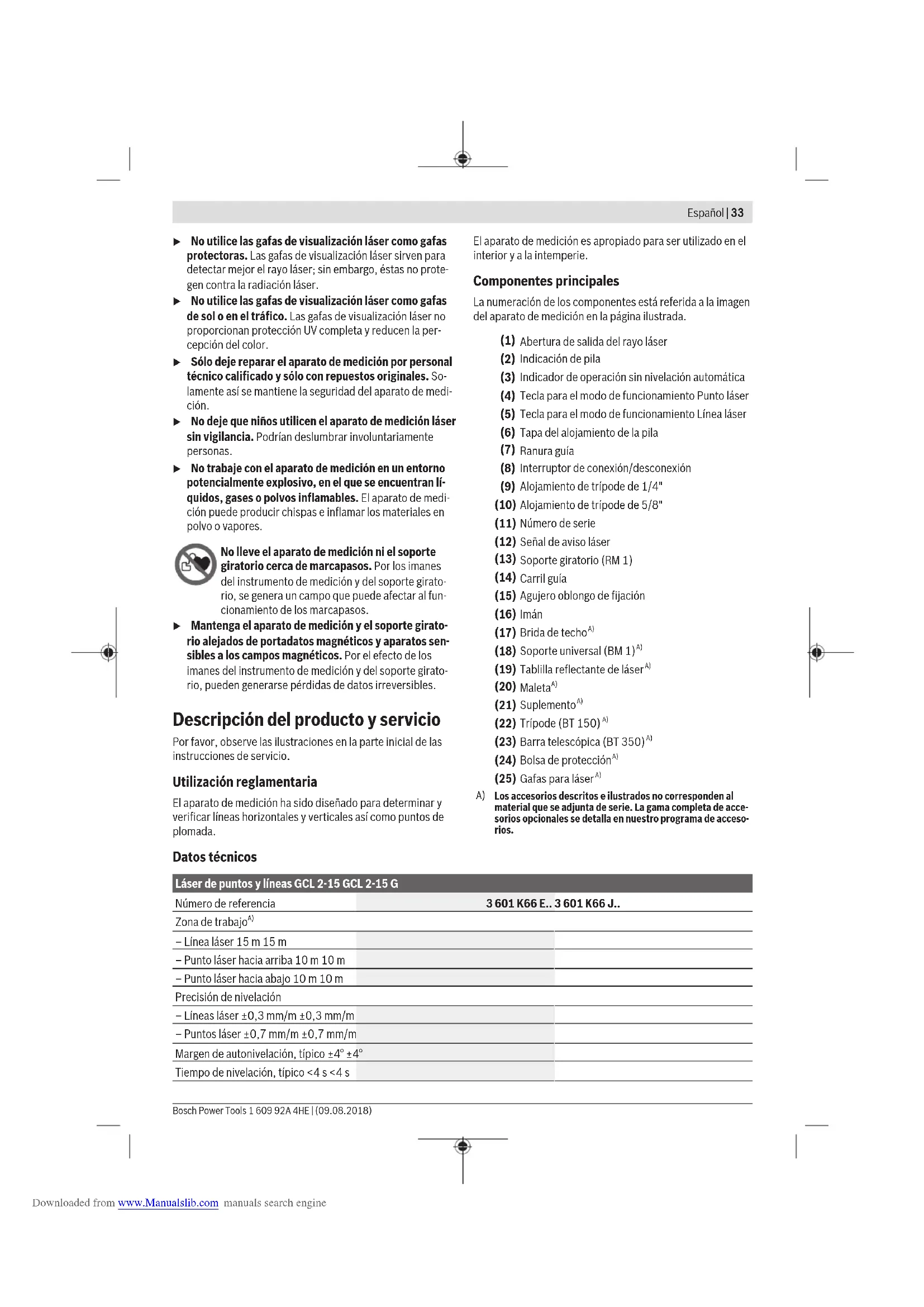 – Línea láser 15m 15m – Punto láser hacia arriba 10m 10m – Punto láser hacia abajo 10m 10m Precisión de nivelación – Líneas láser ±0,3 mm/m ±0,3 mm/m – Puntos láser ±0,7 mm/m ±0,7 mm/m Margen de autonivelación, típico ±4° ±4° Tiempo de nivelación, típico <4 s <4 s Español | 33 Bosch Power Tools 1 609 92A 4HE | (09.08.2018) Downloaded from www.Manualslib.com manuals search engine34 | Español 1 609 92A 4HE | (09.08.2018) Bosch Power Tools Láser de puntos y líneas GCL 2-15 GCL 2-15 G temperatura de servicio –10°C...+50°C –10°C...+50°C Temperatura de almacenamiento –20 °C...+70 °C –20 °C...+70 °C Altura de aplicación máx. sobre la altu- ra de referencia 2000 m 2000 m Humedad relativa del aire máx. 90 % 90 % Grado de contaminación según IEC61010-1