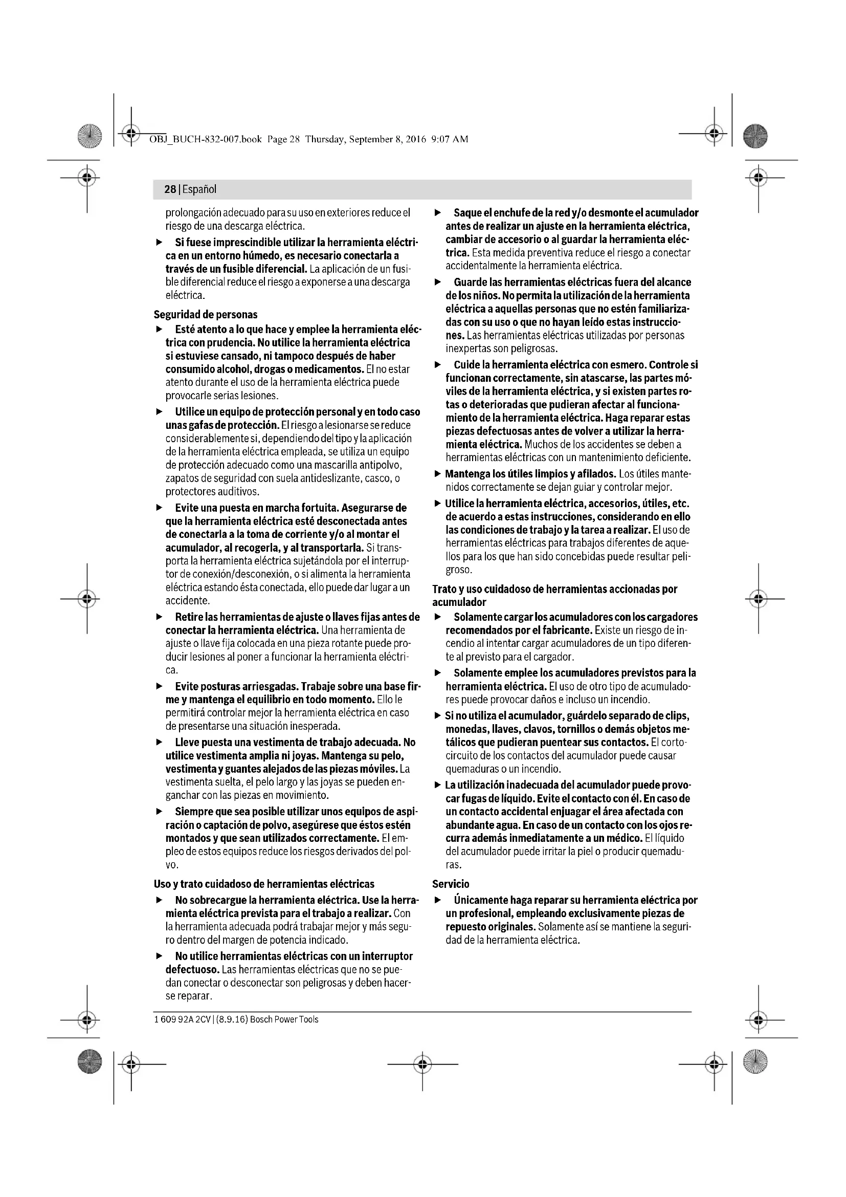 OBJ_BUCH-832-007.book Page 26 Thursday, September 8, 2016 9:07 AMEspañol | 27 Bosch Power Tools 1 609 92A 2CV | (8.9.16) Suisse Passez votre commande de pièces détachées directement en ligne sur notre site www.bosch-pt.com/ch/fr. Tel. : (044) 8471512 Fax : (044) 8471552 E-Mail : Aftersales.Service@de.bosch.com Transport Les batteries Lithium-ion sont soumises aux règlements de transport des matières dangereuses. L’utilisateur peut trans- porter les batteries par voie routière sans mesures supplé- mentaires. Lors d’une expédition par tiers (par ex. : transport aérien ou entreprise de transport), les mesures à prendre spécifiques à l’emballage et au marquage doivent être observées. Dans un tel cas, lors de la préparation de l’envoi, il est impératif de faire appel à un expert en transport des matières dange- reuses. N’expédiez les accus que si le carter n’est pas endommagé. Recouvrez les contacts non protégés et emballez l’accu de manière à ce qu’il ne puisse pas se déplacer dans l’emballage. Veuillez également respecter les règlementations supplémen- taires éventuellement en vigueur. Élimination des déchets Les outils électroportatifs et les accus, ainsi que leurs accessoires et emballages, doivent pouvoir suivre chacun une voie de recyclage appropriée. Ne jetez pas les outils électroportatifs et les accus/piles avec les ordures ménagères ! Seulement pour les pays de l’Union Européenne : Conformément à la directive européenne 2012/19/UE, les équipements électriques dont on ne peut plus se servir, et conformé- ment à la directive européenne 2006/66/CE, les accus/piles usés ou dé- fectueux doivent être isolés et suivre une voie de recyclage appropriée. Les batteries/piles dont on ne peut plus se servir peuvent être déposées directement auprès de : Suisse Batrec AG 3752 Wimmis BE Batteries/piles : Lithium ion : Respectez les indications données dans le chapitre « Transport », page 27. Sous réserve de modifications. Español Instrucciones de seguridad Advertencias de peligro generales para herra- mientas eléctricas Lea íntegramente estas adverten- cias de peligro e instrucciones. En caso de no atenerse a las advertencias de peligro e instruccio- nes siguientes, ello puede ocasionar una descarga eléctrica, un incendio y/o lesión grave. Guardar todas las advertencias de peligro e instrucciones para futuras consultas. El término herramienta eléctrica empleado en las siguientes advertencias de peligro se refiere a herramientas eléctricas de conexión a la red (con cable de red) y a herramientas eléc- tricas accionadas por acumulador (o sea, sin cable de red). Seguridad del puesto de trabajo Mantenga limpio y bien iluminado su puesto de trabajo. El desorden o una iluminación deficiente en las áreas de trabajo pueden provocar accidentes. No utilice la herramienta eléctrica en un entorno con peligro de explosión, en el que se encuentren combus- tibles líquidos, gases o material en polvo. Las herra- mientas eléctricas producen chispas que pueden llegar a inflamar los materiales en polvo o vapores. Mantenga alejados a los niños y otras personas de su puesto de trabajo al emplear la herramienta eléctrica. Una distracción le puede hacer perder el control sobre la herramienta eléctrica. Seguridad eléctrica El enchufe de la herramienta eléctrica debe correspon- der a la toma de corriente utilizada. No es admisible modificar el enchufe en forma alguna. No emplear adaptadores en herramientas eléctricas dotadas con una toma de tierra. Los enchufes sin modificar adecuados a las respectivas tomas de corriente reducen el riesgo de una descarga eléctrica. Evite que su cuerpo toque partes conectadas a tierra como tuberías, radiadores, cocinas y refrigeradores. El riesgo a quedar expuesto a una sacudida eléctrica es ma- yor si su cuerpo tiene contacto con tierra. No exponga la herramienta eléctrica a la lluvia y evite que penetren líquidos en su interior. Existe el peligro de recibir una descarga eléctrica si penetran ciertos líquidos en la herramienta eléctrica. No utilice el cable de red para transportar o colgar la herramienta eléctrica, ni tire de él para sacar el enchu- fe de la toma de corriente. Mantenga el cable de red alejado del calor, aceite, esquinas cortantes o piezas móviles. Los cables de red dañados o enredados pueden provocar una descarga eléctrica. Al trabajar con la herramienta eléctrica a la intemperie utilice solamente cables de prolongación apropiados para su uso en exteriores. La utilización de un cable de ADVERTENCIA OBJ_BUCH-832-007.book Page 27 Thursday, September 8, 2016 9:07 AM28 | Español 1 609 92A 2CV | (8.9.16) Bosch Power Tools prolongación adecuado para su uso en exteriores reduce el riesgo de una descarga eléctrica. Si fuese imprescindible utilizar la herramienta eléctri- ca en un entorno húmedo, es necesario conectarla a través de un fusible diferencial. La aplicación de un fusi- ble diferencial reduce el riesgo a exponerse a una descarga eléctrica. Seguridad de personas Esté atento a lo que hace y emplee la herramienta eléc- trica con prudencia. No utilice la herramienta eléctrica si estuviese cansado, ni tampoco después de haber consumido alcohol, drogas o medicamentos. El no estar atento durante el uso de la herramienta eléctrica puede provocarle serias lesiones. Utilice un equipo de protección personal y en todo caso unas gafas de protección. El riesgo a lesionarse se reduce considerablemente si, dependiendo del tipo y la aplicación de la herramienta eléctrica empleada, se utiliza un equipo de protección adecuado como una mascarilla antipolvo, zapatos de seguridad con suela antideslizante, casco, o protectores auditivos. Evite una puesta en marcha fortuita. Asegurarse de que la herramienta eléctrica esté desconectada antes de conectarla a la toma de corriente y/o al montar el acumulador, al recogerla, y al transportarla. Si trans- porta la he