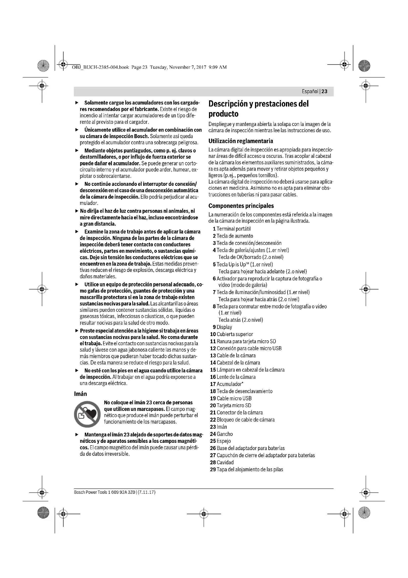 Servicio con adaptador para baterías (no retirable) (3 601 B41 270) (ver figura C) Para abrir la tapa del compartimento para baterías 29 pre- sione los pulsadores de desbloqueo 18 y extraiga la tapa. Respete la polaridad al insertar las pilas. Vuelva a colocar la tapa del compartimento para baterías 29 hasta que note cómo encaja. Siempre sustituya todas las pilas al mismo tiempo. Utilice pilas del mismo fabricante e igual capacidad. Retire las pilas de la cámara de inspección, si no va a utilizarla durante un periodo largo. Si se almacena du- rante mucho tiempo, las pilas pueden corroerse y autodes- cargarse. Estado de carga de acumulador/batería En caso de un bajo estado de carga del acumulador/las pilas aparece primero el símbolo en el display. Cuando el sím- bolo de pila está vacío, tiene que cambiar el acumulador/las pilas o cargar el acumulador; ya no se pueden realizar inspec- ciones. Conexión del cable de la cámara (ver figura D) Para el funcionamiento de la cámara de inspección es necesa- rio conectar el cable de la cámara 13 al terminal portátil 1. Inserte el enchufe del cable de la cámara 13 en la posición co- rrecta sobre el conector de la cámara 21, hasta que encastre. Desmontar el cable de la cámara (ver figura E) Para quitar el cable de la cámara 13, comprima la retención 22 y retire el enchufe del aparato portátil 1. Montaje del espejo, imán o gancho (ver figura F) El espejo 25, el imán 23 y el gancho 24 son elementos auxilia- res que pueden acoplarse al cabezal de la cámara 14. Presione hasta el tope en la ranura del cabezal de la cámara 14 uno de los tres elementos auxiliares, según figura. Observación: El imán 23 y el gancho 24 solamente son apro- piados para mover y retirar objetos pequeños y ligeros que no requieran aplicar gran fuerza. En caso de aplicar una fuerza excesiva puede llegar a deteriorarse la cámara de inspección o el elemento auxiliar. Operación Proteja el aparato portátil 1 y el acumulador 17 ante la humedad y la irradiación solar directa. En caso de un montaje correcto, el cable de la cámara y el cabezal de cá- mara son estancos al agua. No obstante, el aparato portátil y el acumulador no están protegidos contra el agua; en ca- so del contacto con el agua existe el riesgo de una descarga eléctrica o daño. No exponga la cámara de inspección ni a temperaturas extremas ni a cambios bruscos de temperatura. No la deje, p.ej., en el coche durante un largo tiempo. Si la cá- mara de inspección ha sufrido un cambio fuerte de tempe- ratura, antes de ponerla en servicio, esperar primero a que se atempere. No utilice la cámara de inspección si estuviese empaña- da la lente del cabezal de la cámara 14. No conecte la cámara de inspección hasta que se haya evaporado la humedad. En caso contrario podría deteriorarse la cámara de inspección. La lámpara conectada 15 se puede calentar durante el servicio. No toque la lámpara para evitar quemaduras. Puesta en marcha Colocar la tarjeta micro SD Abra la cubierta superior 10 e introduzca la tarjeta micro SD 20 hasta el tope en la ranura 11. Cierre de nuevo la cubierta superior. Conexión/desconexión Para conectar la cámara de inspección pulse la tecla de co- nexión/desconexión 3. En el display 9 se visualiza por breve tiempo la pantalla de inicio. Para desconectar la cámara de inspección pulse nuevamente la tecla de conexión/desconexión 3. Si no se pulsa ninguna tecla en la cámara de inspección, se desconecta automáticamente tras el transcurso de la dura- ción ajustada (k). Ajuste de la lámpara en el cabezal de la cámara Para aclarar la imagen de la cámara, puede conectar la lám- para 15 en el cabezal de cámara y regular la luminosidad. La luminosidad se puede ajustar a 4 niveles (0 %, 25 %, 50 %, 100 %). OBJ_BUCH-2385-004.book Page 25 Tuesday, November 7, 2017 9:09 AM26 | Español 1 609 92A 3Z0 | (7.11.17) Bosch Power Tools Para conectar la lámpara de la cámara 15 y para amplificar la luminosidad, oprima la tecla 7 tantas veces, hasta que se alcance la luminosidad deseada. No mire directamente hacia la lámpara 15 ni tampoco la dirija contra otras personas. La luz de la lámpara pue- de deslumbrar la vista. Para reducir la luminosidad y para desconectar la lámpara de la cámara 15, oprima la tecla 7 tantas veces, hasta que se al- cance la luminosidad deseada o se ha apagado la lámpara. Ampliar la imagen en el display (Zoom) Oprimiendo brevemente la tecla 2 puede aumentar la imagen en el display 1,5 veces o 2 veces. Girar la imagen en el display (Up is Up™) (ver figura G) Con la tecla 5 puede girar la imagen, de modo que “arriba” también se indica en la parte de arriba del display. Observación: Funcionamiento limitado con espejo montado 25 y/o con alineación vertical del cable de la cámara 13. Elaborar fotografías/vídeos Con la tecla 8 puede conmutar entre modo de fotografía o mo- do de vídeo. El actual modo de grabación ajustado a se indica en la barra de estado b. Con la tecla 6 se toma una fotografía en el correspondiente modo o se inicia y finaliza una captura de vídeo. Modo de galería/modo de ajustes Presionando la tecla 4 se le asigna a las teclas 8, 7, 5 y 4 otra función (según la representación en el display de arriba) (2.o nivel). Utilice estas teclas según la representación en el display. Presionando brevemente la tecla 4 se abre el modo de galería. Presionando la tecla 4 puede ver la imagen en el pleno tamaño de la pantalla y presionando la tecla 6 reproducir un vídeo. Presionando brevemente la tecla 4 se abre el modo de ajus- tes. Los siguientes ajustes son posibles: – Reproducción en color (punto rojo)/reproducción en blanco y negro (punto verde) (h) – Luminosidad del display (i) –Fecha/hora (j) – Función Auto-Off: duración de la inactividad de la cámara de inspección, tras la cual se desconecta (k) – Duración de iluminación del display (l) – Ocupación de la memoria/formateo de la tarjet