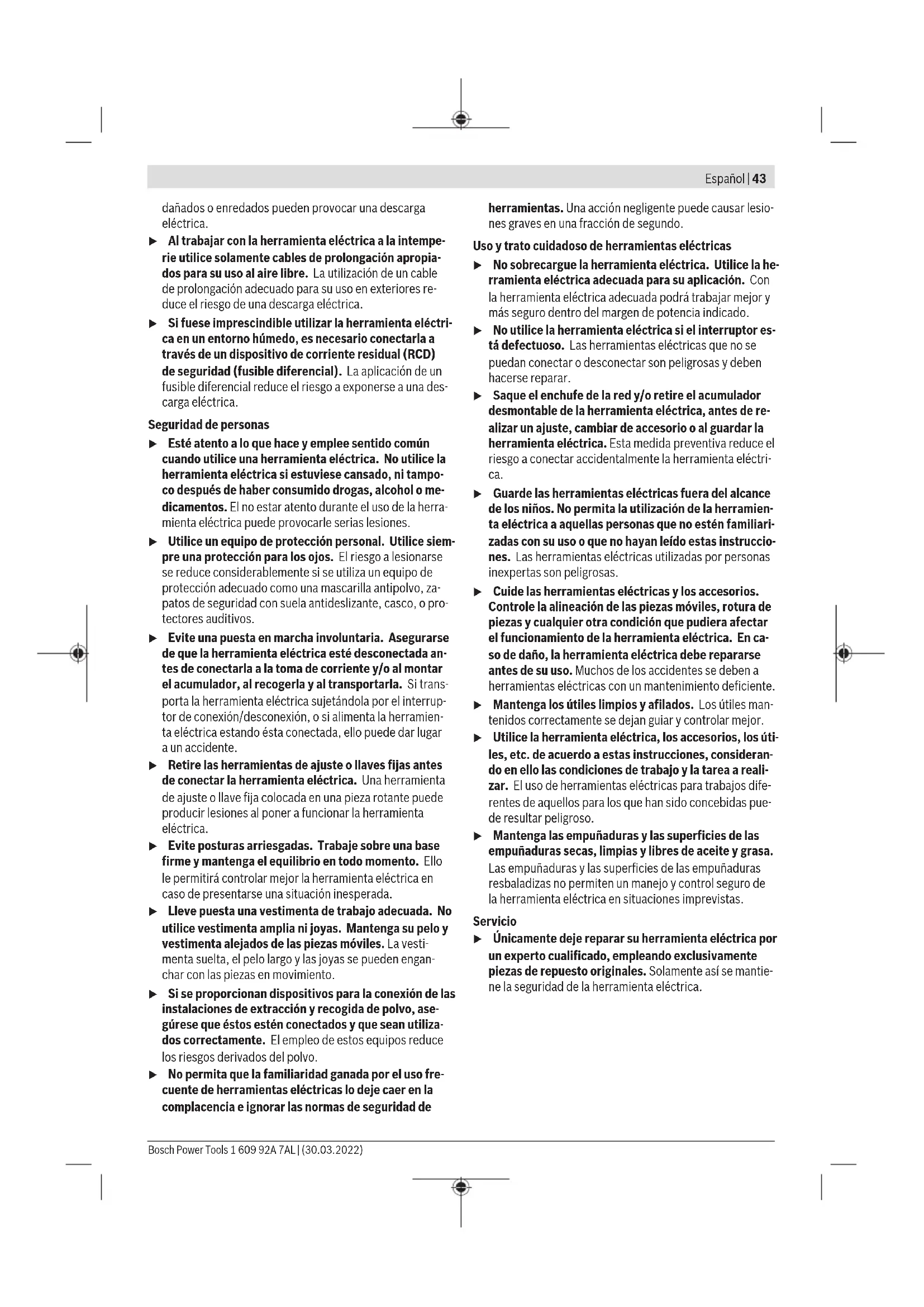 Los valores indicados de los escalones de números de revo- luciones son valores de orientación. Montaje Montar el dispositivo protector u Antes de cualquier manipulación en la herramienta eléctrica, sacar el enchufe de red de la toma de co- rriente. Indicación: Tras la rotura del disco abrasivo durante el servi- cio o en caso de daño de los dispositivos de apoyo en la ca- peruza protectora/en la herramienta eléctrica, la herramien- ta eléctrica debe enviarse de inmediato al servicio técnico, ver las direcciones en el apartado "Servicio técnico y aten- ción al cliente". Cubierta protectora para amolar Coloque la cubierta protecto- ra (8) sobre el alojamiento en la herramienta eléctrica, has- ta que coincidan las levas de codificación de la cubierta protectora con el alojamien- to. Presione y sujete en ello la palanca de desenclavamiento (1). Presione la cubierta protecto- ra (8) sobre el cuello del husi- llo hasta que el collar de la cu- bierta protectora quede asentada en la brida de la he- rramienta eléctrica y gire la cubierta protectora, hasta que encastre de forma claramen- te audible. Adapte la posición de la caperuza protectora (8) a las nece- sidades del paso de trabajo. Para ello, presione la palanca de desenclavamiento (1) hacia arriba, y gire la cubierta pro- tectora (8) a la posición deseada. u Ajuste siempre la cubierta protectora(8) de modo que las levas de la palanca de desenclavamiento (1) enca- jen en las correspondientes aberturas de la cubierta protectora(8). u Ajuste la cubierta protectora (8) de modo que se evite una proyección de chispas en dirección del operador. u ¡La cubierta protectora (8) sólo debe dejarse girar ac- cionando la palanca de desenclavamiento (1) ! De lo contrario, la herramienta eléctrica no se debe seguir utilizado bajo ninguna circunstancia y debe entregar- se al servicio de atención al cliente. Indicación: Las levas de codificación en la cubierta protec- tora (8) garantizan que sólo se pueda montar una cubierta protectora adecuada para la herramienta eléctrica. Bosch Power Tools 1 609 92A 7AL | (30.03.2022)50 | Español Cubierta de aspiración para amolar Para los trabajos de amolado sin polvo, de pinturas, barnices y plásticos, en combinación con vasos de amolar de metal duro(11), puede utilizar la cubierta de aspiración(7). La cu- bierta de aspiración(7) no es adecuada para trabajos en metal. Puede conectarse un aspirador Bosch adecuado a la cubier- ta de aspiración(7). Para ello, introduzca la manguera de as- piración con el adaptador de aspiración en el racor de aloja- miento previsto de la cubierta de aspiración. Cubierta protectora para tronzar u Utilice para tronzar siempre la cubierta protectora pa- ra tronzar(9) o la cubierta protectora para amolar (8) junto con la cubierta para tronzar (27). u En el caso de tronzar piedra, debe encargarse de una aspiración de polvo adecuada. La cubierta protectora para tronzar(9) se monta como la cu- bierta protectora para amolar(8). Cubierta para tronzar de metal Monte la cubierta para tronzar(27) de metal en la cubierta protectora para amolar(8) (ver figuraA): Gire hacia atrás el estribo de sujeción (➊). Coloque la cubierta(27) en la cu- bierta protectora para amolar(8) (➋). Presione firmemente el estribo de sujeción en la cubierta protectora(8) (➌). Para el desmontaje (ver figuraB), presione el botón en el es- tribo de sujeción (➊) y gírelo hacia atrás (➋). Retire la cubierta(27) de la cubierta protectora(8) (➌). Cubierta para tronzar de plástico Coloque la cubierta para tronzar(27) de plástico en la cu- bierta protectora para amolar(8) (ver figuraC). La cubierta(27) encaja de forma audible y visible en la cubierta protectora(8). Para el desmontaje (ver figuraD) desenclave la cubierta(27) en la cubierta protectora(8) (➊), a la izquier- da o a la derecha, y retire la cubierta (➋). Cubierta de aspiración para tronzar con carro guía La cubierta de aspiración para tronzar con carro guía(19) se monta como la cubierta protectora para amolar. Mediante la fijación de la empuñadura adicional(6)/(32) a través del estribo en la cubierta de aspiración en la carcasa del engranaje, la herramienta eléctrica queda firmemente unida a la cubierta de aspiración. Puede conectarse un aspi- rador Bosch adecuado a la cubierta de aspiración con carro guía(19). Para ello, introduzca la manguera de aspiración con el adaptador de aspiración en el racor de alojamiento previsto de la cubierta de aspiración. Indicación: La fricción generada por el polvo en la manguera de aspiración y en los accesorios durante la aspiración causa una carga electrostática que el usuario puede sentir como una descarga estática (dependiendo de los factores ambien- tales y de su estado fisiológico). En general, Bosch reco- mienda el uso de una manguera de aspiración antiestática (accesorio) para aspirar polvo fino y materiales secos. Protección de las manos u Monte siempre la protección de las manos para los tra- bajos con el plato lijador de goma(22) o con el cepillo de corona/cepillo cónico/corona diamantada para ta- ladrar (21). Fije la protección de las manos(21) con la empuñadura adicional(6)/(32). Empuñadura adicional estándar/empuñadura adicional amortiguadora de vibraciones Atornille la empuñadura adicional(6)/(32), dependiente de la modalidad de trabajo, a la derecha o la izquierda de la ca- beza del engranaje. u Utilice su herramienta eléctrica sólo con la empuñadu- ra adicional (6)/(32). u No siga utilizando la herramienta eléctrica, si la empu- ñadura adicional (6)/(32) está dañada. No haga ningu- na modificación en la empuñadura adicional (6)/(32). La empuñadura adicional antivibratoria(32) amorti- gua las vibraciones, lo cual permite trabajar de forma más cómoda y segura. Montar útiles abrasivos u Antes de cualquier manipulación en la herramienta eléctrica, sacar el enchufe de red de la toma de co- rriente. u No tome los discos am