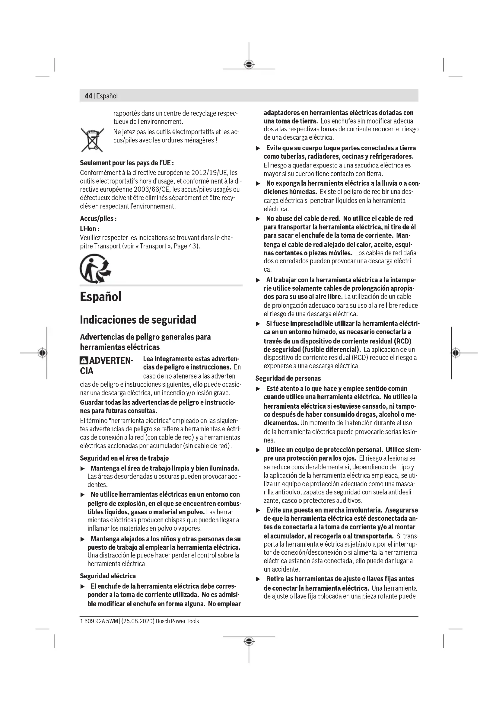 Los valores indicados de los escalones de números de revoluciones son valores de orientación. u Las revoluciones admisibles del accesorio deberán ser como mínimo iguales a las revoluciones máximas indi- cadas en la herramienta eléctrica. Aquellos accesorios que giren a unas revoluciones mayores a las admisibles pueden llegar a romperse y salir desprendidos. 1 609 92A 5WM | (25.08.2020) Bosch Power ToolsEspañol | 55 Indicadores de estado Indicador del estado de car- ga del acumulador (interfaz de usuario) (34) Significado/causa Solución Verde Acumulador cargado – Amarillo Acumulador casi vacío Acumulador, sustituir o cargar pronto Rojo Acumulador vacío Acumulador, sustituir o cargar Indicador de protección con- tra sobrecarga (38) Significado/causa Solución Amarillo Se ha alcanzado la temperatura crítica (motor, electrónica, acumulador) La herramienta eléctrica se debe dejar funcio- nar al ralentí y dejar enfriar Rojo La herramienta eléctrica está sobrecalentada y se desconecta Dejar enfriar la herramienta eléctrica Indicador de estado de he- rramienta eléctrica (37) Significado/causa Solución Verde Estado OK – Amarillo Se ha alcanzado la temperatura crítica o el acumulador está casi vacío La herramienta eléctrica se debe dejar funcio- nar al ralentí y dejar enfriar o sustituir respec- tivamente cargar pronto el acumulador rojo encendido La herramienta eléctrica está sobrecalentada o el acumulador está vacío Dejar enfriar la herramienta eléctrica o susti- tuir respectivamente cargar el acumulador rojo parpadeante La desconexión de contragolpe o la protec- ción de rearranque se ha activado Desconectar y conectar de nuevo la herra- mienta eléctrica luz intermitente azul La herramienta eléctrica está conectada con el aparato final portátil o la configuración se está transmitiendo