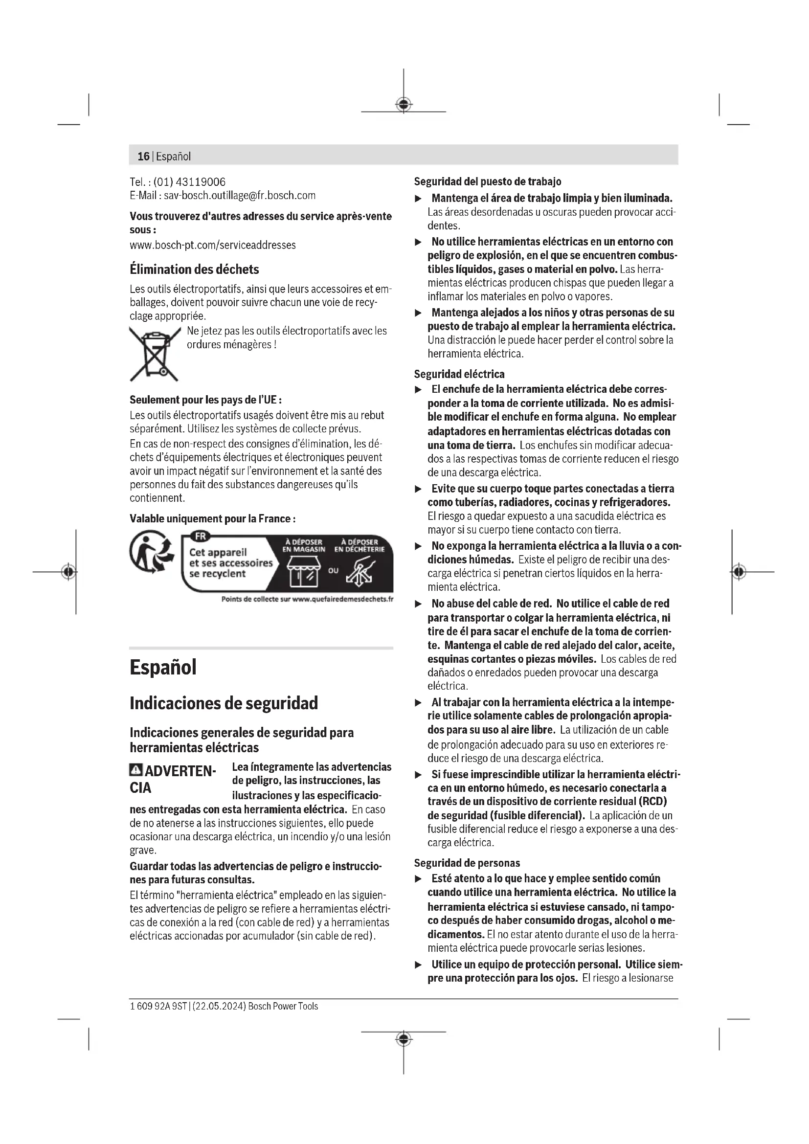 0,7 Aluminium 200 2,0 Graisser/refroidir le poinçon Afin de prolonger la durée de vie du poinçon (6), il est re- commandé d’utiliser un lubrifiant disposant d’une bonne fonction de refroidissement (parex. huile de coupe). Appliquez une trace de lubrifiant sur la surface de la tôle le long de la coupe prévue. Couper après traçage ou avec gabarit Les coupes droites peuvent être effectuées plus facilement si vous guidez l’outil électroportatif le long d’une règle. Les contours peuvent être coupés en guidant l’outil électro- portatif le long d’un gabarit. Les découpes internes nécessitent un préperçage de 21mm de diamètre. Entretien et Service après‑vente Nettoyage et entretien u Débranchez le câble d’alimentation de la prise avant d’effectuer des travaux quels qu’il soient sur l’outil électroportatif. u Tenez toujours propres l’outil électroportatif ainsi que les fentes de ventilation afin d’obtenir un travail im- peccable et sûr. Dans le cas où il s’avère nécessaire de remplacer le câble d’alimentation, confiez le remplacement à Bosch ou une sta- tion de Service Après-Vente agréée pour outillage Bosch afin de ne pas compromettre la sécurité. Nettoyez et graissez le poinçon(6) et la matrice(7) toutes les 3heures de service. Remplacez à temps le poinçon et la matrice dans le cas d’usure, car seuls des outils affûtés bénéficient d'une perfor- mance de coupe élevée et ménagent l’outil électroportatif. Ni le poinçon(6) ni la matrice(7) ne doivent être réaffûtés. Changement de la matrice Dévissez la vis moletée(9) du porte-matrice(5). Retirez la matrice(7). Si nécessaire, nettoyez le porte-matrice(5). Montez une nouvelle matrice(7), bien huilée, dans le porte-matrice. Veillez à l’alignement du côté plat. Resserrez la vis moletée(9) sur la rondelle en caoutchouc(8) montée. Serrez la vis à l’aide d’une clé mâle pour vis à six pans creux en surmontant la résistance de la rondelle en caoutchouc (3−4Nm). Changement du poinçon Desserrez la vis(2) du porte-matrice et sortez le porte- matrice(5) complètement du carter. Dégagez latéralement le poinçon(6) de son logement et reti- rez-le vers le bas. Placez un nouveau poinçon(6) bien huilé dans la rainure du logement et centrez-le correctement. Poussez le porte-matrice(5) avec précaution par-dessus le poinçon dans le carter. Tournez le porte-matrice dans l'une des troispositions possibles en choisissant le sens de coupe souhaité. Resserrez la vis(2) du porte-matrice. Service après-vente et conseil utilisateurs Notre Service après-vente répond à vos questions concer- nant la réparation et l’entretien de votre produit et les pièces de rechange. Vous trouverez des vues éclatées et des infor- mations sur les pièces de rechange sur le site : www.bosch-pt.com L’équipe de conseil utilisateurs Bosch se tient à votre dispo- sition pour répondre à vos questions concernant nos pro- duits et leurs accessoires. Pour toute demande de renseignement ou toute commande de pièces de rechange, précisez impérativement la réfé- rence à 10chiffres figurant sur l’étiquette signalétique du produit. France Réparer un outil Bosch n’a jamais été aussi simple, et ce, en moins de 5 jours, grâce à SAV DIRECT, notre formulaire de retour en ligne que vous trouverez sur notre site internet www.bosch-pt.fr à la rubrique Services. Vous y trouverez également notre boutique de pièces détachées en ligne où vous pouvez passer directement vos commandes. Vous êtes un utilisateur, contactez : Le Service Clientèle Bosch Outillage Electroportatif Tel.: 0970821226 (Numéro non surtaxé au prix d'un ap- pel local) E-Mail: sav.outillage-electroportatif@fr.bosch.com Vous êtes un revendeur, contactez: Robert Bosch (France) S.A.S. Service Après-Vente Electroportatif 126, rue de Stalingrad 93705 DRANCY Cédex Bosch Power Tools 1 609 92A 9ST | (22.05.2024)16 | Español Tel.: (01) 43119006 E-Mail: sav-bosch.outillage@fr.bosch.com Vous trouverez d'autres adresses du service après-vente sous: www.bosch-pt.com/serviceaddresses Élimination des déchets Les outils électroportatifs, ainsi que leurs accessoires et em- ballages, doivent pouvoir suivre chacun une voie de recy- clage appropriée. Ne jetez pas les outils électroportatifs avec les ordures ménagères! Seulement pour les pays de l’UE : Les outils électroportatifs usagés doivent être mis au rebut séparément. Utilisez les systèmes de collecte prévus. En cas de non-respect des consignes d’élimination, les dé- chets d’équipements électriques et électroniques peuvent avoir un impact négatif sur l’environnement et la santé des personnes du fait des substances dangereuses qu’ils contiennent. Valable uniquement pour la France: Español Indicaciones de seguridad Indicaciones generales de seguridad para herramientas eléctricas ADVERTEN- CIA Lea íntegramente las advertencias de peligro, las instrucciones, las ilustraciones y las especificacio- nes entregadas con esta herramienta eléctrica. En caso de no atenerse a las instrucciones siguientes, ello puede ocasionar una descarga eléctrica, un incendio y/o una lesión grave. Guardar todas las advertencias de peligro e instruccio- nes para futuras consultas. El término "herramienta eléctrica" empleado en las siguien- tes advertencias de peligro se refiere a herramientas eléctri- cas de conexión a la red (con cable de red) y a herramientas eléctricas accionadas por acumulador (sin cable de red). Seguridad del puesto de trabajo u Mantenga el área de trabajo limpia y bien iluminada. Las áreas desordenadas u oscuras pueden provocar acci- dentes. u No utilice herramientas eléctricas en un entorno con peligro de explosión, en el que se encuentren combus- tibles líquidos, gases o material en polvo. Las herra- mientas eléctricas producen chispas que pueden llegar a inflamar los materiales en polvo o vapores. u Mantenga alejado
