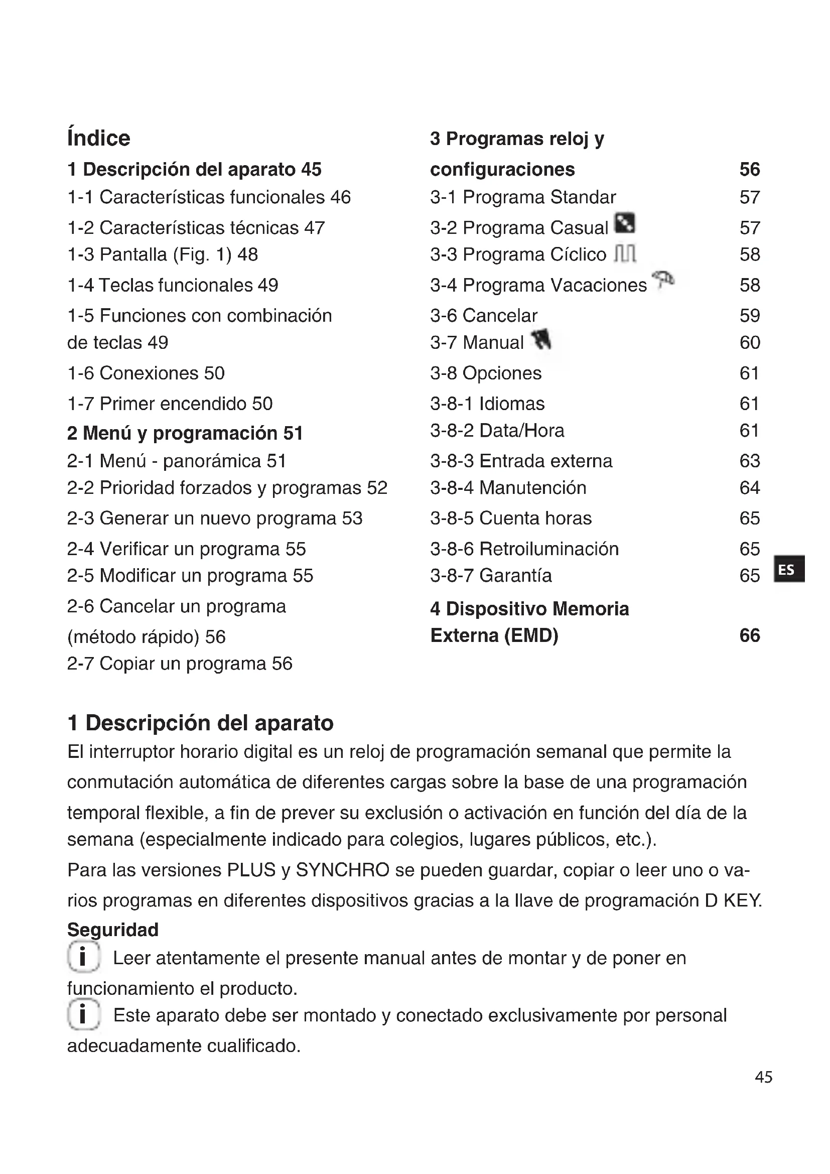 3-8 Opciones 61 3-8-1 Idiomas 61 3-8-2 Data/Hora 61 3-8-3 Entrada externa 63 3-8-4 Manutención 64 3-8-5 Cuenta horas 65 3-8-6 Retroiluminación 65 3-8-7 Garantía 65 4 Dispositivo Memoria Externa (EMD) 66 1 Descripción del aparato El interruptor horario digital es un reloj de programación semanal que permite la conmutación automática de diferentes cargas sobre la base de una programación temporal flexible, a fin de prever su exclusión o activación en función del día de la semana (especialmente indicado para colegios, lugares públicos, etc.). Para las versiones PLUS y SYNCHRO se pueden guardar, copiar o leer uno o va- rios programas en diferentes dispositivos gracias a la llave de programación D KEY. Seguridad Leer atentamente el presente manual antes de montar y de poner en funcionamiento el producto. Este aparato debe ser montado y conectado exclusivamente por personal adecuadamente cualificado.