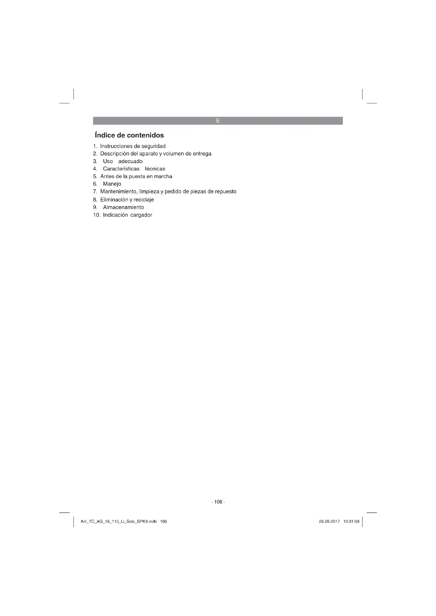 La lijadora angular ha sido concebida para lijar metales y roca utilizando la muela de afi lar corre- spondiente, así como los dispositivos de seguri- dad necesarios. Aviso! La lijadora angular solo puede ser uti- lizada para tronzar metal y roca si el dispositivo de seguridad, disponible como accesorio, está montado. Utilizar la máquina sólo en los casos que se indi- can explícitamente como de uso adecuado. Cual- quier otro uso no será adecuado. En caso de uso inadecuado, el fabricante no se hace responsable de daños o lesiones de cualquier tipo; el respon- sable es el usuario u operario de la máquina. Tener en consideración que nuestro aparato no está indicado para un uso comercial, industrial o en taller. No asumiremos ningún tipo de garantía cuando se utilice el aparato en zonas industria- les, comerciales o talleres, así como actividades similares. Anl_TC_AG_18_115_Li_Solo_SPK9.indb 108Anl_TC_AG_18_115_Li_Solo_SPK9.indb 108 26.09.2017 10:31:0926.09.2017 10:31:09E