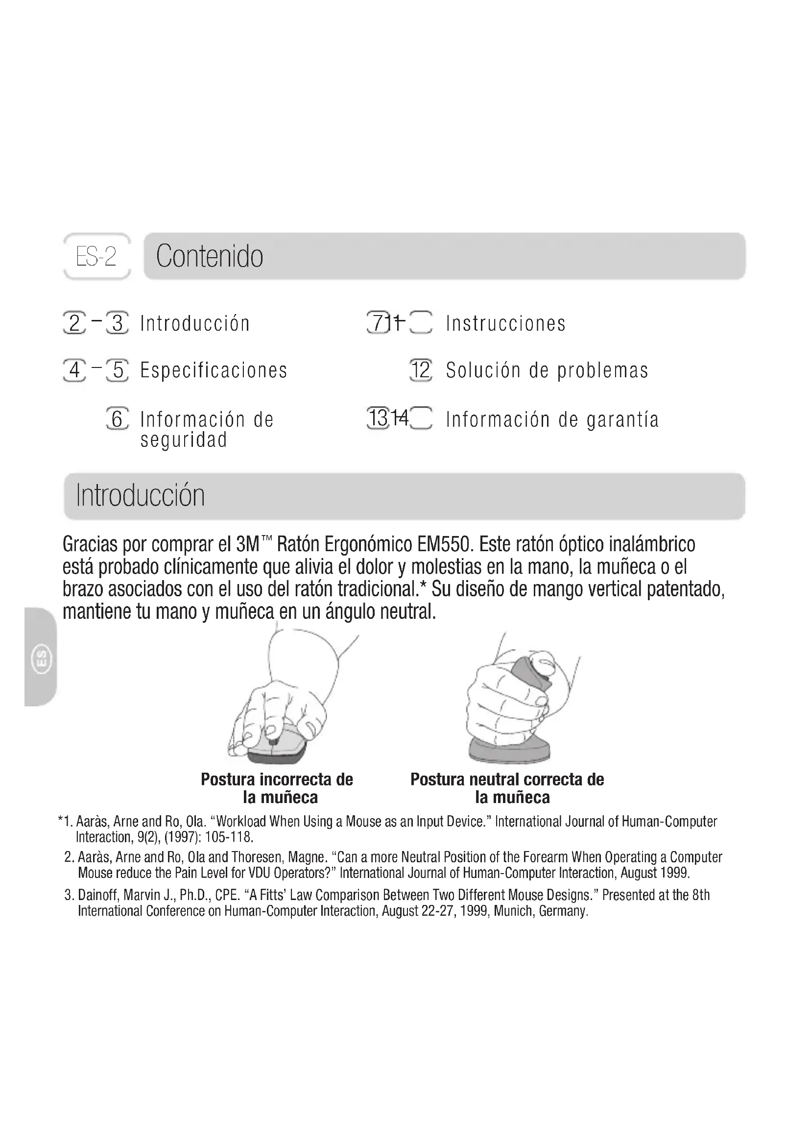 ES- 2Introducción Cuando se usa un ratón tradicional, se gira el antebrazo y la muñeca además de presionar la muñeca y el área del túnel carpiano contra la superfi cie de trabajo. Esta posición puede ocasionar lesiones por esfuerzos repetitivos, produciendo dolor y molestias en la mano, muñeca o brazo. El 3M