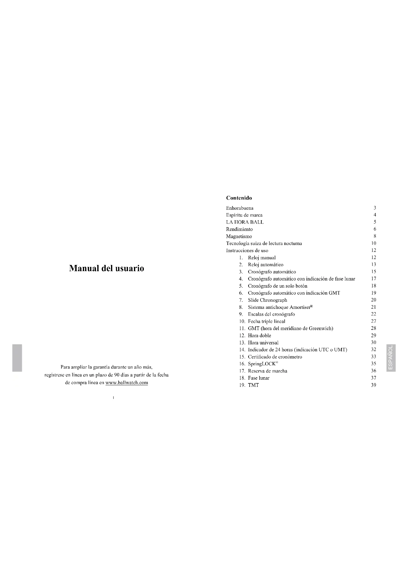 4th Floor, Le Concorde Tower 202 Ratchadapisek Road Huaykwang Bangkok 10310 Tel: +66-2694-1888, Fax: +66-2694-2149 BALL WATCH MALAYSIA SDN. BHD. Unit 30.3, 30th oor, Menara Standard Chartered No. 30, Jalan Sultan Ismail 50250 Kuala Lumpur, Malaysia Tel: +60 3 2142 0887 マレーシア62 1 Manual del usuario Para ampliar la garantía durante un año más, regístrese en línea en un plazo de 90 días a partir de la fecha de compra línea en www.ballwatch.com Enhorabuena Espíritu de marca