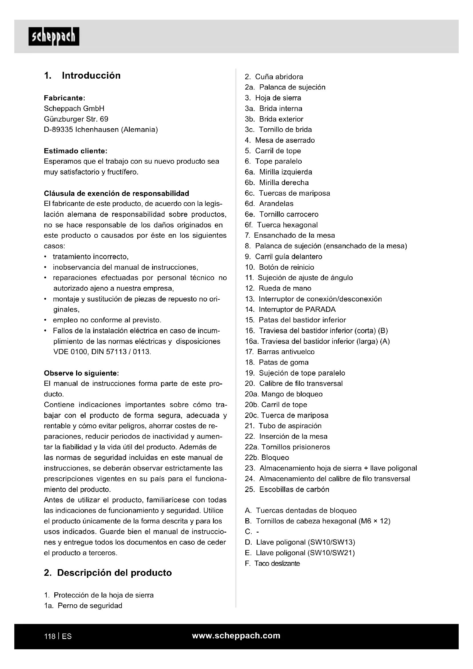 Fabricante: Scheppach GmbH Günzburger Str. 69 D-89335 Ichenhausen (Alemania) Estimado cliente: Esperamos que el trabajo con su nuevo producto sea muy satisfactorio y fructífero. Cláusula de exención de responsabilidad El fabricante de este producto, de acuerdo con la legis- lación alemana de responsabilidad sobre productos, no se hace responsable de los daños originados en este producto o causados por éste en los siguientes casos: