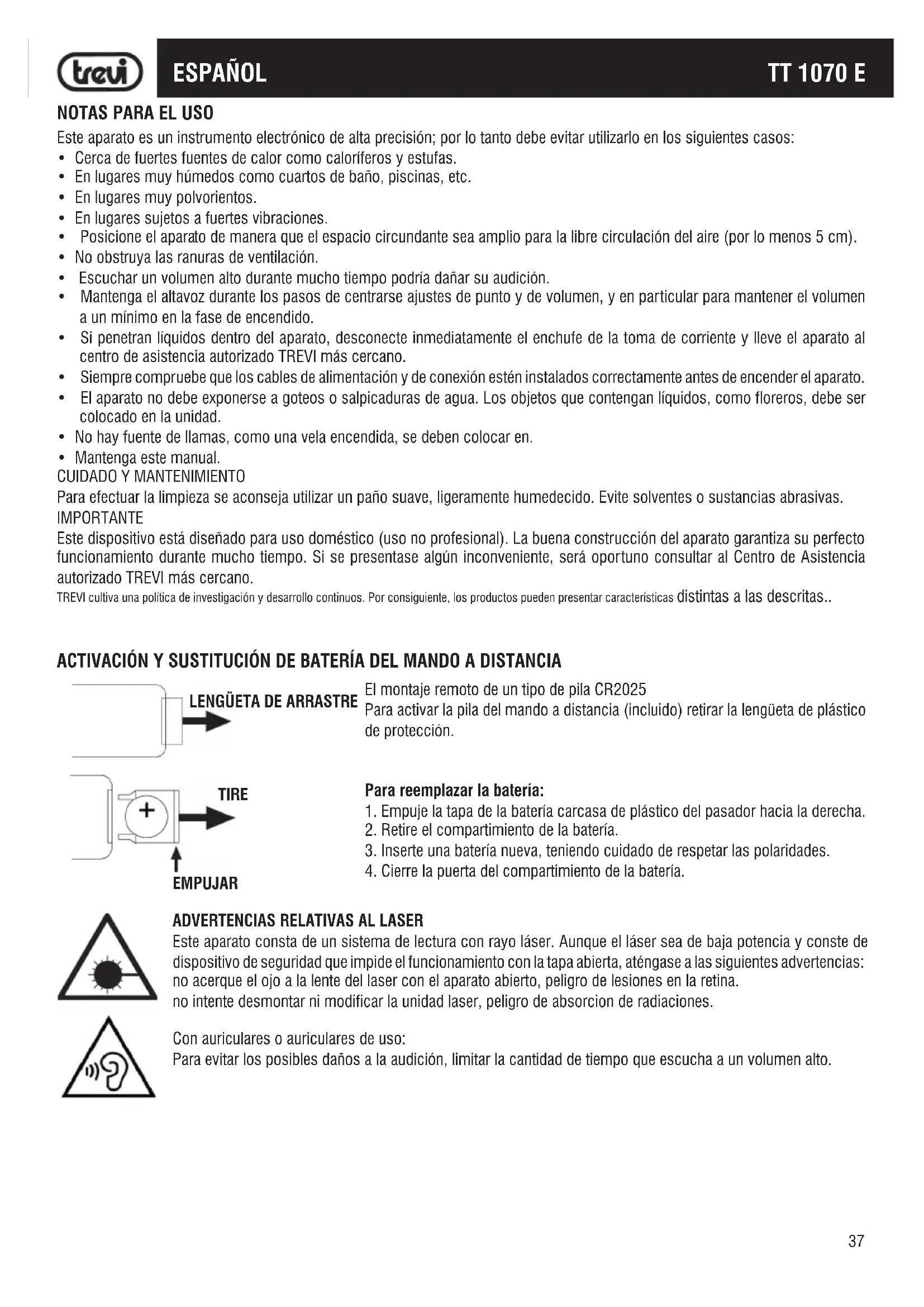 Para efectuar la limpieza se aconseja utilizar un paño suave, ligeramente humedecido. Evite solventes o sustancias abrasivas. IMPORTANTE Este dispositivo está diseñado para uso doméstico (uso no profesional). La buena construcción del aparato garantiza su perfecto funcionamiento durante mucho tiempo. Si se presentase algún inconveniente, será oportuno consultar al Centro de Asistencia autorizado TREVI más cercano. TREVI cultiva una política de investigación y desarrollo continuos. Por consiguiente, los productos pueden presentar características distintas a las descritas..
