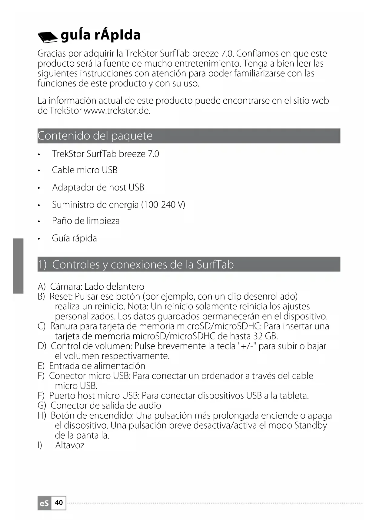 guía rápIda Gracias por adquirir la TrekStor SurfTab breeze 7.0. Confiamos en que este producto será la fuente de mucho entretenimiento. Tenga a bien leer las siguientes instrucciones con atención para poder familiarizarse con las funciones de este producto y con su uso. La información actual de este producto puede encontrarse en el sitio web de TrekStor www.trekstor.de. Contenido del paquete