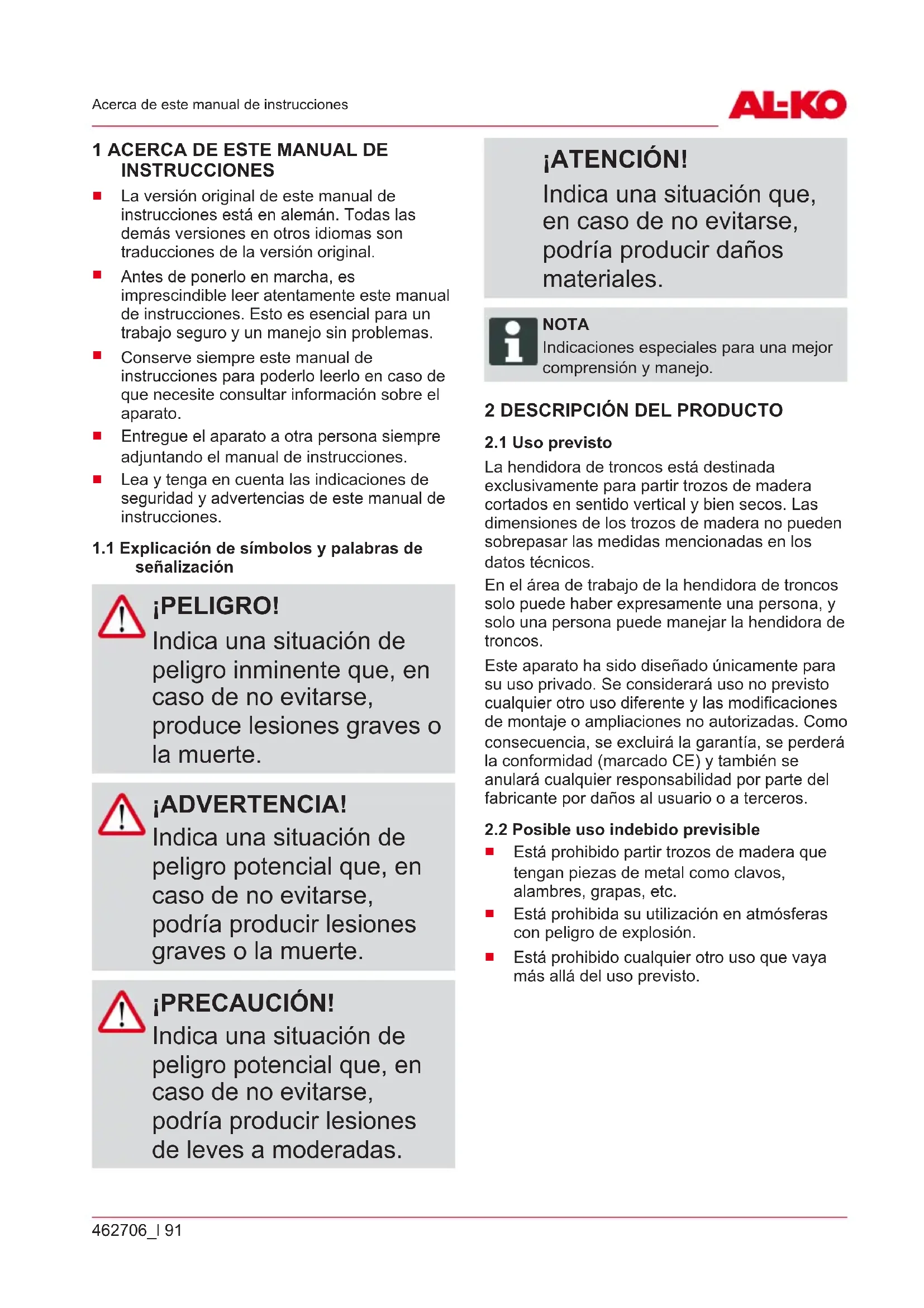 señalización ¡PELIGRO! Indica una situación de peligro inminente que, en caso de no evitarse, produce lesiones graves o la muerte. ¡ADVERTENCIA! Indica una situación de peligro potencial que, en caso de no evitarse, podría producir lesiones graves o la muerte. ¡PRECAUCIÓN! Indica una situación de peligro potencial que, en caso de no evitarse, podría producir lesiones de leves a moderadas. ¡ATENCIÓN! Indica una situación que, en caso de no evitarse, podría producir daños materiales. NOTA Indicaciones especiales para una mejor comprensión y manejo.