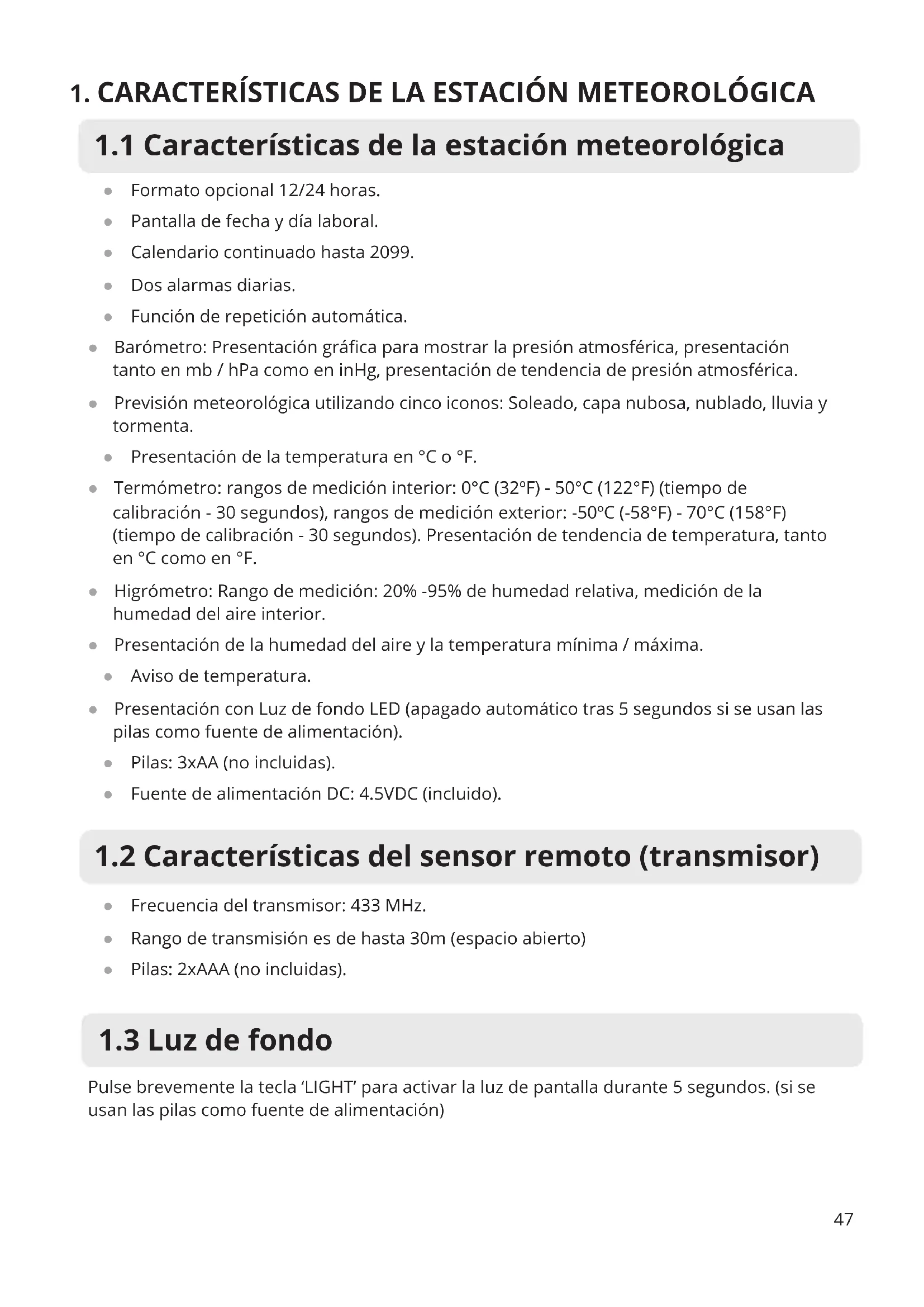 ● Formato opcional 12/24 horas. ● Pantalla de fecha y día laboral. ● Calendario continuado hasta 2099. ● Dos alarmas diarias. ● Función de repetición automática. ● Barómetro: Presentación gráca para mostrar la presión atmosférica, presentación tanto en mb / hPa como en inHg, presentación de tendencia de presión atmosférica. ● Previsión meteorológica utilizando cinco iconos: Soleado, capa nubosa, nublado, lluvia y tormenta. ● Presentación de la temperatura en °C o °F. ● Termómetro: rangos de medición interior: 0°C (32ºF) - 50°C (122°F) (tiempo de calibración - 30 segundos), rangos de medición exterior: -50ºC (-58°F) - 70°C (158°F) (tiempo de calibración - 30 segundos). Presentación de tendencia de temperatura, tanto en °C como en °F. ● Higrómetro: Rango de medición: 20% -95% de humedad relativa, medición de la humedad del aire interior. ● Presentación de la humedad del aire y la temperatura mínima / máxima. ● Aviso de temperatura. ● Presentación con Luz de fondo LED (apagado automático tras 5 segundos si se usan las pilas como fuente de alimentación). ● Pilas: 3xAA (no incluidas). ● Fuente de alimentación DC: 4.5VDC (incluido).