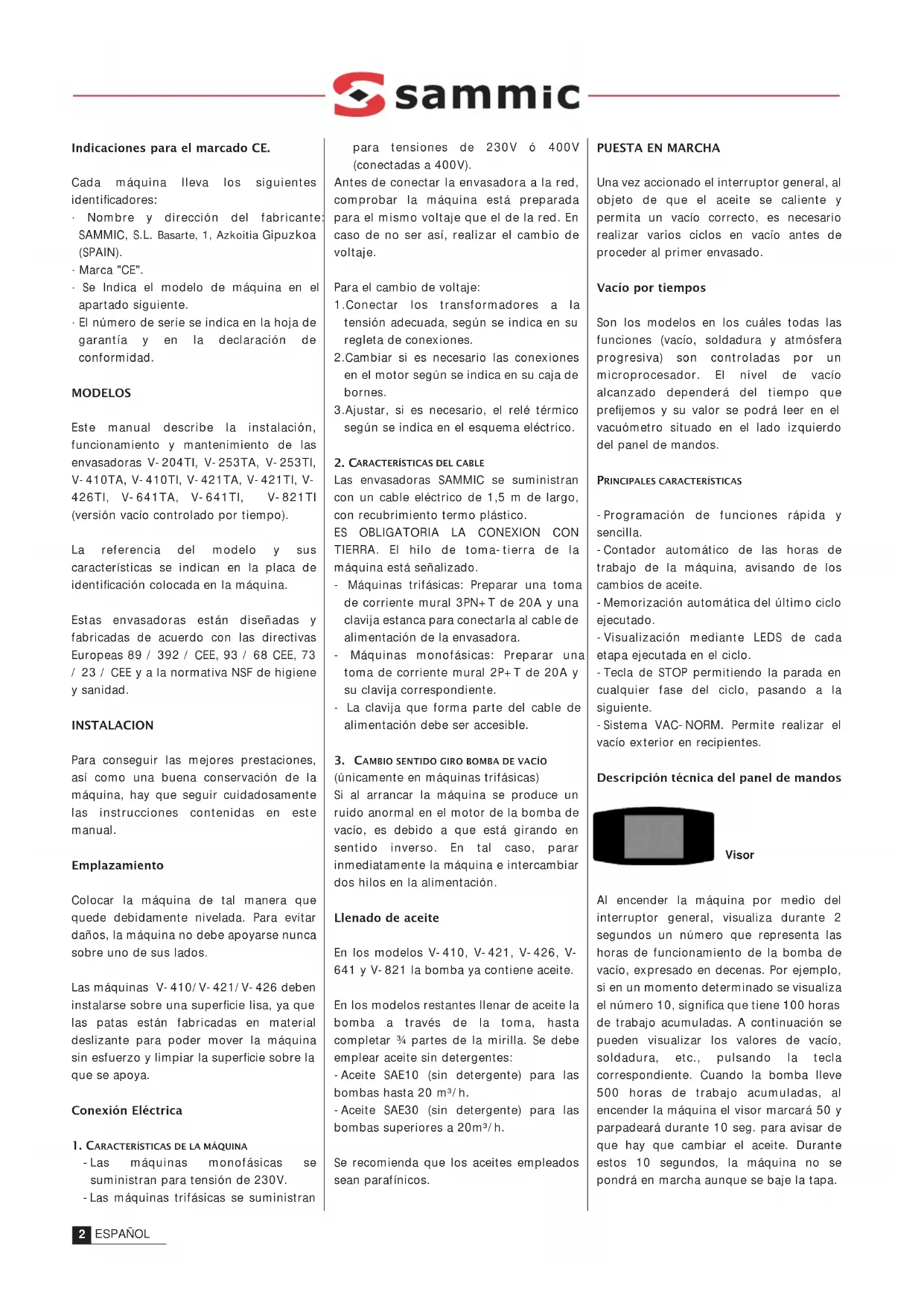 Este manual describe la instalacion,funcionamento y mantenimiento de las envasadoras V-204TI,V-253TA,V-253TI, V-410TA,V-410TI,V-421TA,V-421TI,V 426TI,V-641TA,V-641TI,V-821TI (version bajo controlado por tiempo).