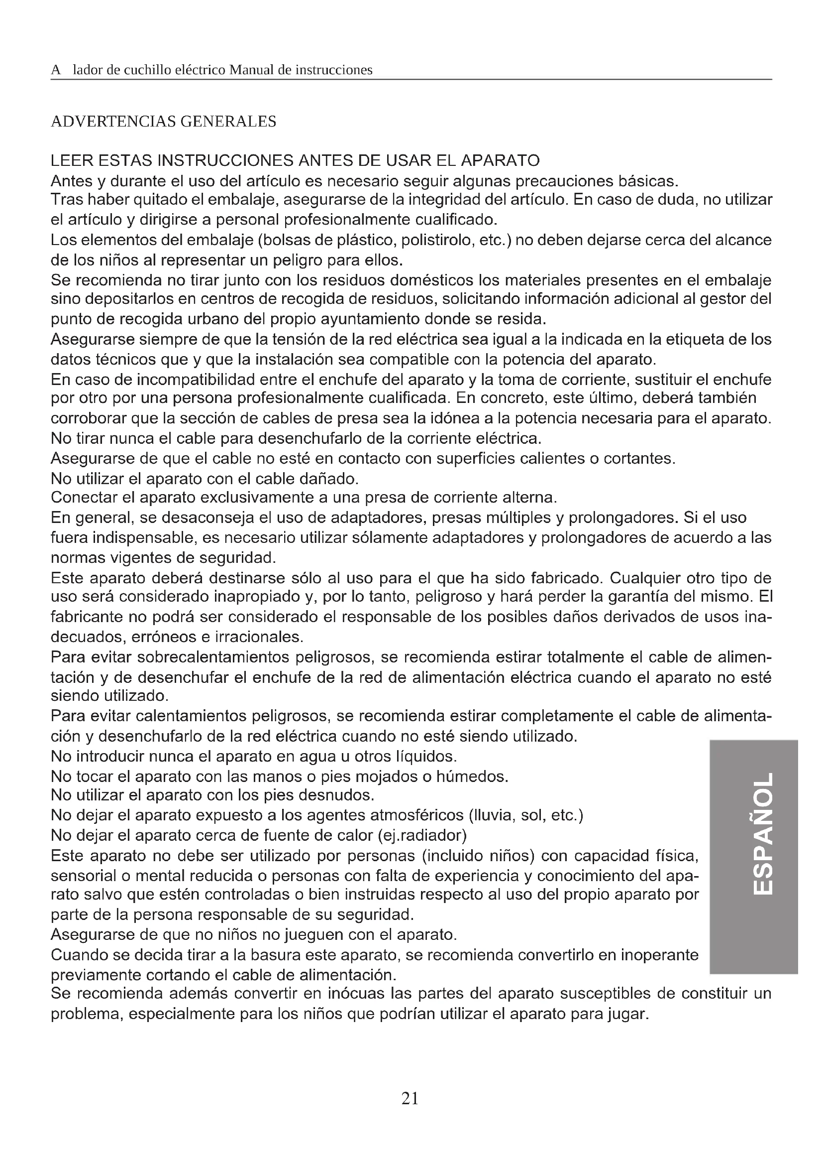 No usar el cable o el enchufe si está danados, si el aflacuchillos no funciona como debería, ha caido, está dañado o ha entrada en contacto con el agua ponerse en contacto con el fabricante o el servicios de asistencia技术水平a una persona con calidad similar.
