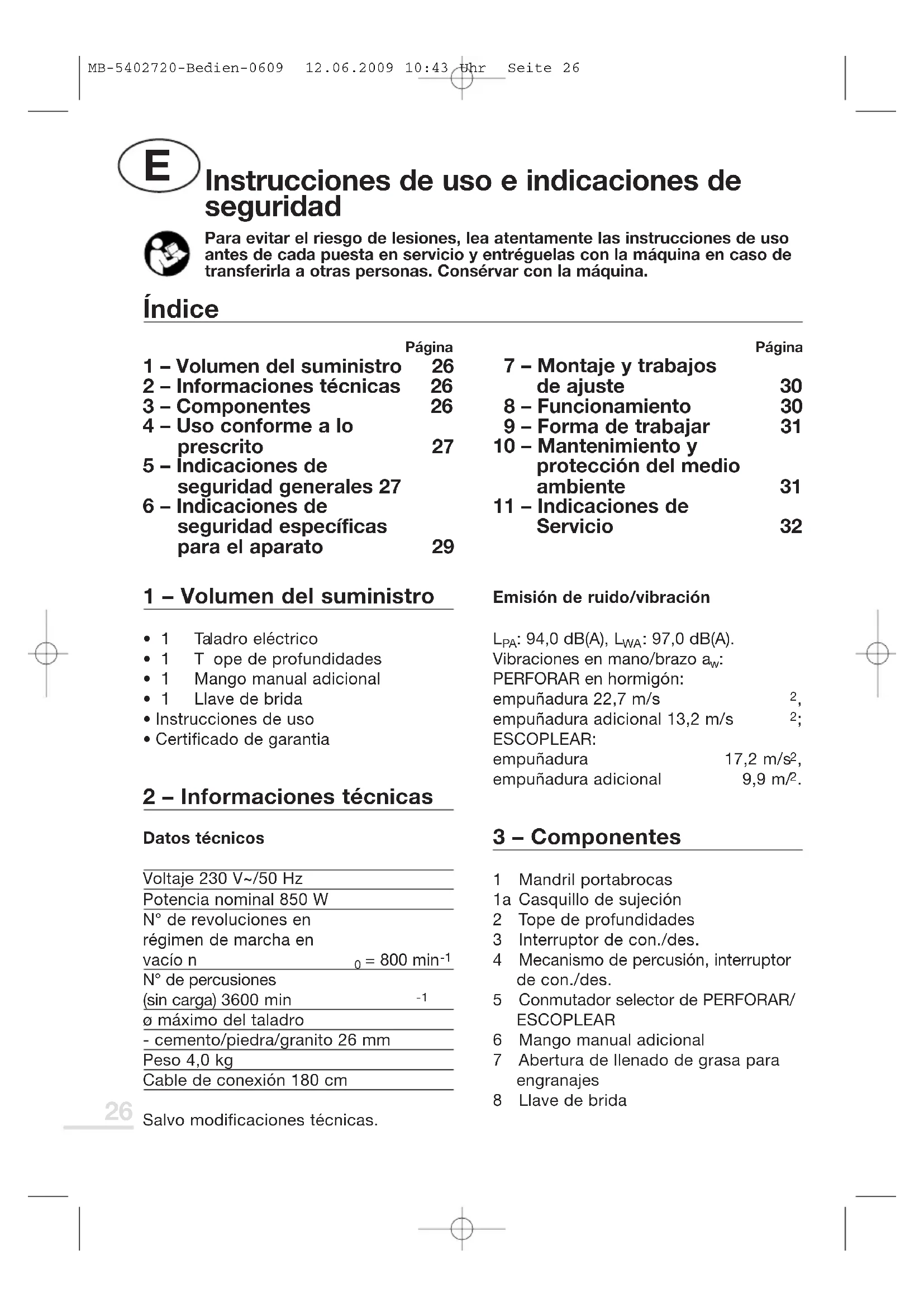 Este taladro electrico es adequado, en el ambito domestico, para taladrar y taladrar a percusion hormigón, piedra, mampostería, asi como para trabajo ligeros de escoupledo. Unicamente se deben utilizar los accesorios apropiados (respetar lasindicaciones del fabricante). Se excluye expresamenteequalquierotro tipo de aplicación. Mandril portabocas para herramrientas según el sistemasDSS+.
