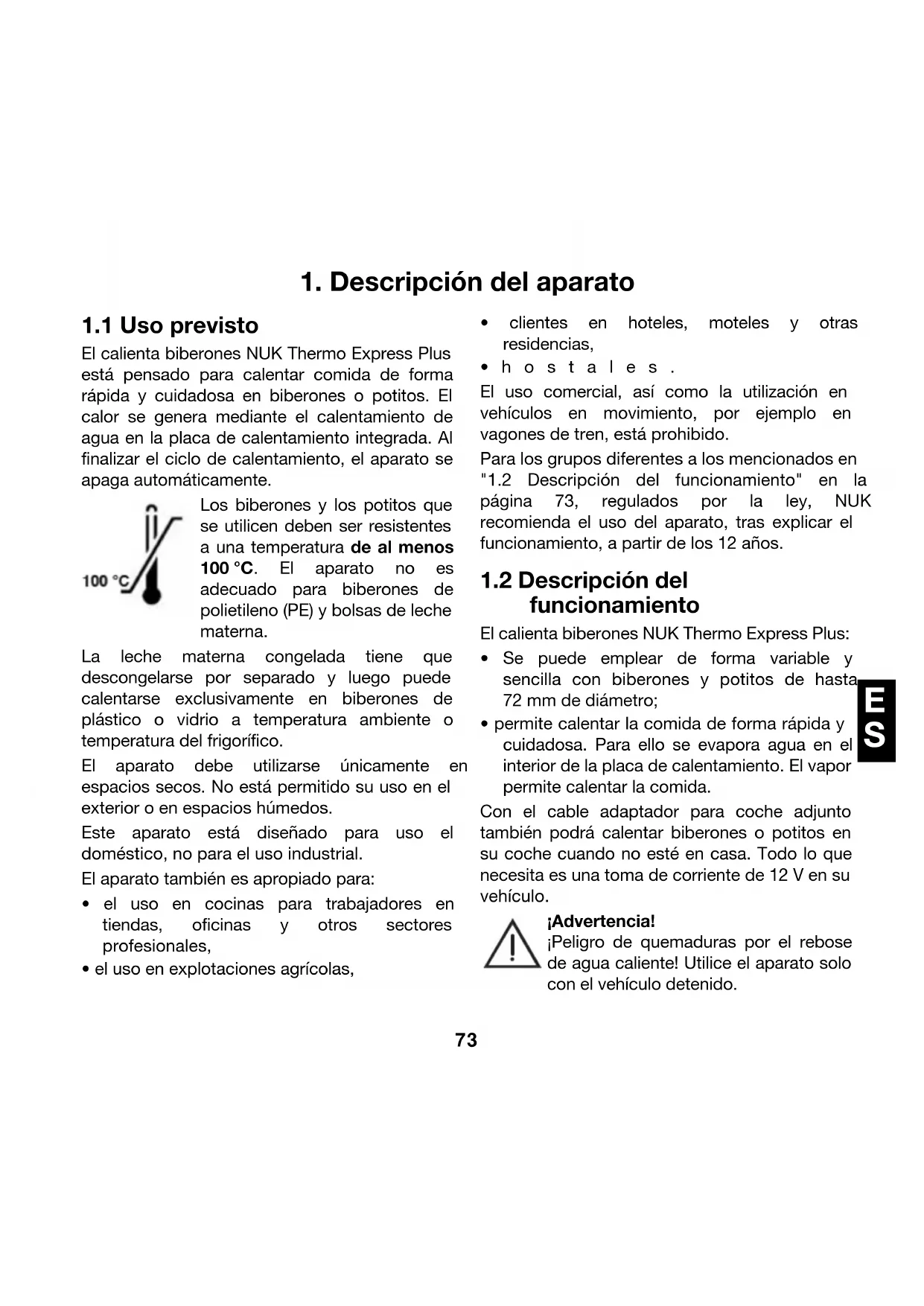 - hostales. El uso comercial, así como la utilización en vehículos en movimiento, por ejemplo en vagones de tren, está prohibido. Para los grupos diferentes a los mencionados en "1.2 Descripción del funcionamiento" en la página 73, regulados por la ley, NUK recomienda el uso del aparato, tras explicar el funcionamiento, a partir de los 12 años.