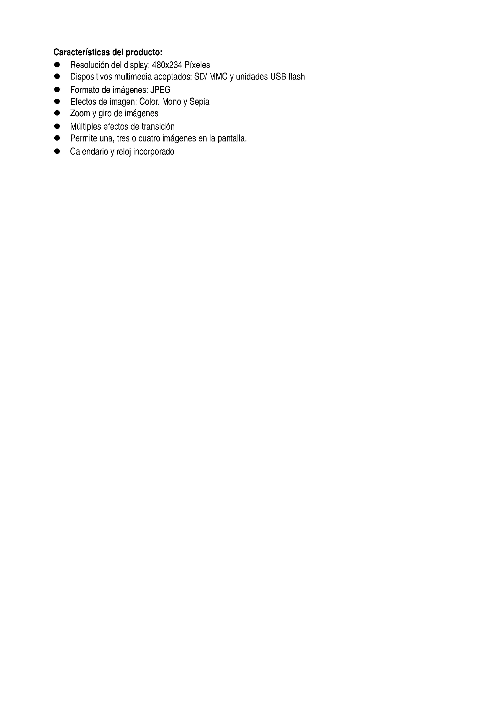 | Características técnicas | Pantalla LCD de 7 pulgadas, resolución 800 x 480 píxeles, soporte para formatos JPEG, BMP, PNG |