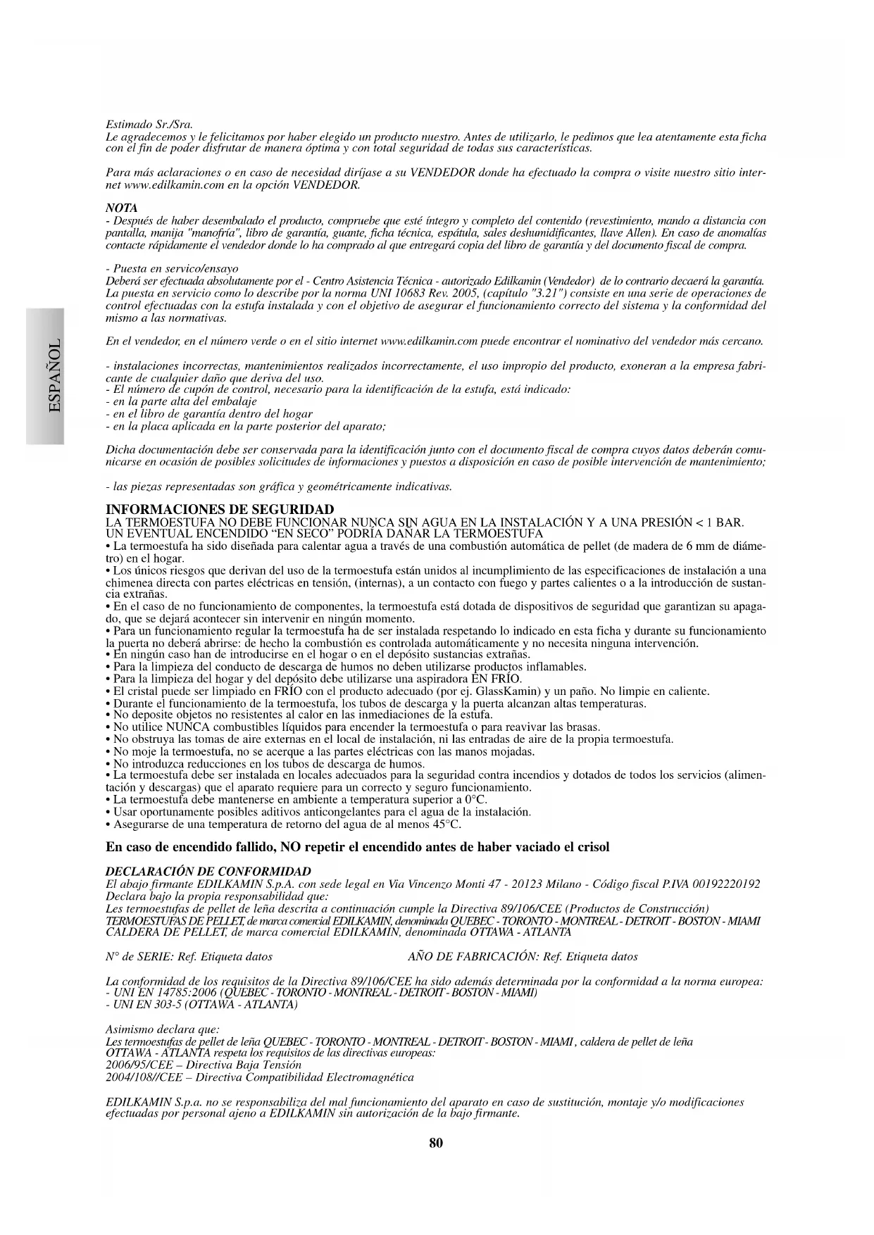 NOTA sobre el combustible. Las termoestufas de pellet están proyectadas y programadas para quemar pellet de leña, de 6 mm de diámetro. El pellet es un combustible que se presenta en forma de pequeños cilindros con diámetro de aproximadamente 6 mm, obtenidos prensando serrín, leña de deshecho troceada, prensados a altas temperaturas, sin usar colas u otros materialesextraños. Se comercializa en sacos de 15 Kg. Para NO poner en peligro el funcionamiento de la termoestufa es indispensable NO quemar otras cosas. La utilización de otros materiales (incluida leña), detectable a través de análisis de laboratorio, dejaría sin efecto la garantía. EdilKamin ha diseñado, probado y programado sus propios productos para que garanticen las mejores prestaciones conpellet de las siguientes características:diámetro: 6 milímetros longitud máxima: 40 mm humedad máxima: 8 %; rendimiento calórico: 4300 kcal/kg al menos.El uso de pellet no apropiados puede provocar: disminución del rendimiento, anomalías de funcionamiento, bloqueospor obstrucción, suciedad del vidrio, materiales incombustos …Se hace mención a la recomendación CTI indicada en la página web www.cti2000.itMONTREAL / MIAMI OTTAWA / ATLANTA