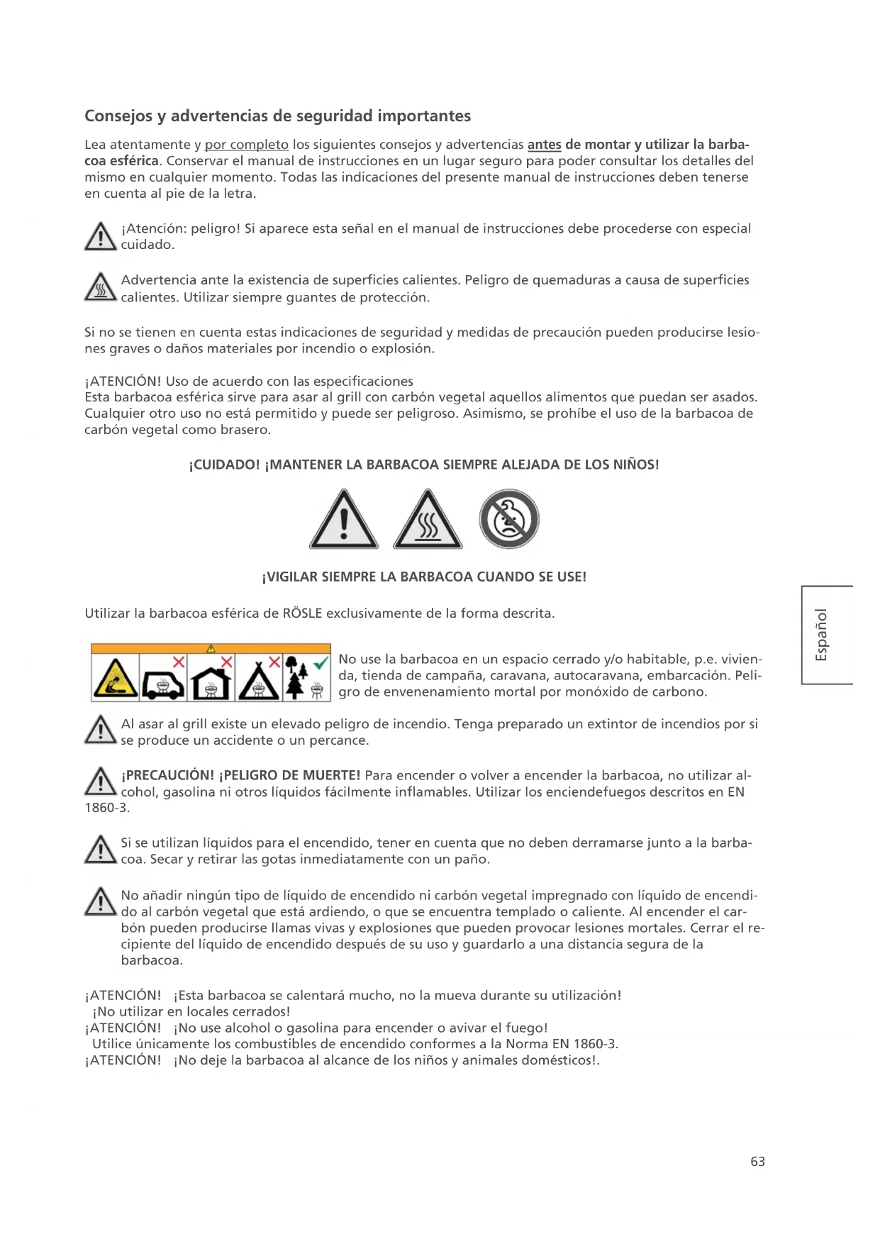 Piastra barbecue circolare 40 cm63 Español Consejos y advertencias de seguridad importantes Lea atentamente y por completo los siguientes consejos y advertencias antes de montar y utilizar la barba- coa esférica. Conservar el manual de instrucciones en un lugar seguro para poder consultar los detalles del mismo en cualquier momento. Todas las indicaciones del presente manual de instrucciones deben tenerse en cuenta al pie de la letra. ¡Atención: peligro! Si aparece esta señal en el manual de instrucciones debe procederse con especial cuidado. Advertencia ante la existencia de supercies calientes. Peligro de quemaduras a causa de supercies calientes. Utilizar siempre guantes de protección. Si no se tienen en cuenta estas indicaciones de seguridad y medidas de precaución pueden producirse lesio- nes graves o daños materiales por incendio o explosión. ¡ATENCIÓN! Uso de acuerdo con las especicaciones Esta barbacoa esférica sirve para asar al grill con carbón vegetal aquellos alimentos que puedan ser asados. Cualquier otro uso no está permitido y puede ser peligroso. Asimismo, se prohíbe el uso de la barbacoa de carbón vegetal como brasero. ¡CUIDADO! ¡MANTENER LA BARBACOA SIEMPRE ALEJADA DE LOS NIÑOS! ¡VIGILAR SIEMPRE LA BARBACOA CUANDO SE USE! Utilizar la barbacoa esférica de RÖSLE exclusivamente de la forma descrita. No use la barbacoa en un espacio cerrado y/o habitable, p.e. vivien- da, tienda de campaña, caravana, autocaravana, embarcación. Peli- gro de envenenamiento mortal por monóxido de carbono. Al asar al grill existe un elevado peligro de incendio. Tenga preparado un extintor de incendios por si se produce un accidente o un percance. ¡PRECAUCIÓN! ¡PELIGRO DE MUERTE! Para encender o volver a encender la barbacoa, no utilizar al- cohol, gasolina ni otros líquidos fácilmente inamables. Utilizar los enciendefuegos descritos en EN 1860-3. Si se utilizan líquidos para el encendido, tener en cuenta que no deben derramarse junto a la barba- coa. Secar y retirar las gotas inmediatamente con un paño. No añadir ningún tipo de líquido de encendido ni carbón vegetal impregnado con líquido de encendi- do al carbón vegetal que está ardiendo, o que se encuentra templado o caliente. Al encender el car- bón pueden producirse llamas vivas y explosiones que pueden provocar lesiones mortales. Cerrar el re- cipiente del líquido de encendido después de su uso y guardarlo a una distancia segura de la barbacoa. ¡ATENCIÓN! ¡Esta barbacoa se calentará mucho, no la mueva durante su utilización! ¡No utilizar en locales cerrados! ¡ATENCIÓN! ¡No use alcohol o gasolina para encender o avivar el fuego! Utilice únicamente los combustibles de encendido conformes a la Norma EN 1860-3. ¡ATENCIÓN! ¡No deje la barbacoa al alcance de los niños y animales domésticos!.64 Español ¡ATENCIÓN! Los niños y animales domésticos no deben permanecer nunca cerca de una barbacoa cali- ente sin vigilancia. ¡ATENCIÓN! Esta barbacoa esférica se calienta mucho, por lo que no debe moverse mientras esté en funcionamiento. Otras advertencias de peligro importantes No utilizar en espacios cerrados, de lo contrario pueden acumularse vapores tóxicos que pueden causar lesiones graves o incluso la muerte. Utilizar esta barbacoa exclusivamente al aire libre en lugares bien ventilados. No utilizarla en garajes, en edificios, en pasillos entre edificios u otro tipo de ubicaciones interiores. No utilizar la barbacoa nunca debajo de tejados inflamables, cobertizos, etc.