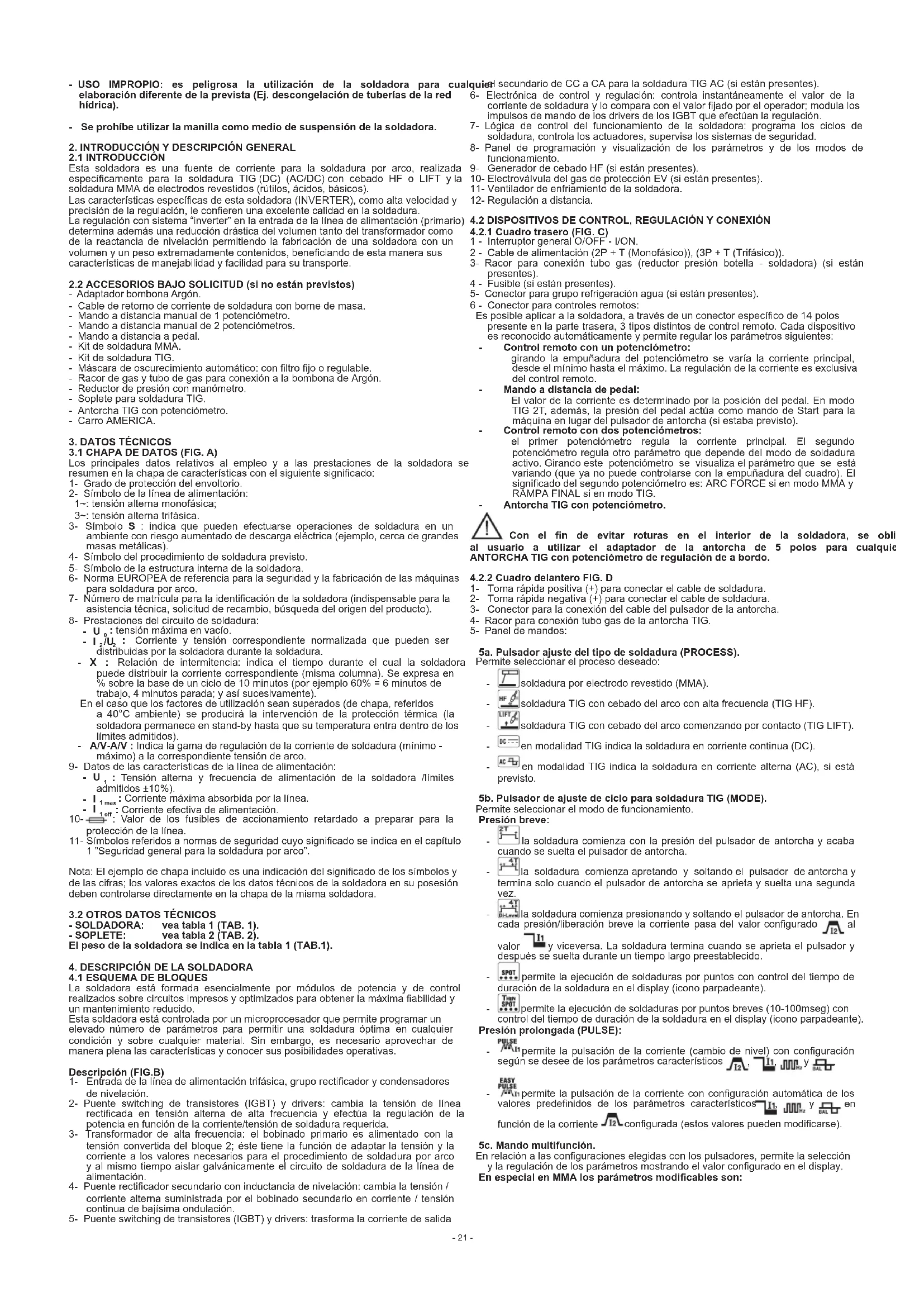 2.1INTRODUCCIÓN Esta soldadora es una fuente de corriente para la soldadura por arco, realizada especícamente para la soldadura TIG (DC) (AC/DC) con cebado HF o LIFT y la soldadura MMA de electrodos revestidos (rútilos, ácidos, básicos). Las características especícas de esta soldadora (INVERTER), como alta velocidad y precisión de la regulación, le coneren una excelente calidad en la soldadura. La regulación con sistema “inverter” en la entrada de la línea de alimentación (primario) determina además una reducción drástica del volumen tanto del transformador como de la reactancia de nivelación permitiendo la fabricación de una soldadora con un volumen y un peso extremadamente contenidos, beneciando de esta manera sus características de manejabilidad y facilidad para su transporte. 2.2ACCESORIOSBAJOSOLICITUD(sinoestánprevistos) - Adaptador bombona Argón. - Cable de retorno de corriente de soldadura con borne de masa. - Mando a distancia manual de 1 potenciómetro. - Mando a distancia manual de 2 potenciómetros. - Mando a distancia a pedal. - Kit de soldadura MMA. - Kit de soldadura TIG. - Máscara de oscurecimiento automático: con ltro jo o regulable. - Racor de gas y tubo de gas para conexión a la bombona de Argón. - Reductor de presión con manómetro. - Soplete para soldadura TIG. - Antorcha TIG con potenciómetro. - Carro AMERICA. 3.DATOSTÉCNICOS 3.1CHAPADEDATOS(FIG.A) Los principales datos relativos al empleo y a las prestaciones de la soldadora se resumen en la chapa de características con el siguiente signicado: