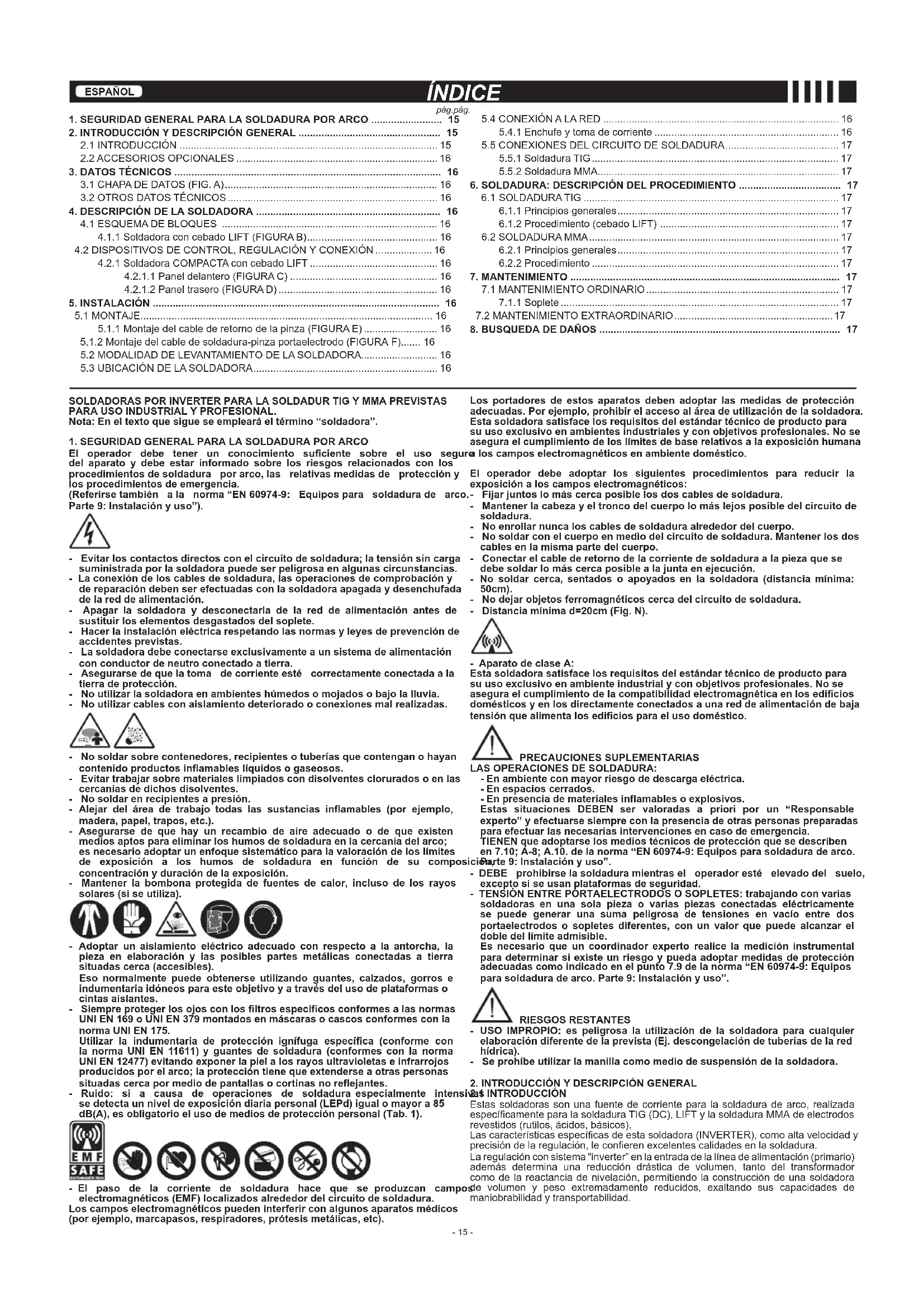 2.1INTRODUCCIÓN Estas soldadoras son una fuente de corriente para la soldadura de arco, realizada especícamente para la soldadura TIG (DC), LIFT y la soldadura MMA de electrodos revestidos (rutilos, ácidos, básicos). Las características especícas de esta soldadora (INVERTER), como alta velocidad y precisión de la regulación, le coneren excelentes calidades en la soldadura. La regulación con sistema “inverter” en la entrada de la línea de alimentación (primario) además determina una reducción drástica de volumen, tanto del transformador como de la reactancia de nivelación, permitiendo la construcción de una soldadora de volumen y peso extremadamente reducidos, exaltando sus capacidades de maniobrabilidad y transportabilidad.- 16 - 2.2ACCESORIOSOPCIONALES - kit soldadura MMA. - Kit soldadura TIG. - Adaptador bombona Argón. - Reductor de presión. - Antorcha TIG. - Máscara autooscurante: con ltro jo o ajustable. - Cable de retorno de la corriente de soldadura completo con borne de masa. 3.DATOSTÉCNICOS 3.1CHAPADEDATOS(FIG.A) Los principales datos relativos al empleo y a las prestaciones de la soldadora se resumen en la chapa de características con el siguiente signicado: