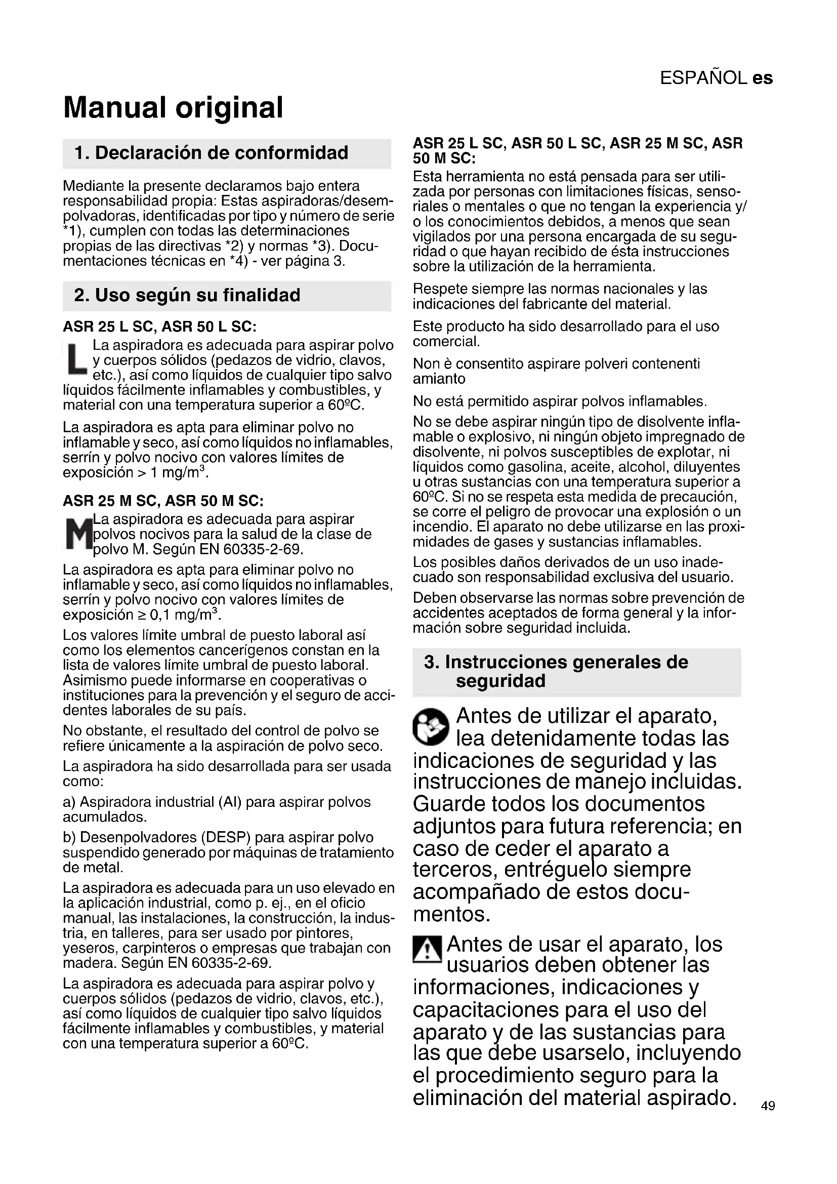 Manual original Mediante la presente declaramos bajo entera responsabilidad propia: Estas aspiradoras/desem- polvadoras, identificadas por tipo y número de serie *1), cumplen con todas las determinaciones propias de las directivas *2) y normas *3). Docu- mentaciones técnicas en *4) - ver página 3. ASR 25 L SC, ASR 50 L SC: La aspiradora es adecuada para aspirar polvo y cuerpos sólidos (pedazos de vidrio, clavos, etc.), así como líquidos de cualquier tipo salvo líquidos fácilmente inflamables y combustibles, y material con una temperatura superior a 60ºC. La aspiradora es apta para eliminar polvo no inflamable y seco, así como líquidos no inflamables, serrín y polvo nocivo con valores límites de exposición > 1 mg/m³. ASR 25 M SC, ASR 50 M SC: La aspiradora es adecuada para aspirar polvos nocivos para la salud de la clase de polvo M. Según EN 60335-2-69. La aspiradora es apta para eliminar polvo no inflamable y seco, así como líquidos no inflamables, serrín y polvo nocivo con valores límites de exposición ≥ 0,1 mg/m³. Los valores límite umbral de puesto laboral así como los elementos cancerígenos constan en la lista de valores límite umbral de puesto laboral. Asimismo puede informarse en cooperativas o instituciones para la prevención y el seguro de acci- dentes laborales de su país. No obstante, el resultado del control de polvo se refiere únicamente a la aspiración de polvo seco. La aspiradora ha sido desarrollada para ser usada como: a) Aspiradora industrial (AI) para aspirar polvos acumulados. b) Desenpolvadores (DESP) para aspirar polvo suspendido generado por máquinas de tratamiento de metal. La aspiradora es adecuada para un uso elevado en la aplicación industrial, como p. ej., en el oficio manual, las instalaciones, la construcción, la indus- tria, en talleres, para ser usado por pintores, yeseros, carpinteros o empresas que trabajan con madera. Según EN 60335-2-69. La aspiradora es adecuada para aspirar polvo y cuerpos sólidos (pedazos de vidrio, clavos, etc.), así como líquidos de cualquier tipo salvo líquidos fácilmente inflamables y combustibles, y material con una temperatura superior a 60ºC. ASR 25 L SC, ASR 50 L SC, ASR 25 M SC, ASR 50 M SC: Esta herramienta no está pensada para ser utili- zada por personas con limitaciones físicas, senso- riales o mentales o que no tengan la experiencia y/ o los conocimientos debidos, a menos que sean vigilados por una persona encargada de su segu- ridad o que hayan recibido de ésta instrucciones sobre la utilización de la herramienta. Respete siempre las normas nacionales y las indicaciones del fabricante del material. Este producto ha sido desarrollado para el uso comercial. Non è consentito aspirare polveri contenenti amianto No está permitido aspirar polvos inflamables. No se debe aspirar ningún tipo de disolvente infla- mable o explosivo, ni ningún objeto impregnado de disolvente, ni polvos susceptibles de explotar, ni líquidos como gasolina, aceite, alcohol, diluyentes u otras sustancias con una temperatura superior a 60ºC. Si no se respeta esta medida de precaución, se corre el peligro de provocar una explosión o un incendio. El aparato no debe utilizarse en las proxi- midades de gases y sustancias inflamables. Los posibles daños derivados de un uso inade- cuado son responsabilidad exclusiva del usuario. Deben observarse las normas sobre prevención de accidentes aceptados de forma general y la infor- mación sobre seguridad incluida. Antes de utilizar el aparato, lea detenidamente todas las indicaciones de seguridad y las instrucciones de manejo incluidas. Guarde todos los documentos adjuntos para futura referencia; en caso de ceder el aparato a terceros, entréguelo siempre acompañado de estos docu- mentos. Antes de usar el aparato, los usuarios deben obtener las informaciones, indicaciones y capacitaciones para el uso del aparato y de las sustancias para las que debe usarselo, incluyendo el procedimiento seguro para la eliminación del material aspirado.