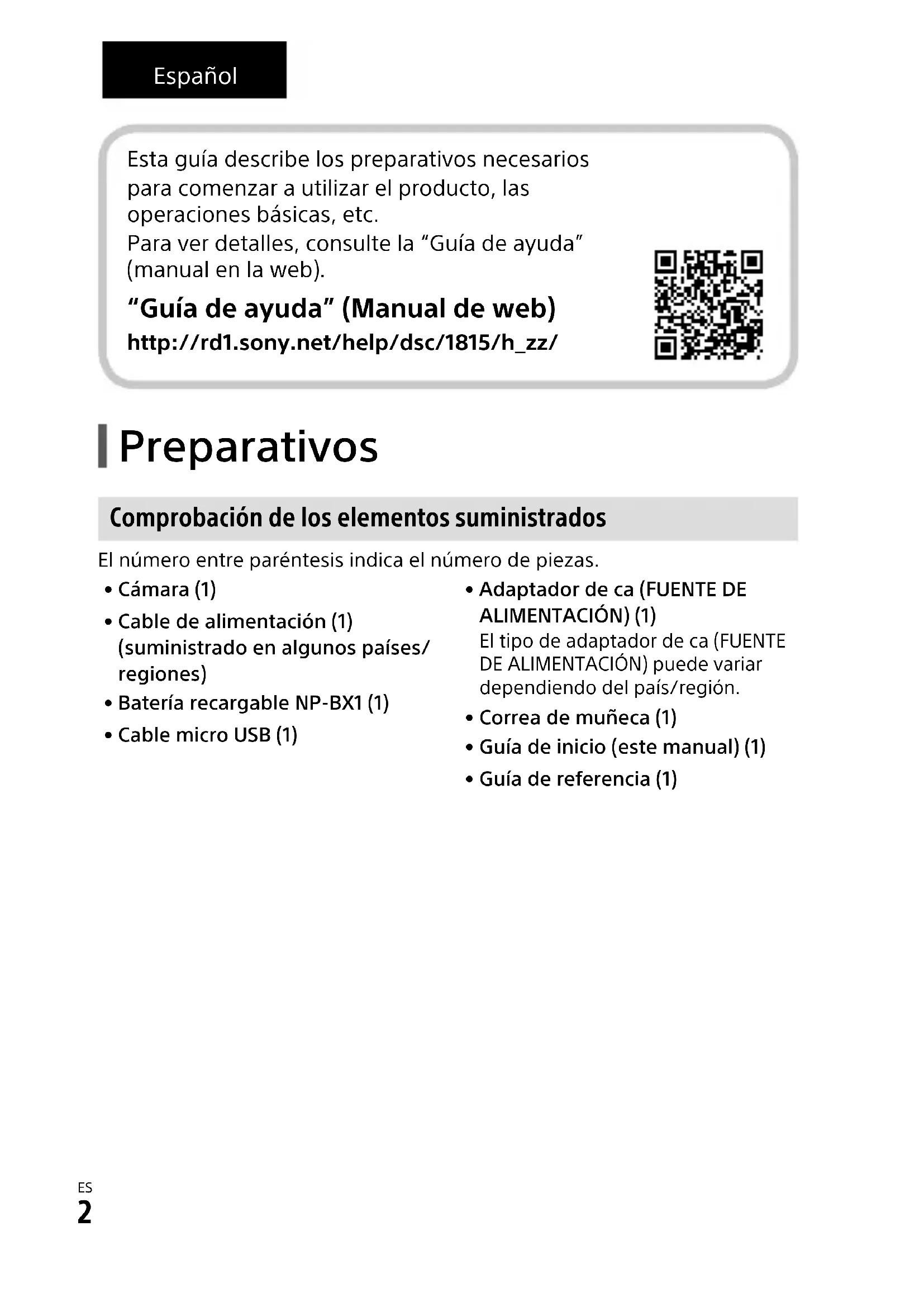 Español Preparativos Comprobación de los elementos suministrados El número entre paréntesis indica el número de piezas.• Cámara (1)• Cable de alimentación (1) (suministrado en algunos países/regiones)• Batería recargable NP-BX1 (1)• Cable micro USB (1)• Adaptador de ca (FUENTE DE ALIMENTACIÓN) (1)El tipo de adaptador de ca (FUENTE DE ALIMENTACIÓN) puede variar dependiendo del país/región.• Correa de muñeca (1)• Guía de inicio (este manual) (1)• Guía de referencia (1) Esta guía describe los preparativos necesarios para comenzar a utilizar el producto, las operaciones básicas, etc. Para ver detalles, consulte la “Guía de ayuda” (manual en la web). “Guía de ayuda” (Manual de web) http://rd1.sony.net/help/dsc/1815/h_zz/ES