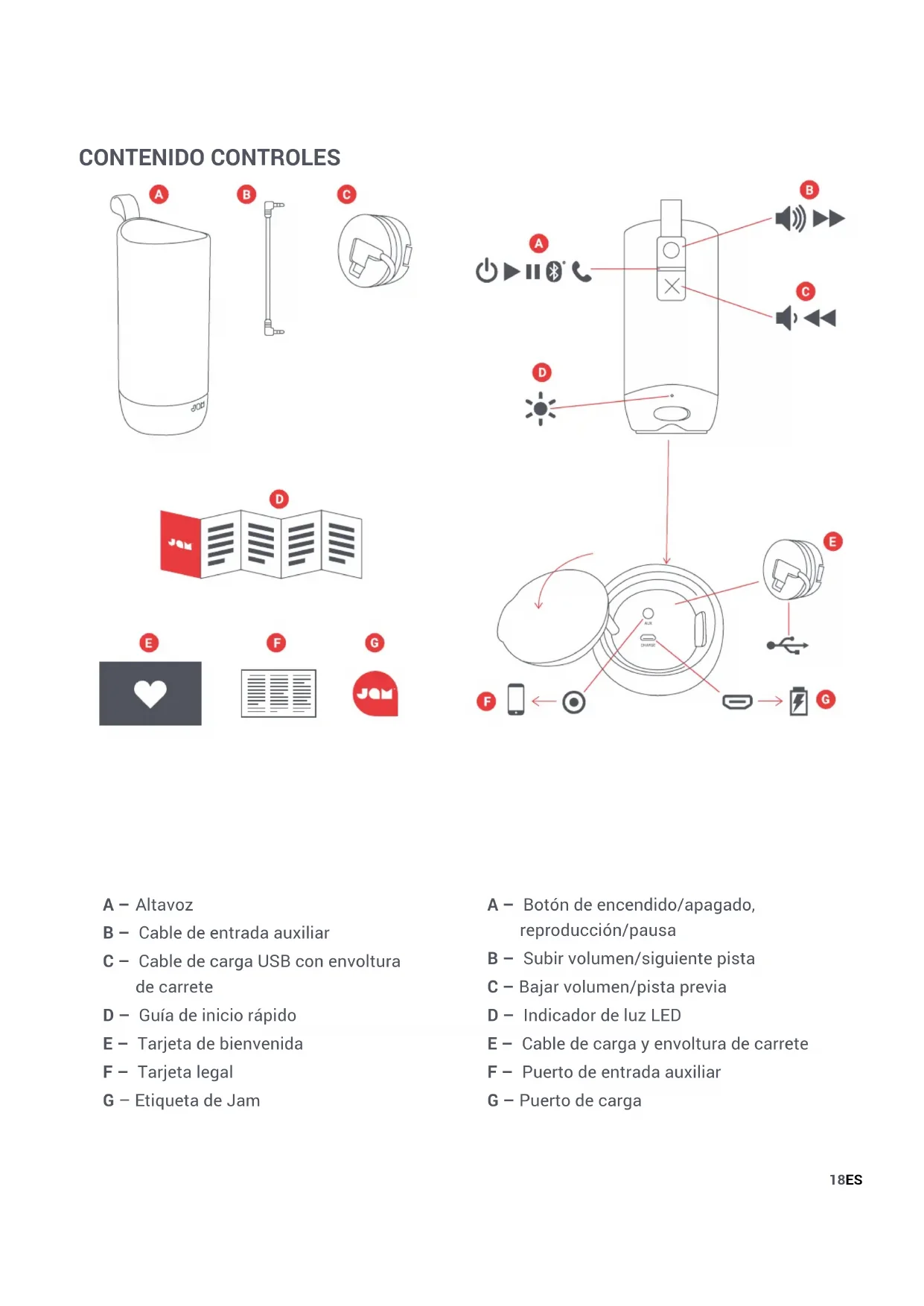 ”Zero Chill“ HX-P606 Libro de Instrucciones18ES CONTENIDO CONTROLES A – Altavoz B – Cable de entrada auxiliar C – Cable de carga USB con envoltura de carrete D – Guía de inicio rápido E – Tarjeta de bienvenida F – Tarjeta legal G – Etiqueta de Jam A – Botón de encendido/apagado, reproducción/pausa B – Subir volumen/siguiente pista C – Bajar volumen/pista previa D – Indicador de luz LED E – Cable de carga y envoltura de carrete F – Puerto de entrada auxiliar G – Puerto de carga19 CHARGE AUX CHARGE CONFIGURACIÓN 2hrs 12hrs 3 hrs 22 hrs