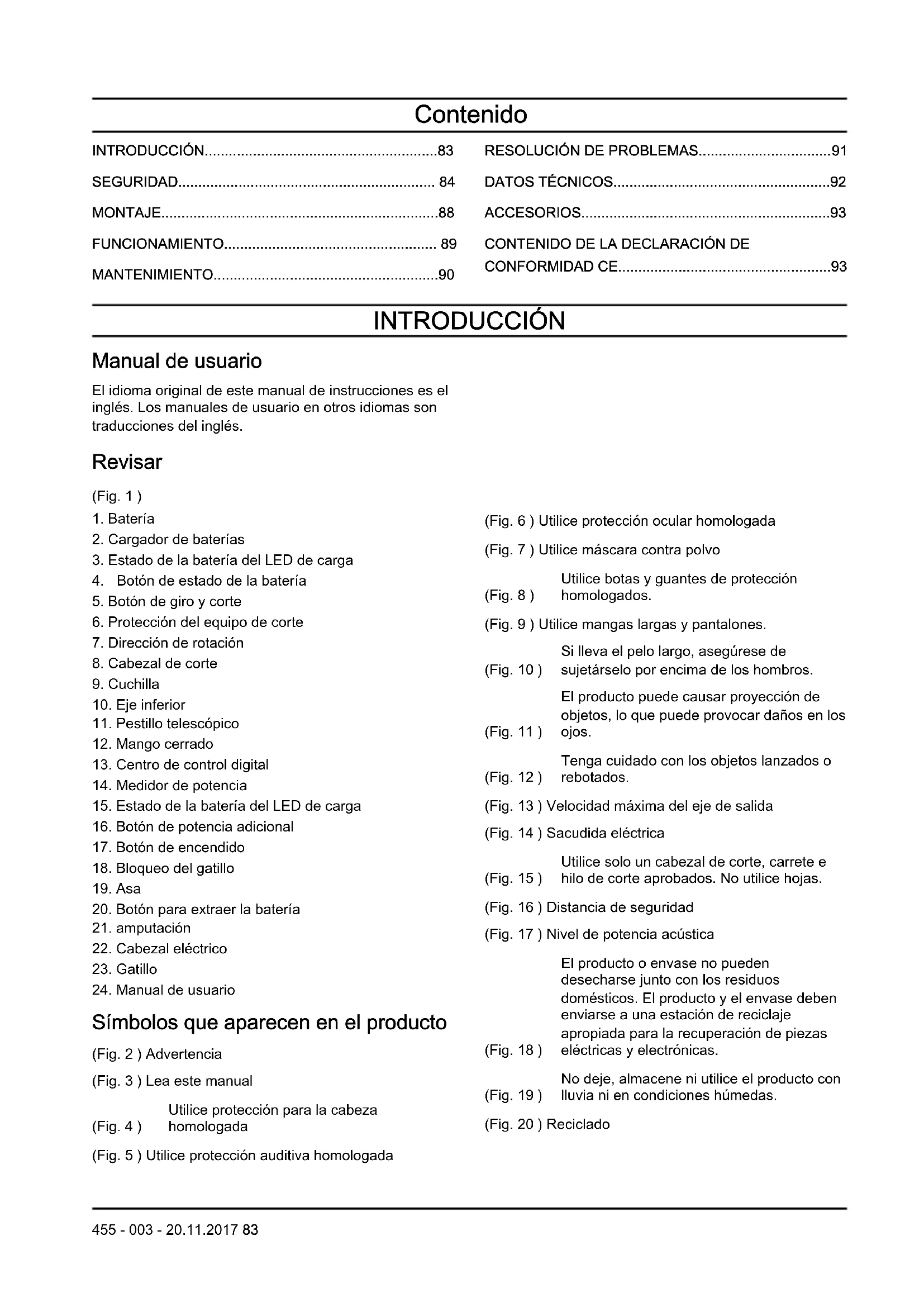 CONFORMIDAD CE.....................................................93 INTRODUCCIÓN Manual de usuario El idioma original de este manual de instrucciones es el inglés. Los manuales de usuario en otros idiomas son traducciones del inglés. Revisar (Fig. 1 )