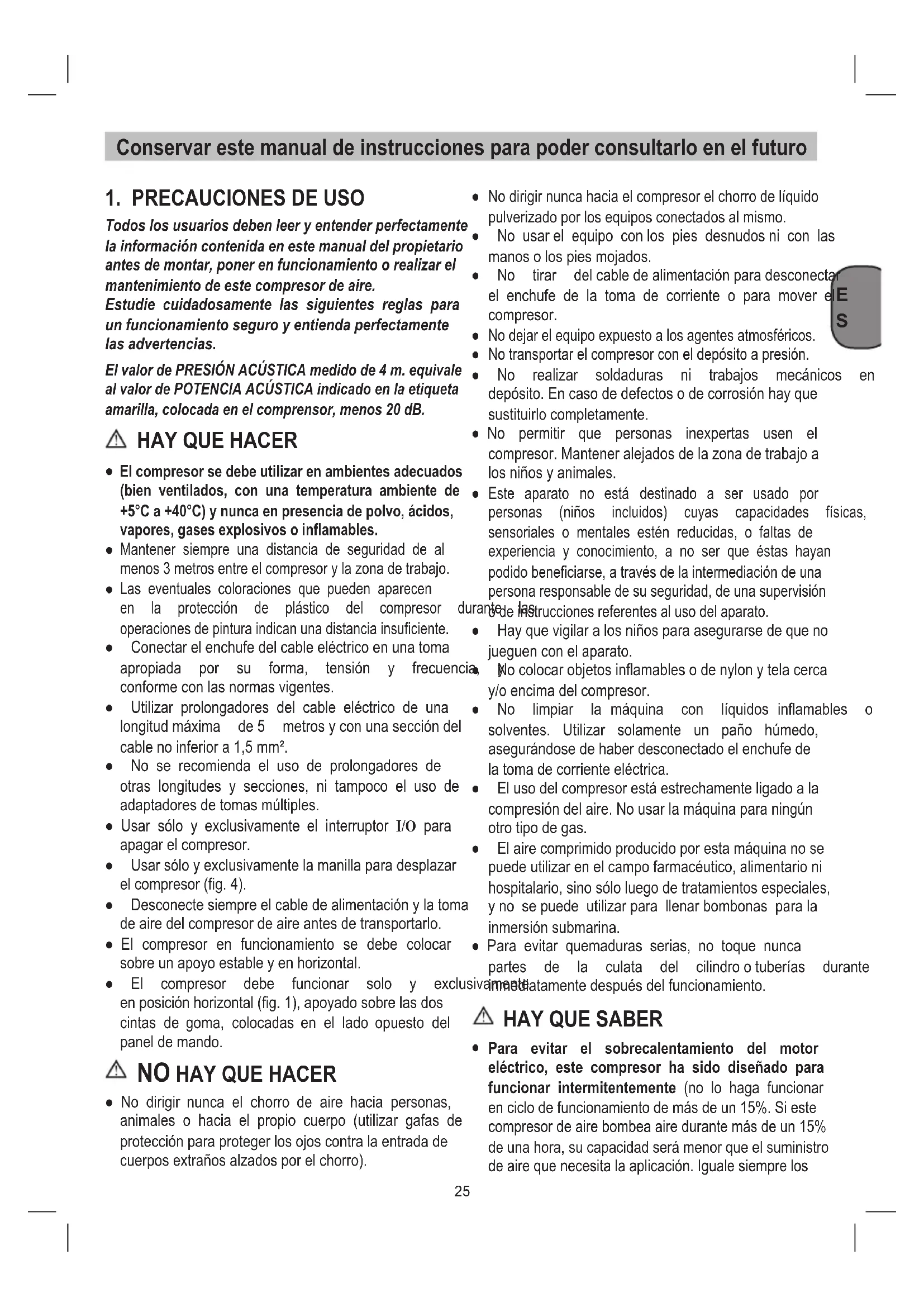 Este aparato no está destinado a ser usado por personas (niños incluidos) cuyas capacidades físicas, sensoriales o mentales estén reducidas, o faltas de experiencia y conocimiento, a no ser que éstas hayan podidobeneficiarse,atravésdelaintermediacióndeuna personaresponsabledesuseguridad,deunasupervisión odeinstruccionesreferentesalusodelaparato. ● Hay que vigilar a los niños para asegurarse de que no jueguenconelaparato. ● No colocar objetos inflamables o de nylon y tela cerca y/oencimadelcompresor. ● No limpiar la máquina con líquidos inflamables o solventes. Utilizar solamente un paño húmedo, asegurándosedehaberdesconectadoelenchufede latomadecorrienteeléctrica. ● Elusodelcompresorestáestrechamenteligadoala compresióndelaire.Nousarlamáquinaparaningún otrotipodegas. ● Elairecomprimidoproducidoporestamáquinanose puede utilizar en el campo farmacéutico, alimentario ni hospitalario,sinosóloluegodetratamientosespeciales, y no se puede utilizar para llenar bombonas para la inmersiónsubmarina. ● Para evitar quemaduras serias, no toque nunca partes de la culata del cilindrootuberías durante o inmediatamentedespuésdelfuncionamiento.