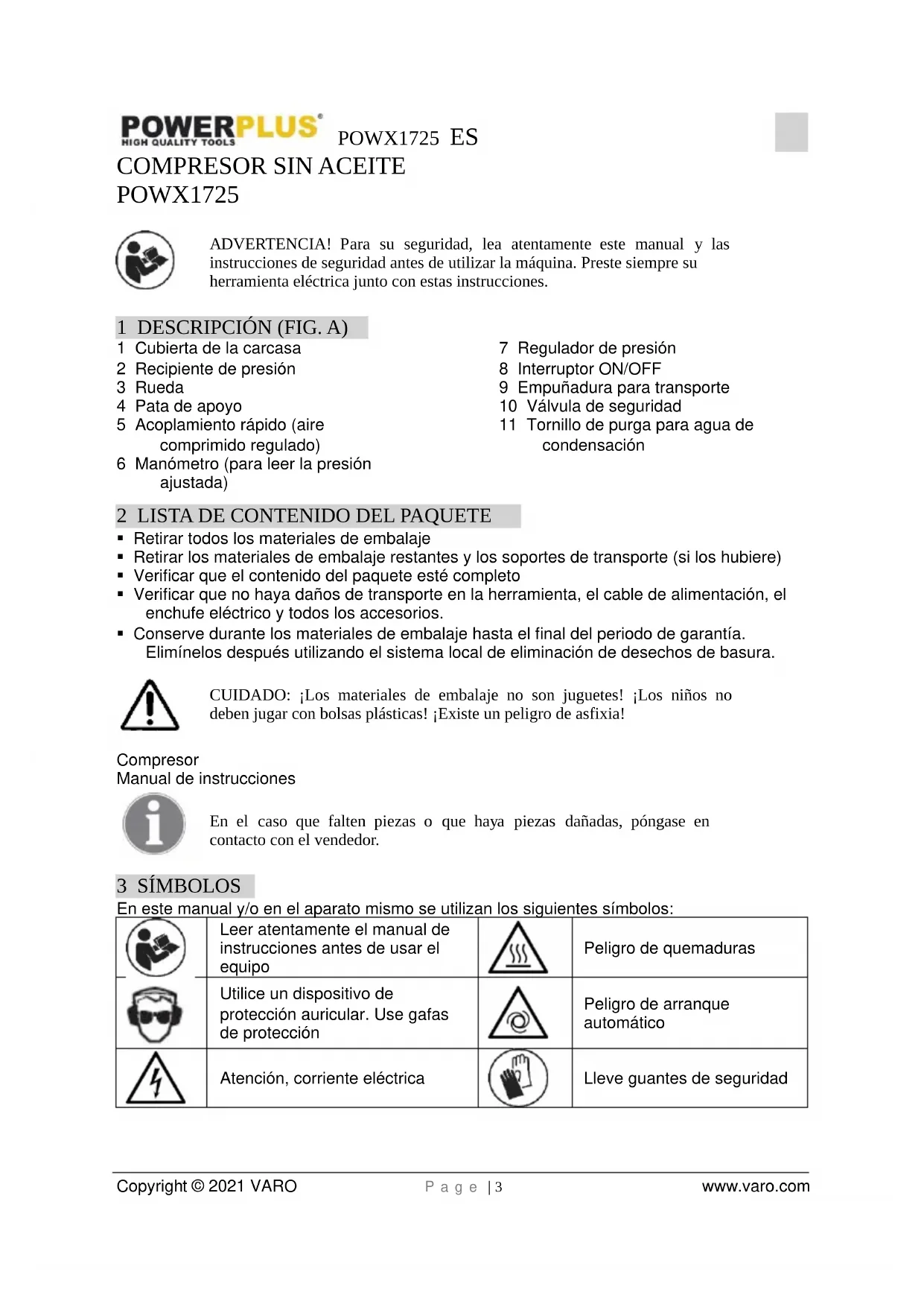 soplado Tanto el compresor como los conductos de alimentación alcanzan elevadas temperaturas durante el uso. El tocar dichas piezas produce quemaduras. Será preciso mantener los gases o vapors aspirados por el compresor libres de cualquier aditivo que pueda provocar un incendio o una explosión en el interior del aparato. Al aflojar el racor de conexión de la manguera es imprescindible sujetarlo con la mano para evitar cualquier accidente provocado por la fuerza de rebote de la manguera.POWX1725 ES Copyright © 2021 VARO P a g e | 6 www.varo.com Siempre que trabaje con la pistola pulverizadora deberá llevar gafas protectoras. Las piezas o partículas extrañas expulsadas y dispersadas durante la pulverización pueden provocar heridas. No apunte a personas con la pistola en funcionamiento, ni tampoco use el aire comprimido para limpiar ropa puesta.
