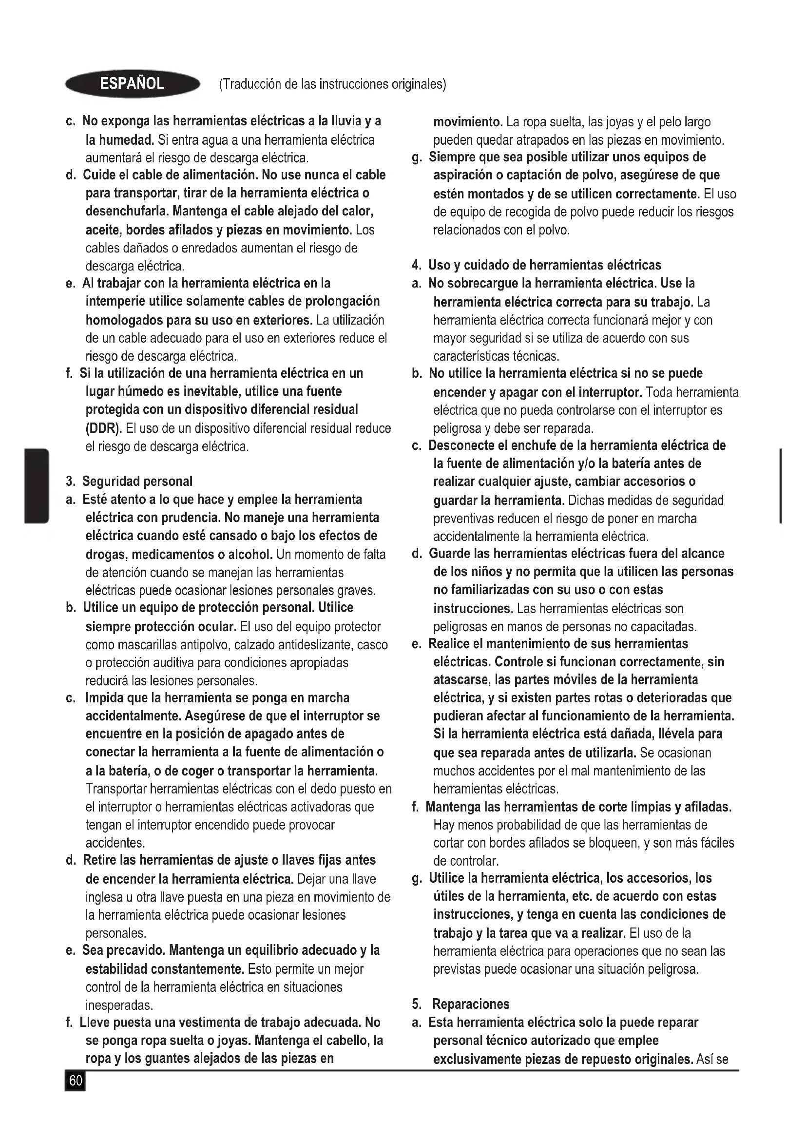 a. No sobrecargue la herramienta eléctrica. Use la herramienta eléctrica correcta para su trabajo. La herramienta eléctrica correcta funcionará mejor y con mayor seguridad si se utiliza de acuerdo con sus características técnicas. b. No utilice la herramienta eléctrica si no se puede encender y apagar con el interruptor. Toda herramienta eléctrica que no pueda controlarse con el interruptor es peligrosa y debe ser reparada. c. Desconecte el enchufe de la herramienta eléctrica de la fuente de alimentación y/o la batería antes de realizar cualquier ajuste, cambiar accesorios o guardar la herramienta. Dichas medidas de seguridad preventivas reducen el riesgo de poner en marcha accidentalmente la herramienta eléctrica. d. Guarde las herramientas eléctricas fuera del alcance de los niños y no permita que la utilicen las personas no familiarizadas con su uso o con estas instrucciones. Las herramientas eléctricas son peligrosas en manos de personas no capacitadas. e. Realice el mantenimiento de sus herramientas eléctricas. Controle si funcionan correctamente, sin atascarse, las partes móviles de la herramienta eléctrica, y si existen partes rotas o deterioradas que pudieran afectar al funcionamiento de la herramienta. Si la herramienta eléctrica está dañada, llévela para que sea reparada antes de utilizarla. Se ocasionan muchos accidentes por el mal mantenimiento de las herramientas eléctricas. f. Mantenga las herramientas de corte limpias y aladas. Hay menos probabilidad de que las herramientas de cortar con bordes alados se bloqueen, y son más fáciles de controlar. g. Utilice la herramienta eléctrica, los accesorios, los útiles de la herramienta, etc. de acuerdo con estas instrucciones, y tenga en cuenta las condiciones de trabajo y la tarea que va a realizar. El uso de la herramienta eléctrica para operaciones que no sean las previstas puede ocasionar una situación peligrosa.