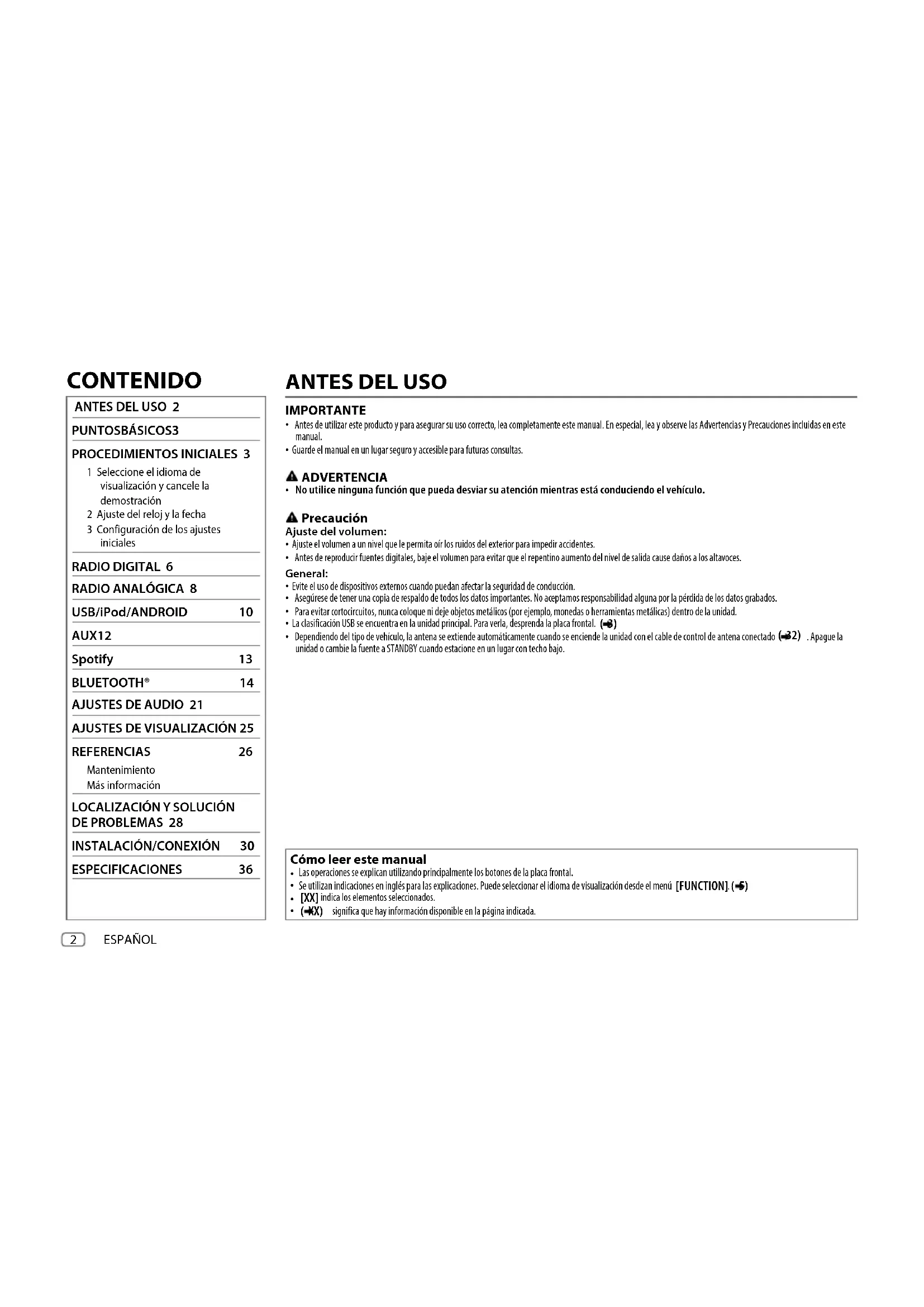 Dependiendo del tipo de vehículo, la antena se extiende automáticamente cuando se enciende la unidad con el cable de control de antena conectado ( 32) . Apague la unidad o cambie la fuente a STANDBY cuando estacione en un lugar con techo bajo. CONTENIDO