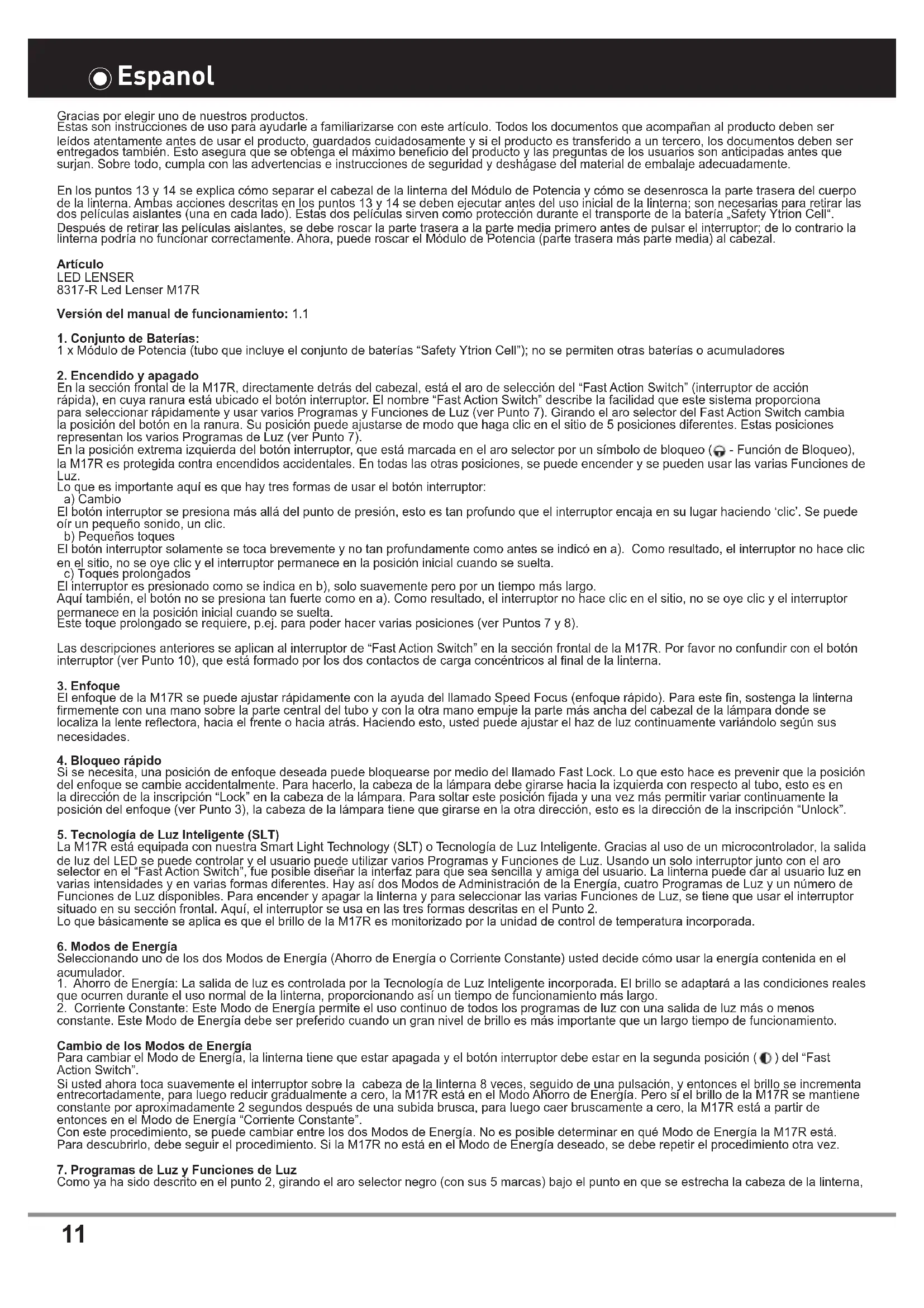 La M17R está equipada con vuestra Smart Light Technology (SLT) o Tecnología de Luz Inteligente. Gracias al uso de un microcontrolador, la calidad de luz del LED se pueda controlar y el usuario可以选择 usar various Programas y Funciones de Luz. Usando un solo interruptor junto con el arro selector en el "Fast Action Switch", fue possible encontrar la interfaz para que sea sencilla y amiga del usuario. La linterna pueda dar al usuario luz en varías intensidades y en varías formas differentes. Hay así dos Modos de Administración de la Energía, cuatro Programas de Luz y un número de Funciones de Luz disponibles. Para encender y apagar la linterna y para selección las varías Funciones de Luz, se Tiene que usar el interruptor situado en su sección frontal. Aquí, el interruptor se usa en las tres formas descritas en el Punto 2.