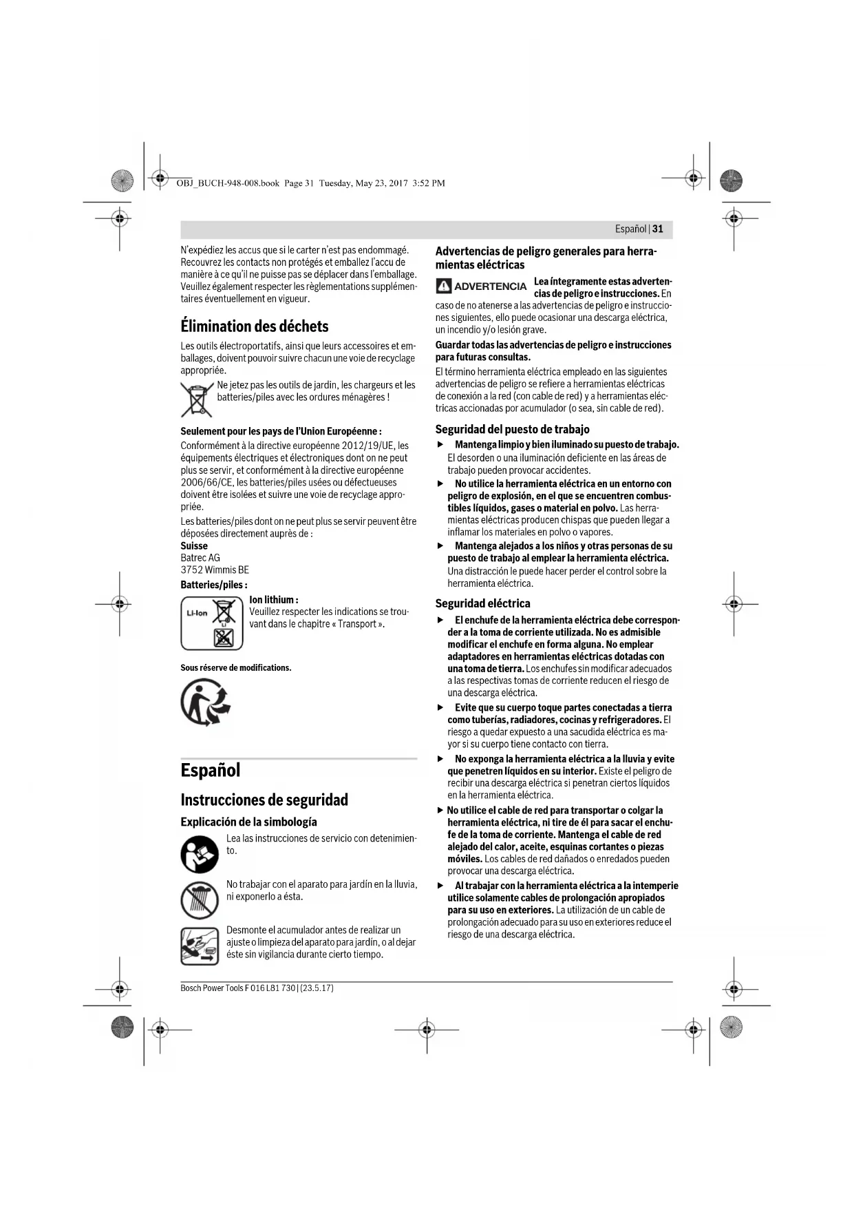 Asegúrese de que todas las tuercas, pernos y tornillos es- tán firmemente sujetos para garantizar un trabajo seguro con la tijera cortasetos. Guarde la tijera cortasetos en un lugar seco y situado a gran altura o que pueda cerrarse con llave, para que quede fue- ra del alcance de los niños. Como medida de seguridad cambie aquellas piezas que es- tén desgastadas o dañadas. No intente reparar el aparato para jardín a no ser que esté capacitado para ello. Únicamente deberán emplearse piezas de recambio origi- nales Bosch. Como protección contra contacto con las cuchillas en fun- cionamiento, la tijera cortasetos lleva dos empuñaduras, cada cual dotada con un interruptor propio. Para el funcio- namiento de la tijera cortasetos es necesario presionar si- multáneamente ambos interruptores. No use el aparato para jardín si éste funciona sin accionar ningún inte- rruptor, o bien, accionando uno solo. OBJ_BUCH-948-008.book Page 33 Tuesday, May 23, 2017 3:52 PM34 | Español F 016 L81 730 | (23.5.17) Bosch Power Tools Indicaciones para el trato óptimo del acumulador Antes de montar el acumulador asegúrese de que el aparato para jardín esté desconectado. El montaje del acumulador en un aparato para jardín conectado puede causar un accidente. Solamente utilice los acumuladores Bosch previstos para este aparato para jardín. El uso de otro tipo de acu- muladores puede acarrear lesiones e incluso un incendio. No intente abrir el acumulador. Podría provocar un cor- tocircuito. Proteja el acumulador del calor excesivo como, p. ej., de una exposición prolongada al sol, del fuego, del agua y de la humedad. Existe el riesgo de explosión. Si el acumulador se daña o usa de forma inapropiada puede que éste emane vapores. Ventile con aire fresco el recinto y acuda a un médico si nota alguna molestia. Los vapores pueden llegar a irritar las vías respiratorias. Únicamente utilice el acumulador en combinación con su producto Bosch. Solamente así queda protegido el acumulador contra una sobrecarga peligrosa. Mediante objetos puntiagudos, como p. ej. clavos o destornilladores, o por influjo de fuerza exterior se puede dañar el acumulador. Se puede generar un corto- circuito interno y el acumulador puede arder, humear, ex- plotar o sobrecalentarse. No cortocircuite el acumulador. Existe el riesgo de explo- sión. Proteja el acumulador de la humedad y del agua. Únicamente almacene el acumulador sin exceder el mar- gen de temperatura de –20 °C a 50 °C. P.ej., no deje el acumulador en el coche en verano. Limpie de vez en cuando las rejillas de refrigeración del acumulador con un pincel suave, limpio y seco. Instrucciones de seguridad para cargadores Lea íntegramente estas ad- vertencias de peligro e ins- trucciones. En caso de no atenerse a las advertencias de peligro e instrucciones siguientes, ello puede ocasionar una descarga eléctrica, un incendio y/o lesión grave. Guarde estas instrucciones en un lu- gar seguro. Únicamente utilice el cargador si cono- ce y domina todas sus funciones, o si ha sido instruido al respecto. Este cargador no está previsto pa- ra la utilización por niños y perso- nas con limitadas capacidades físi- cas, sensoriales o intelectuales o con falta de experiencia y conoci- mientos. Este cargador puede ser utilizado por niños desde 8 años y por personas con limitadas capaci- dades físicas, sensoriales e intelec- tuales o con falta de experiencia y conocimientos siempre y cuando estén vigilados por una persona responsable de su seguridad o ha- yan sido instruidos en la utilización segura del cargador y entendido los peligros inherentes. En caso contrario, existe el peligro de un ma- nejo erróneo y lesiones. Vigíle a los niños durante la utiliza- ción, la limpieza y el mantenimien- to. Así se asegura, que los niños no jueguen con el cargador. Cargue solamente acumuladores de iones de litio Bosch a partir de una capacidad de 1,3 Ah (desde 10 elementos de acumulador). La tensión del acumulador debe co- rresponder a la tensión de carga de acumuladores del cargador. No cargue baterías no recargables. En caso contrario existe peligro de in- cendio y explosión. No exponga el cargador a la lluvia ni a la hume- dad. La penetración de agua en el cargador au- menta el riesgo de electrocución. Solamente cargue acumuladores de iones de litio Bosch. La tensión del acumulador debe corresponder a la tensión de carga de acumuladores del cargador. En caso contrario existe peligro de incendio y explosión. OBJ_BUCH-948-008.book Page 34 Tuesday, May 23, 2017 3:52 PMEspañol | 35 Bosch Power Tools F 016 L81 730 | (23.5.17) Siempre mantenga limpio el cargador. La suciedad pue- de comportar un riesgo de electrocución. Antes de cada utilización verificar el estado del carga- dor, cable y enchufe. No utilice el cargador en caso de detectar algún desperfecto. Jamás intente abrir el car- gador por su propia cuenta, y solamente hágalo reparar por personal técnico cualificado empleando exclusiva- mente piezas de repuesto originales. Un cargador, cable y enchufe deteriorados comportan un mayor riesgo de electrocución. No utilice el cargador sobre una base fácilmente infla- mable (p.ej. papel, tela, etc.) ni en un entorno inflama- ble. Puesto que el cargador se calienta durante el proceso de carga existe un peligro de incendio. No obture las rendijas de ventilación del cargador. En caso contrario, el cargador se puede sobrecalentar y dejar de funcionar correctamente. El enchufe macho de conexión, debe ser conectado so- lamente a un enchufe hembra de las mismas caracteris- ticas técnicas del enchufe macho en materia. Mantenimiento Desmonte el acumulador antes de realizar un ajuste o limpieza del aparato para jardín, o al dejar éste sin vigi- lancia durante cierto tiempo. Póngase siempre unos guantes de protección al manipular o trabajar en el área de las cuchillas. Siempre mantenga limpio el aparato para jardín para trabajar con eficacia y segurida