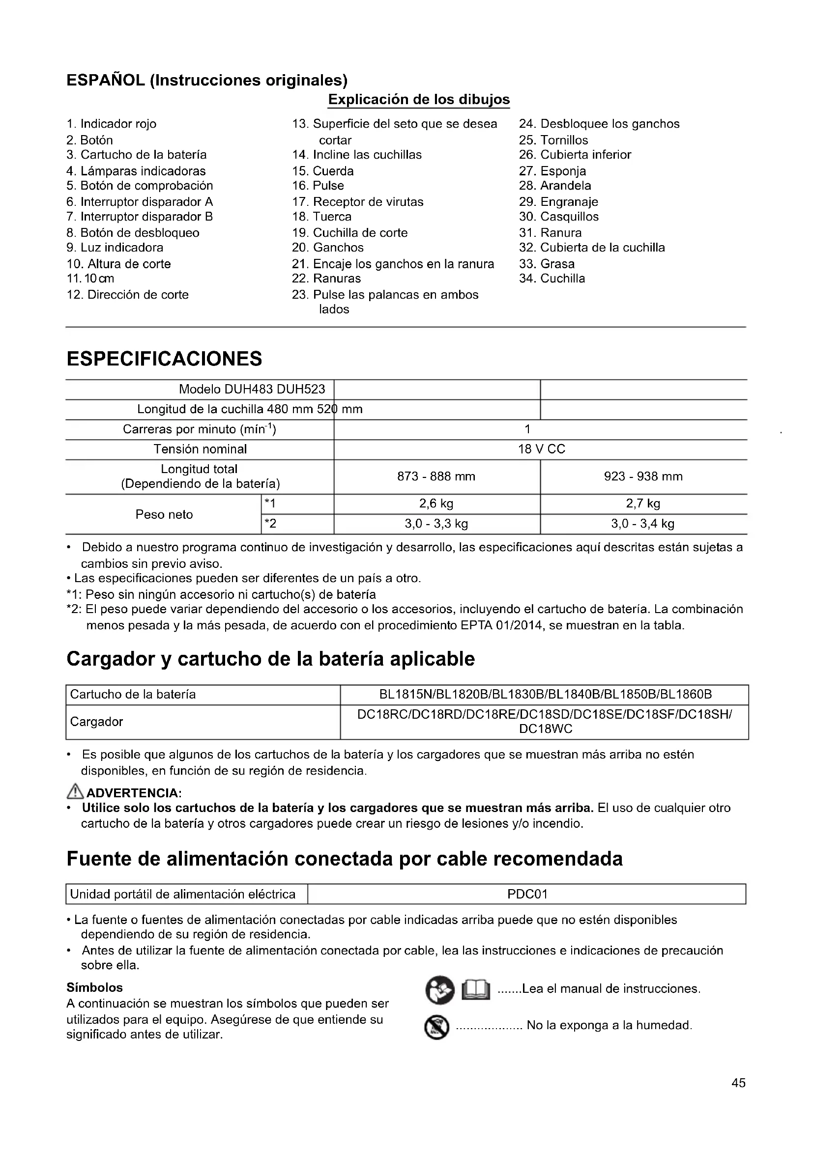 Peso neto *1 2,6 kg 2,7 kg *2 3,0 - 3,3 kg 3,0 - 3,4 kg Cartucho de la batería BL1815N/BL1820B/BL1830B/BL1840B/BL1850B/BL1860B Cargador DC18RC/DC18RD/DC18RE/DC18SD/DC18SE/DC18SF/DC18SH/ DC18WC Unidad portátil de alimentación eléctrica PDC0146 .................. Póngase protección para ojos. ................... PELIGRO - Mantenga las manos alejadas de la cuchilla. ................... Utilice protección para los ojos y oídos. ................... No exponer a la lluvia. ............ Sólo para países de la Unión Europea Debido a la presencia de componentes peligrosos en el equipo, el equipo eléctrico y electrónico, los acumuladores y las baterías desechados pueden tener un impacto negativo para el medioambiente y la salud humana. ¡No tire los aparatos eléctricos y electrónicos ni las baterías junto con los residuos domésticos! De conformidad con las Directivas Europeas sobre residuos de aparatos eléctricos y electrónicos y sobre acumuladores y baterías y residuos de acumuladores y baterías, así como la adaptación de las mismas a la ley nacional, el equipo eléctrico, las baterías y los acumuladores desechados deberán ser almacenados por separado y trasladados a un punto distinto de recogida de desechos municipales, que cumpla con los reglamentos sobre protección medioambiental. Esto se indica mediante el símbolo de cubo de basura tachado colocado en el equipo. ................. Nivel de potencia del sonido garantizado de acuerdo con la Directiva UE sobre ruido ambiental. ................. Nivel de potencia del sonido de acuerdo con el reglamento para el control de ruido en NSW, Australia Uso previsto ENE014-1 La herramienta está diseñada para cortar setos. Advertencias de seguridad para herramientas eléctricas en general GEA010-2 ADVERTENCIA: Lea todas las advertencias de seguridad, instrucciones, ilustraciones y especificaciones provistas con esta herramienta eléctrica. Si no sigue todas las instrucciones indicadas abajo podrá resultar en una descarga eléctrica, un incendio y/o heridas graves. Guarde todas las advertencias e instrucciones para futuras referencias. El término “herramienta eléctrica” en las advertencias se refiere a su herramienta eléctrica de funcionamiento con conexión a la red eléctrica (con cable) o herramienta eléctrica de funcionamiento a batería (sin cable). Advertencias de seguridad para el cortasetos inalámbrico GEB278-1