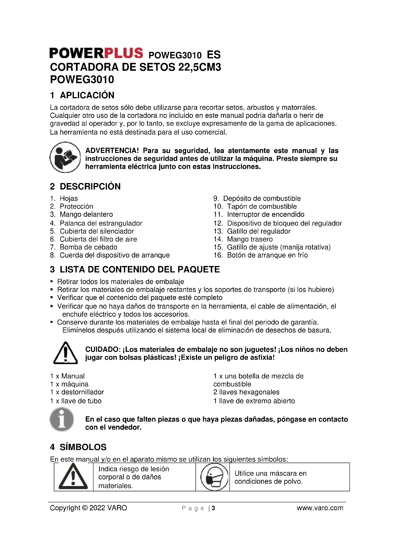 - Mantenga su distancia. La cortadora de setos emite humos de escape. Asegúrese que los espectadores se mantienen a una distancia segura.POWEG3010 ES Copyright © 2022 VARO P a g e | 6 www.varo.com