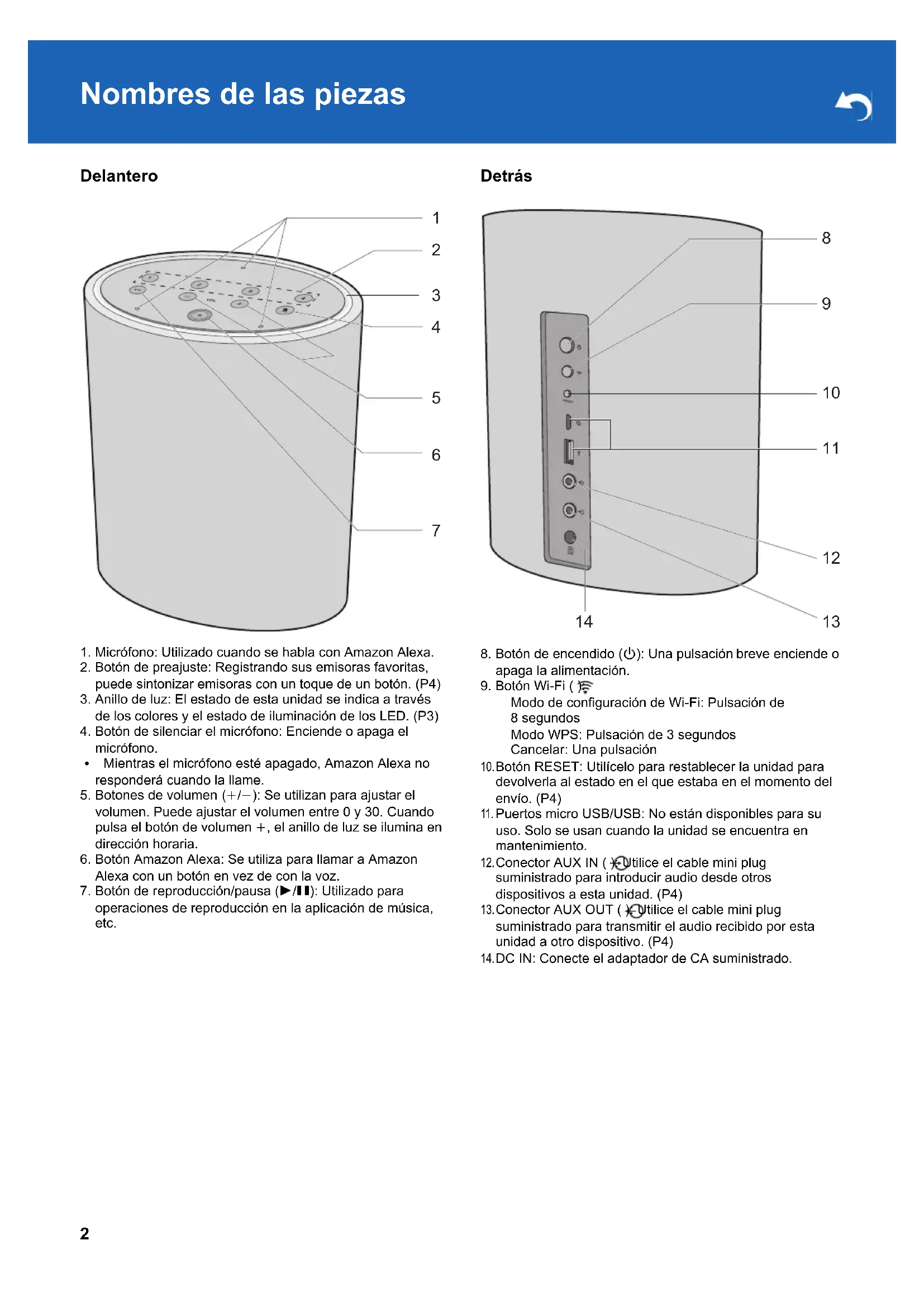 registre la unidad con Amazon Alexa. Entre en su cuenta Amazon y registre esta unidad. 0 También puede registrarse con Amazon Alexa más tarde. Toque " " en la pantalla Home de la aplicación, seleccione "Amazon Alexa" y registre esta unidad. 0 Consulte "Uso Amazon Alexa" (P4) para información sobre cómo usar Amazon Alexa. Comprobación del estado de esta unidad El estado de iluminación y parpadeo del anillo de luz de la parte superior de la unidad le permite ver el estado de la unidad. Music Control El anillo de luz se ilumina en azul y una luz de un azul más brillante gira alrededor del anillo Iniciando Todo apagado En espera El anillo de luz se ilumina en naranja y rota Conectado por Wi-Fi Se ilumina en blanco Ajuste del volumen MusicControlPlay-Fi MusicControlPlay-Fi4 Operación de la unidad Uso Amazon Alexa Colóquese delante de la unidad y diga "Alexa" o pulse el botón Amazon Alexa para activar Amazon Alexa Voice Service. Cuando haya hablado a la unidad y Alexa haya reconocido una pregunta, el anillo de luz se iluminará en azul y una luz azul más brillante girará alrededor del anillo. Alexa responde la pregunta después de un rato. 0 Alexa no responderá si el micrófono está apagado, incluso aunque la llame. Registrar una emisora Puede registrar hasta un máximo de 4 emisoras de radio favoritas. Registrando las emisoras, podrá activarlas con un toque de un botón. Realice el siguiente procedimiento cuando la unidad esté encendida.