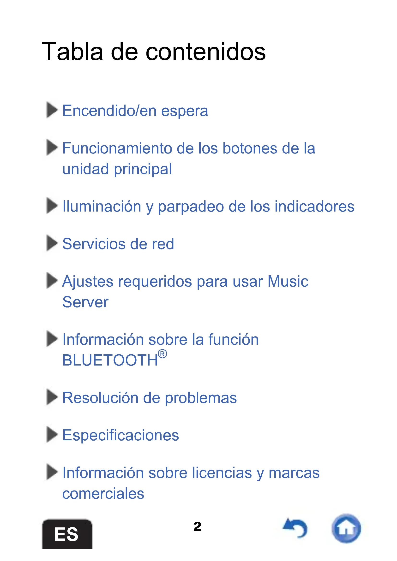 Tabla de contenidos Encendido/en espera Funcionamiento de los botones de la unidad principal Iluminación y parpadeo de los indicadores Servicios de red Ajustes requeridos para usar Music Server Información sobre la función BLUETOOTH