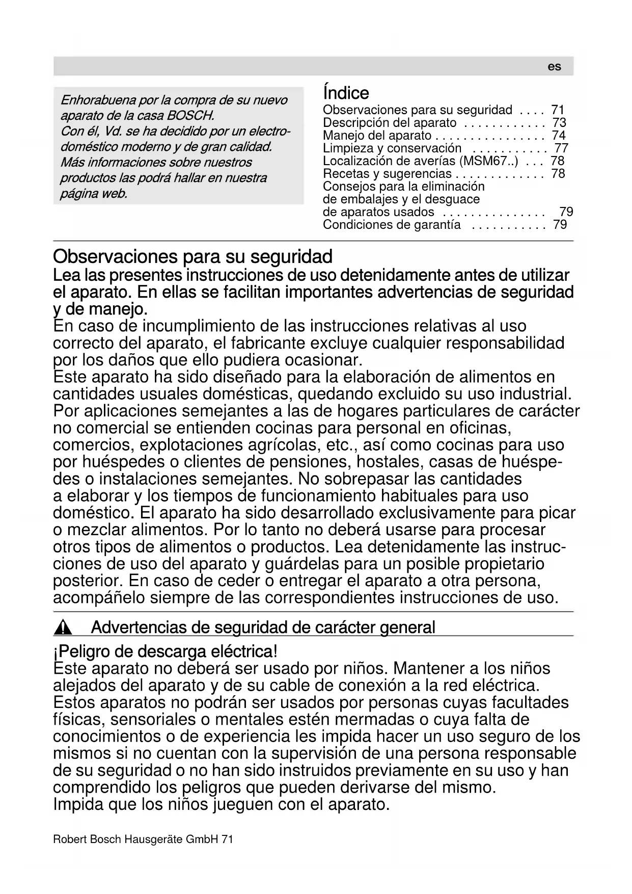 - Condiciones de garantía Observaciones para su seguridad Lea las presentes instrucciones de uso detenidamente antes de utilizar el aparato. En ellas se facilitan importantes advertencias de seguridad y de manejo. En caso de incumplimiento de las instrucciones relativas al uso correcto del aparato, el fabricante excluye cualquier responsabilidad por los daños que ello pudiera ocasionar. Este aparato ha sido diseñado para la elaboración de alimentos en cantidades usuales domésticas, quedando excluido su uso industrial. Por aplicaciones semejantes a las de hogares particulares de carácter no comercial se entienden cocinas para personal en oficinas, comercios, explotaciones agrícolas, etc., así como cocinas para uso por huéspedes o clientes de pensiones, hostales, casas de huéspe- des o instalaciones semejantes. No sobrepasar las cantidades a elaborar y los tiempos de funcionamiento habituales para uso doméstico. El aparato ha sido desarrollado exclusivamente para picar o mezclar alimentos. Por lo tanto no deberá usarse para procesar otros tipos de alimentos o productos. Lea detenidamente las instruc- ciones de uso del aparato y guárdelas para un posible propietario posterior. En caso de ceder o entregar el aparato a otra persona, acompáñelo siempre de las correspondientes instrucciones de uso. , Advertencias de seguridad de carácter general ¡Peligro de descarga eléctrica! Este aparato no deberá ser usado por niños. Mantener a los niños alejados del aparato y de su cable de conexión a la red eléctrica. Estos aparatos no podrán ser usados por personas cuyas facultades físicas, sensoriales o mentales estén mermadas o cuya falta de conocimientos o de experiencia les impida hacer un uso seguro de los mismos si no cuentan con la supervisión de una persona responsable de su seguridad o no han sido instruidos previamente en su uso y han comprendido los peligros que pueden derivarse del mismo. Impida que los niños jueguen con el aparato. p. 79