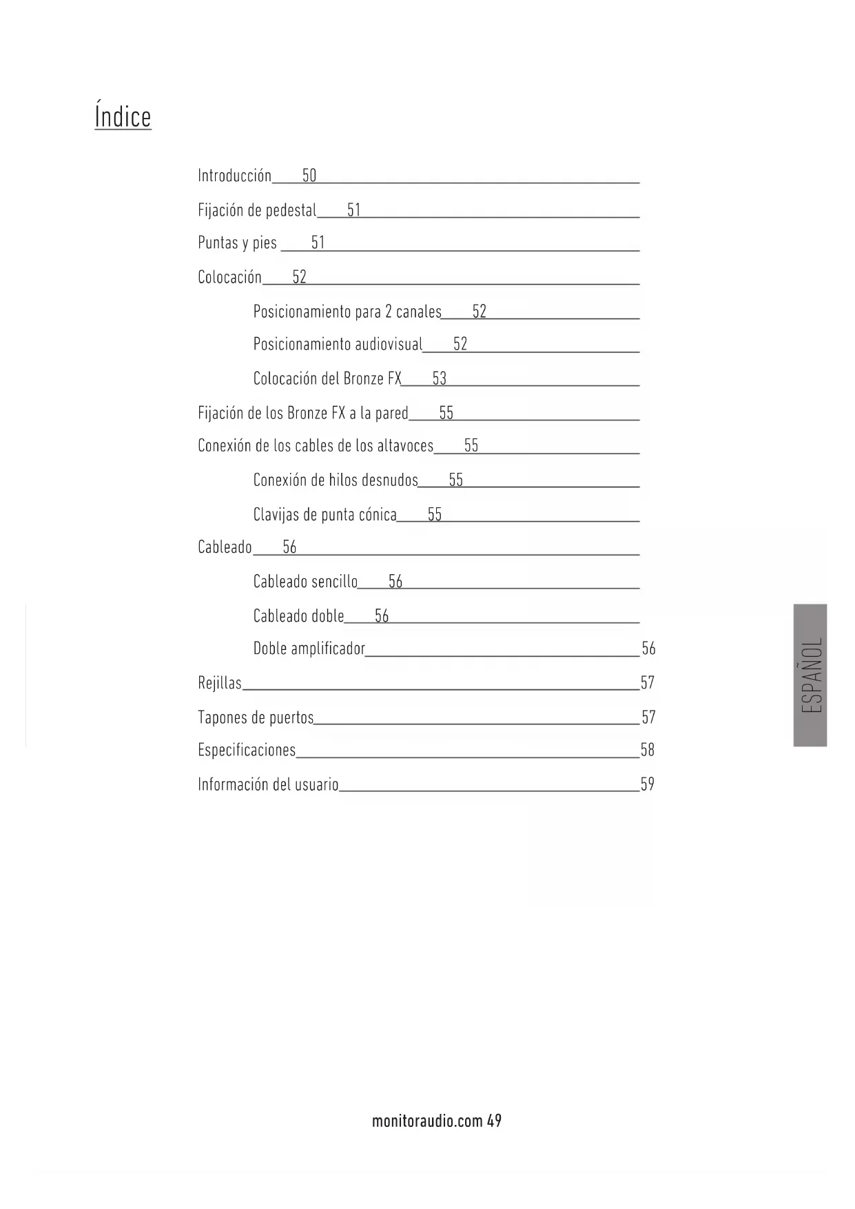11/16 x 9 1/4 x 13 3/4 Zoll K/A K/A Gewicht (pro Gerät) 3,5 kg (7 lb 12 oz) 5,3 kg (11 lb 10 oz) 11 kg (24 lb 6 oz) 16,6 kg (36 lb 8 oz) 5,6 kg (12 lb 6 oz) 3,2 kg (7 lb) Oberflächenausführungen Schwarzeiche, Weißesche, Nussbaum, RosemahDEutSCH monitoraudio.com 47 Eigentümerinformationen Produktangaben Modell Produkt-Seriennummer Kaufdatum Händlerinformationen Händlername Anschrift E-Mail-Adresse Telefonnummer Monitor Audio behält sich das Recht vor, die technischen Daten ohne vorherige Ankündigung zu ändern. Für die 5 Jahre Hersteller-Garantie rufen Sie bitte das Online-Anmeldeformular auf: www.monitoraudio.com Monitor Audio Ltd. 24 Brook Road Rayleigh, Essex SS6 7XJ England Tel.: +44 (0)1268 740580 Fax: +44 (0)1268 740589 E-Mail: info@monitoraudio.co.uk Internet: www.monitoraudio.com Geplant und entwickelt im Vereinigten Königreich Hergestellt in ChinaBronze Series48 Manual del usuario BRONZE SERIES BRONZE 1 BRONZE 2 BRONZE 5 BRONZE 6 BRONZE CENTRE BRONZE FX BRONZE W10 BRONZE SERIES BRONZE 1 BRONZE 2 BRONZE 5 BRONZE 6 BRONZE CENTRE BRONZE FX BRONZE W10ESpAñoL monitoraudio.com 49 Índice Introducción 50 Fijación de pedestal 51 Puntas y pies 51 Colocación 52 Posicionamiento para 2 canales 52 Posicionamiento audiovisual 52 Colocación del Bronze FX 53 Fijación de los Bronze FX a la pared 55 Conexión de los cables de los altavoces 55 Conexión de hilos desnudos 55 Clavijas de punta cónica 55 Cableado 56 Cableado sencillo 56 Cableado doble 56 Dobleamplicador 56 Rejillas 57 Tapones de puertos 57 Especicaciones 58 Información del usuario 59Bronze Series50 Introducción Le presentamos la serie Bronze, el sistema de altavoces más asequible de MonitorAudio. En él se conjugan lo mejor de sus predecesores, galardonados con numerosos premios, y la avanzada tecnología de la que hacen gala las gamas superiores Silver y Platinum. La serie Bronze supera claramente los estándares de rendimiento y calidad que podrían esperarse de una gama de entrada. Gracias al uso de simulaciones por ordenador más precisas y al uso de estructuras y materiales aún más renados, hemos sido capaces de introducir ligeras mejoras en nuestra aclamada gama Bronze BX hasta alcanzar un nuevo hito en la industria. Su sucesora, la serie Bronze, ofrece un sonido increíblemente preciso y con un dinamismo natural que la sitúan a un nivel muy superior respecto a la capacidad de muchos otros rivales más caros. En la serie Bronze, las ventajas resultantes de nuestra incesante búsqueda de la pureza musical se consagran al disfrute de música y películas. El diseño de la serie Bronze también ofrece unos resultados espectaculares en cuanto al aspecto estético. La ecacia y precisión superiores obtenidas a partir de pruebas exhaustivas y de la información recopilada son utilizadas por nuestros equipos para crear una hermosa mezcla de imponente delidad y esbelto diseño que es reejo del más puro espíritu de MonitorAudio. Aunque pueda parecer paradójico al hablar de una gama de entrada, la serie Bronze se sitúa en un nivel aparte. Con sus resplandecientes acabados de vinilo, denominados Ceniza blanca, Roble negro, Rosemah y Nogal, cualquiera de los siete modelos de la serie Bronze lucirá fantástico en cualquier habitación. Todos han sido fabricados con una precisión de la que es sinónimo MonitorAudio en todo el mundo. Detrás de su sutil elegancia hay un diseño ergonómico y sosticado, con estructuras multicámara en las cajas acústicas cuyo n es optimizar el rendimiento de los transductores, conexiones de alta calidad para una mayor facilidad de uso y una transferencia perfecta de la señal, así como soportes de suelo discretos y maquinados con precisión que coneren una estabilidad magníca.ESpAñoL monitoraudio.com 51 Fijación de pedestal (solo Bronze 5 y 6) Los modelos Bronze 5 y 6 llevan pedestales para mejorar la estabilidad y la respuesta acústica. Los pedestales van sujetos en su sitio mediante los pernos suministrados. Antes de colocar el pedestal, asegúrese de que la supercie del suelo esté despejada de objetos duros o alados. Para acoplar el pedestal, ponga la caja acústica boca abajo. Coloque el pedestal en la caja acústica y alinee los oricios de los pernos con las piezas de inserción de la caja acústica. Use los pernos para sujetar el pedestal a la caja acústica. Apriételos poco a poco al principio y asegúrese de que el pedestal quede bien jado a la caja acústica. Acople los pies o las puntas al pedestal antes de darle la vuelta al altavoz. Puntas y pies Los soportes de suelo de la serie Bronze se suministran con puntas y pies de goma independientes. Las puntas deben utilizarse en supercies enmoquetadas y los pies de goma deben utilizarse en suelos duros donde las puntas no resulten apropiadas. Las puntas se enroscan en las piezas de inserción roscadas de la parte inferior del pedestal. Si no desea utilizar el pedestal, es posible jar las puntas directamente a la parte inferior de la caja acústica. Asegúrese de que no haya cables suelos en la ubicación donde coloque los altavoces. NOTA: La estabilidad de la caja se verá afectada si se utiliza sin el pedestal. Cuando lo utilice sobre suelo duro, los pies de goma se colocan en las mismas piezas de inserción que normalmente ocuparían las puntas.Bronze Series52 Colocación Posicionamiento para 2 canales Si se va a usar en un sistema de 2 canales, la posición de escucha y los altavoces deben formar un triángulo equilátero. Los altavoces deben colocarse con una separación aproximada de 1,8 - 3m. Lo ideal es que estén a 20 - 45cm de la pared trasera y a 1m de las laterales. Se recomienda encarecidamente experimentar al colocar unos altavoces por primera vez, ya que cada entorno y las preferencias del usuario dieren de una instalación a otra. Si, por ejemplo, los graves se oyen poco, pruebe a acercar los altavoces a la pared. Haga lo contrario si los graves se oyen demasiado fuertes. Consulte también la informaci