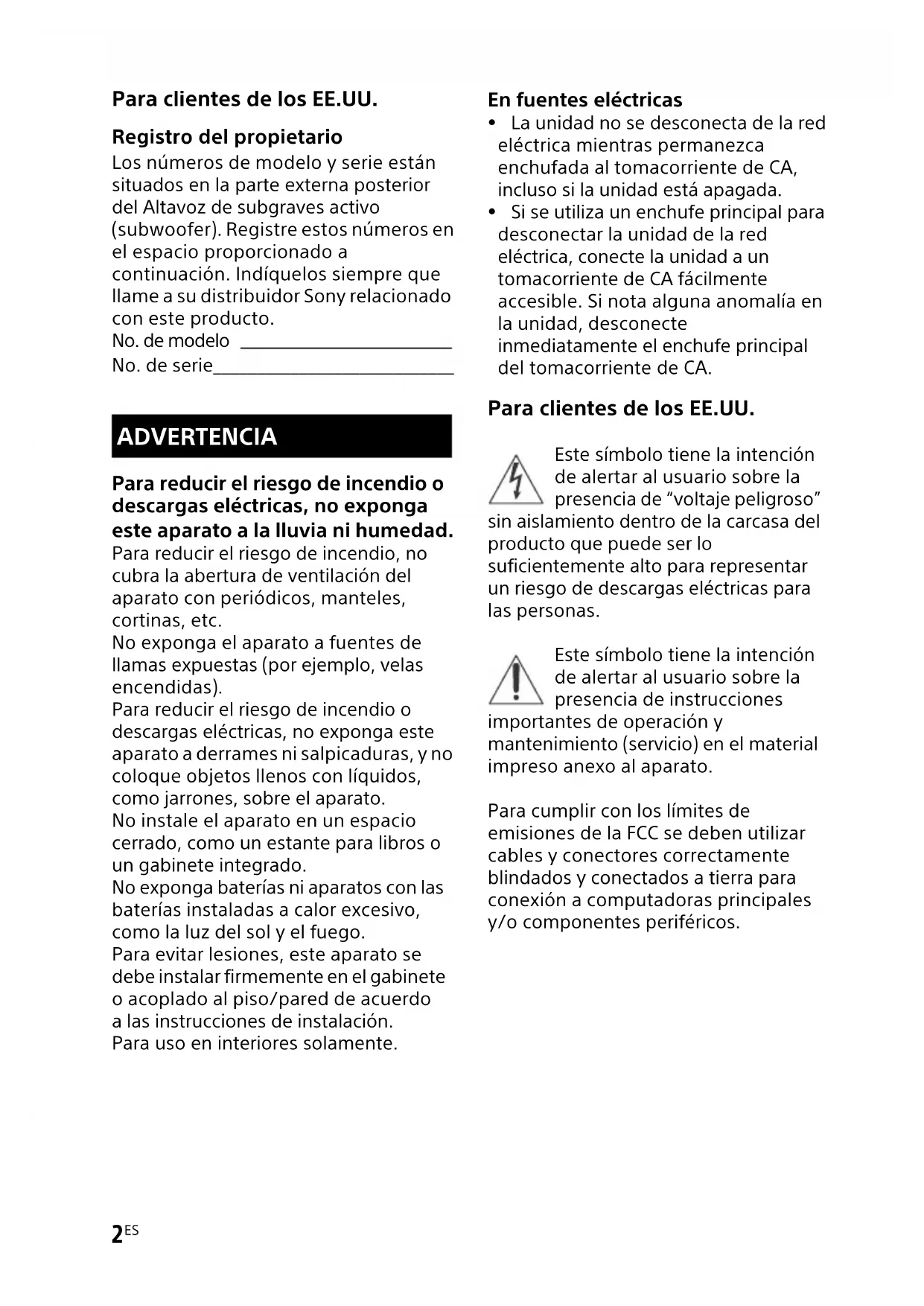 Los nombres de modelos y série está situados en la parte externa posterior del Altavoz de subgraves activo (subwoofer). Registre these nombres en el espacio proportionsado a continuación. Indíquelos siempre que llame a su distribuidor Sony relacionado con este producto. No. de modelos No. de série
